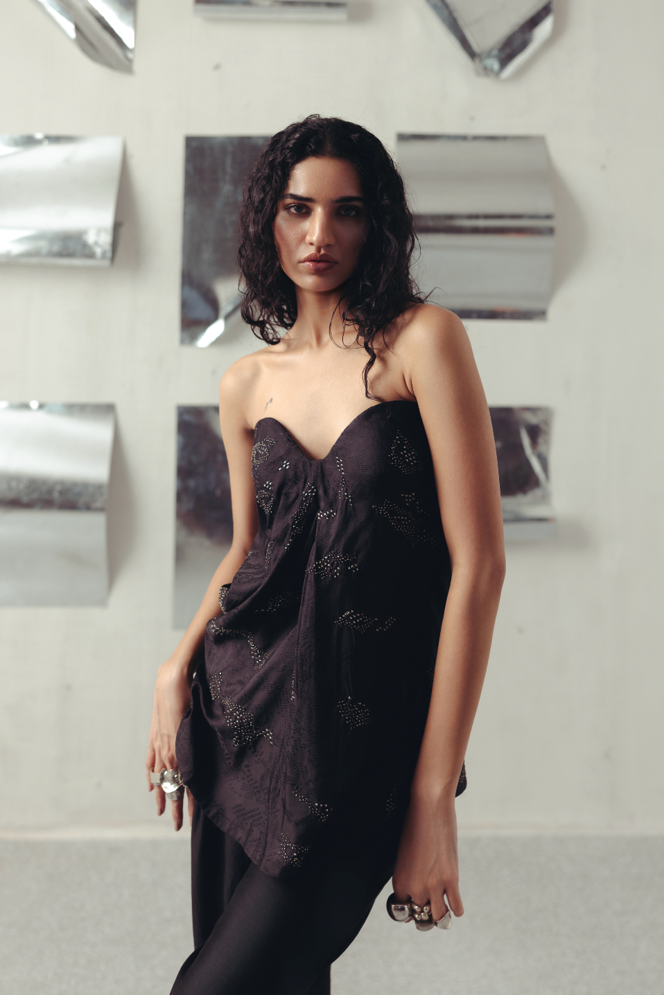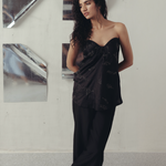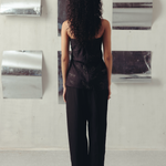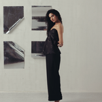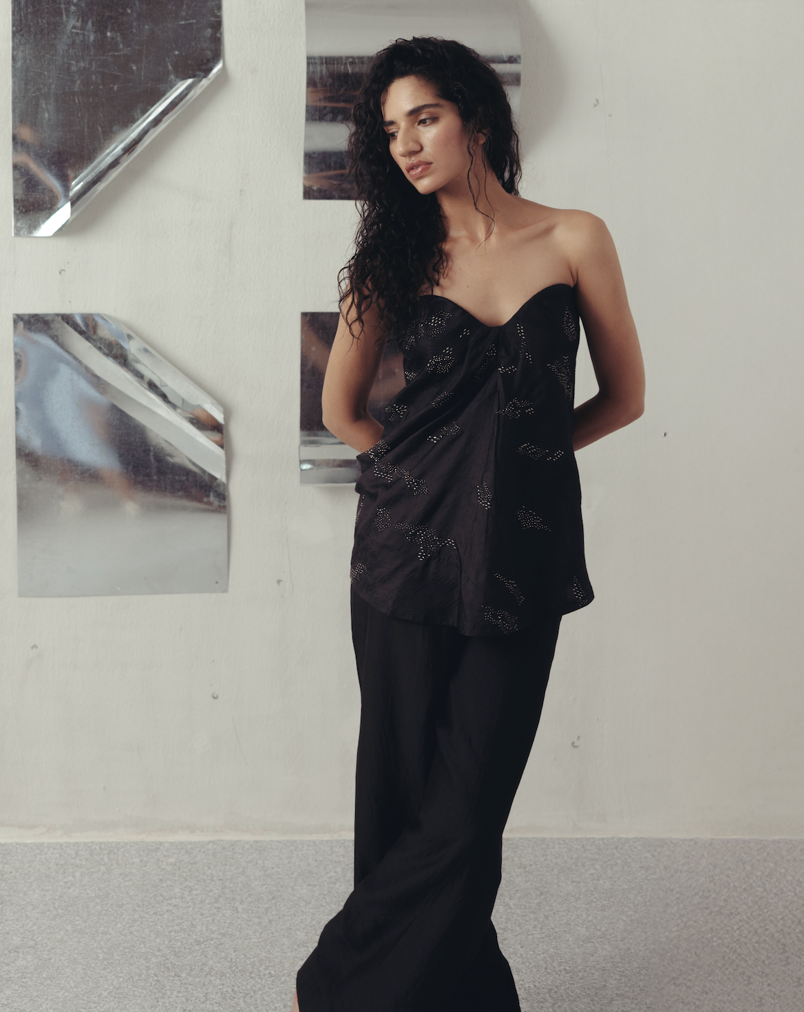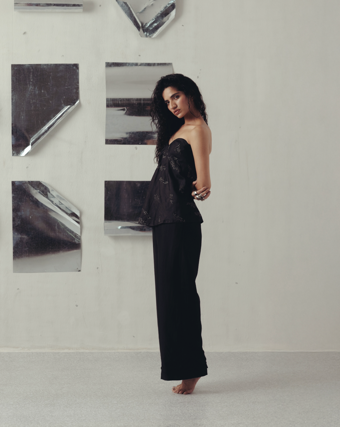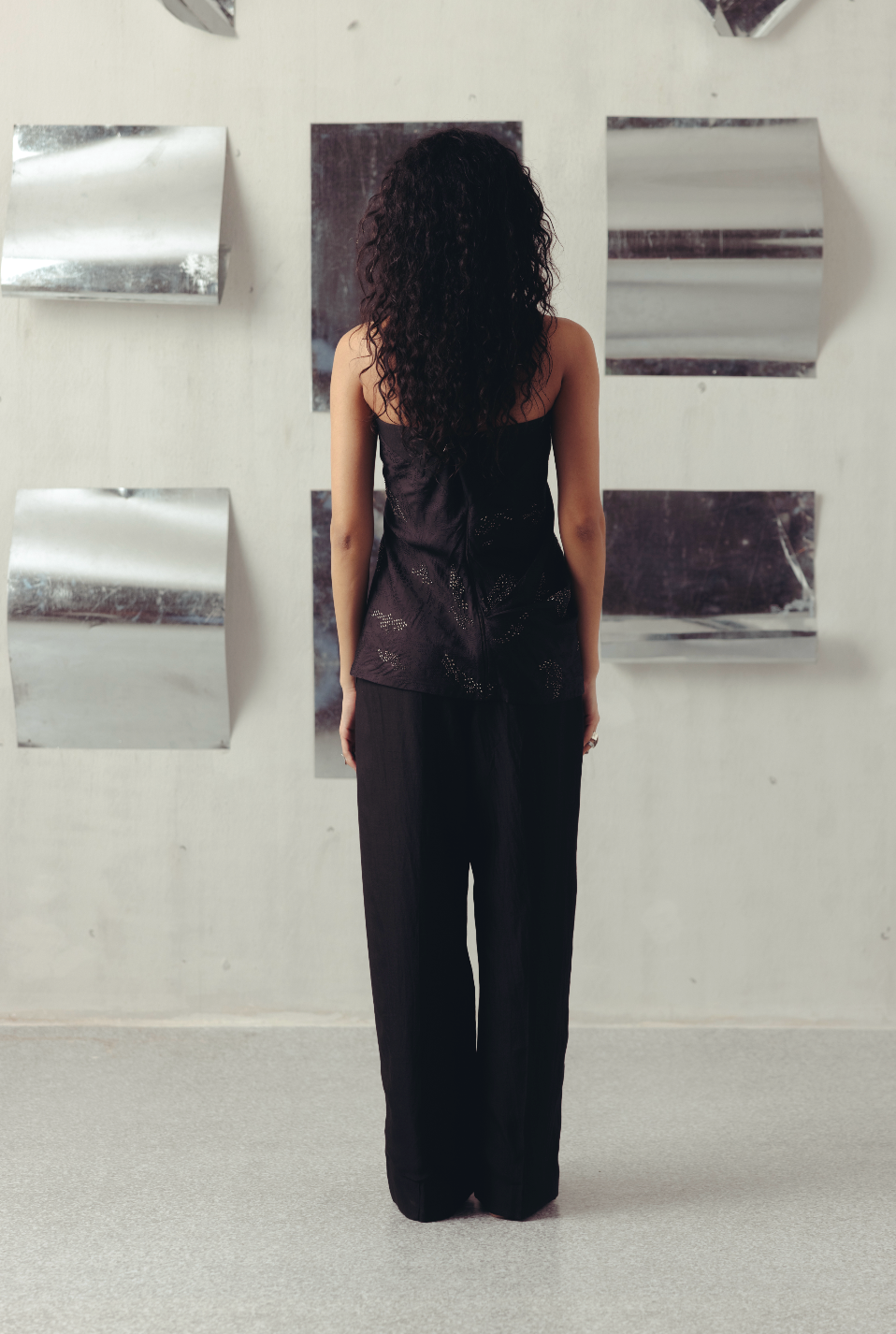This ensemble pairs a hand-embroidered, tanchoi handwoven corset with flowy wide-leg pants. The rich craftsmanship of the fabric and embroidery meets a well constructed, sweetheart neckline corset, creating a look that is both timeless and contemporary—celebrating tradition with a modern edge.