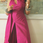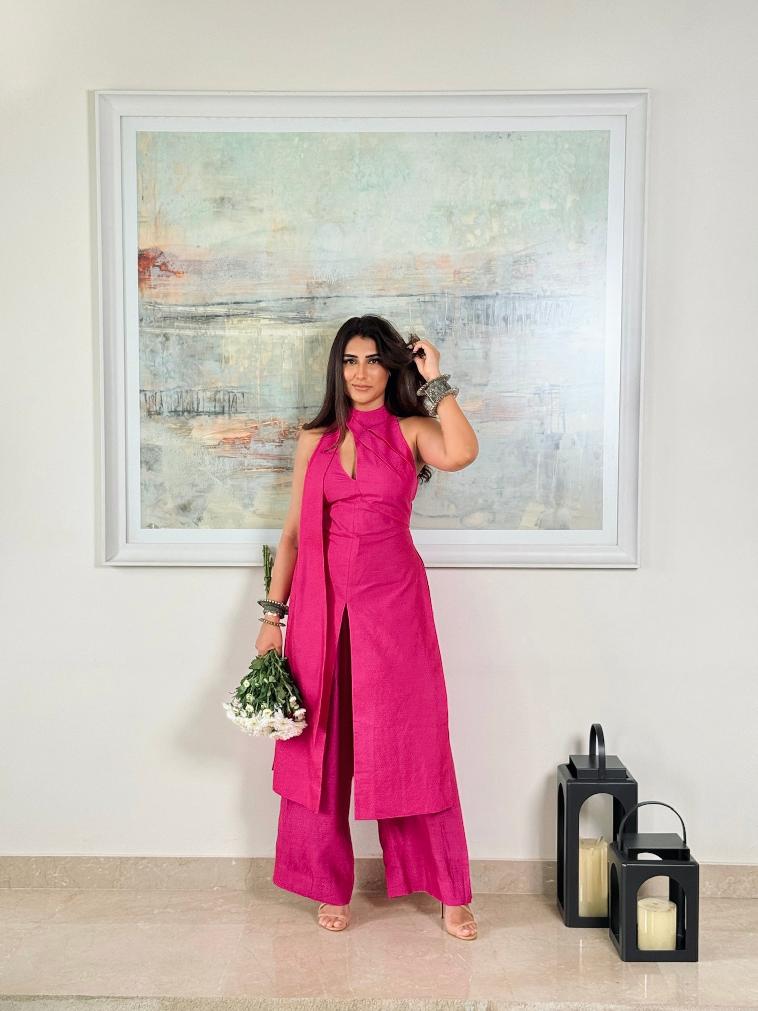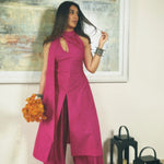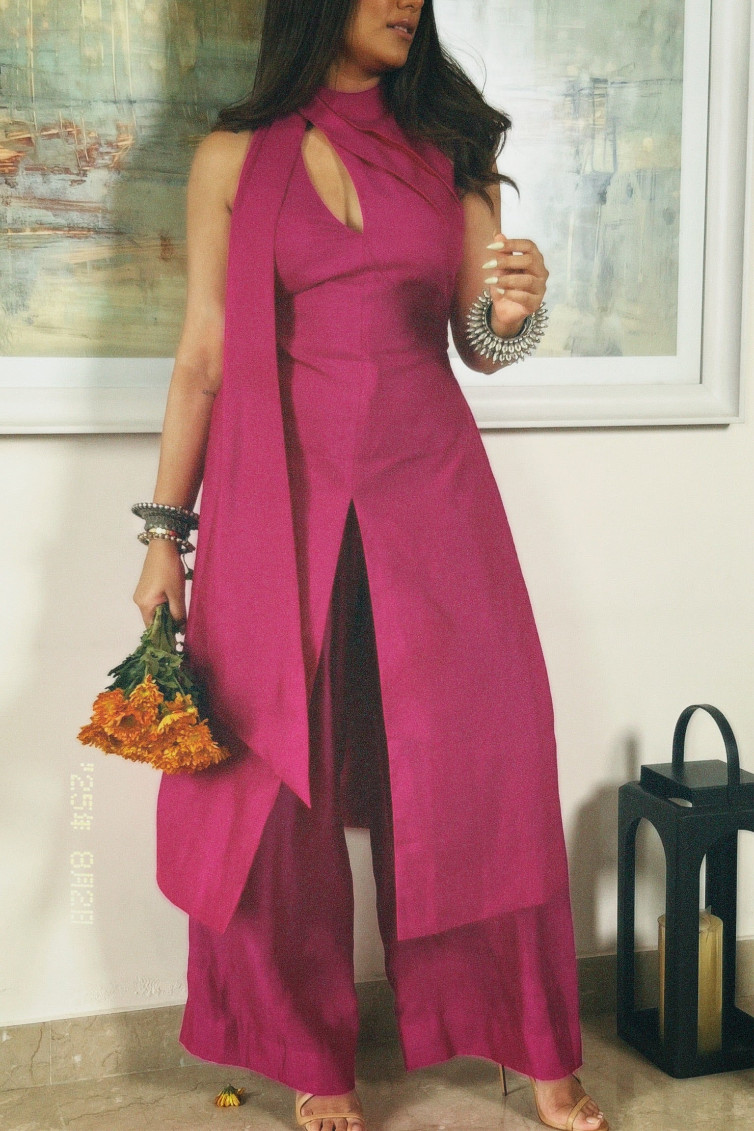 This co-ord set redefines elegance with its architectural design. The semi-turtleneck top features a sculpted neckline, complemented by a subtle chest cutout that introduces a hint of allure. Delicate pleats cascade down the silhouette, adding texture and movement, while the knee-length cut offers a balanced proportion. A soft, draped detail encircles the neck. The wide-leg pants mirror the top's refined aesthetic, offering a relaxed yet polished look. Crafted from a lightweight fabric.