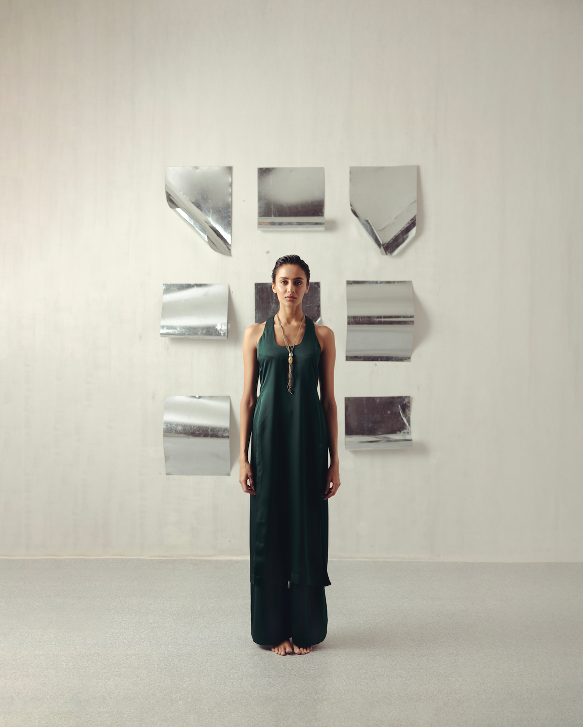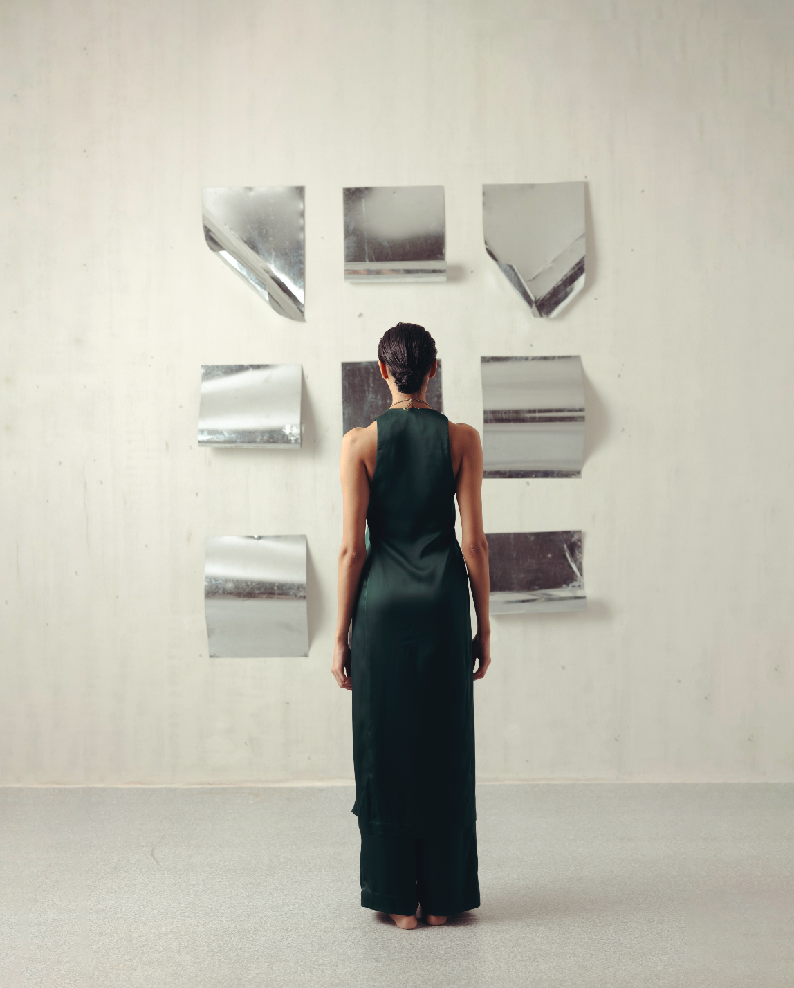 This striking co-ord set features a scoop neck long tank and straight trousers. The effortless silhouette blends modern trend with minimal style, easy to dress up or down according to the occassion.