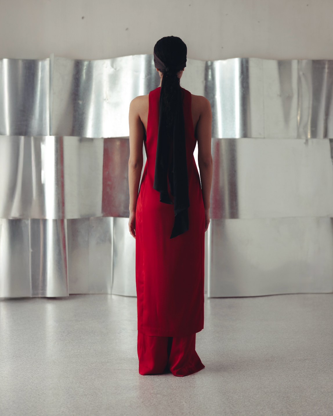 This striking co-ord set features a scoop neck long tank and straight trousers. The effortless silhouette blends modern trend with minimal style, easy to dress up or down according to the occassion.
