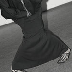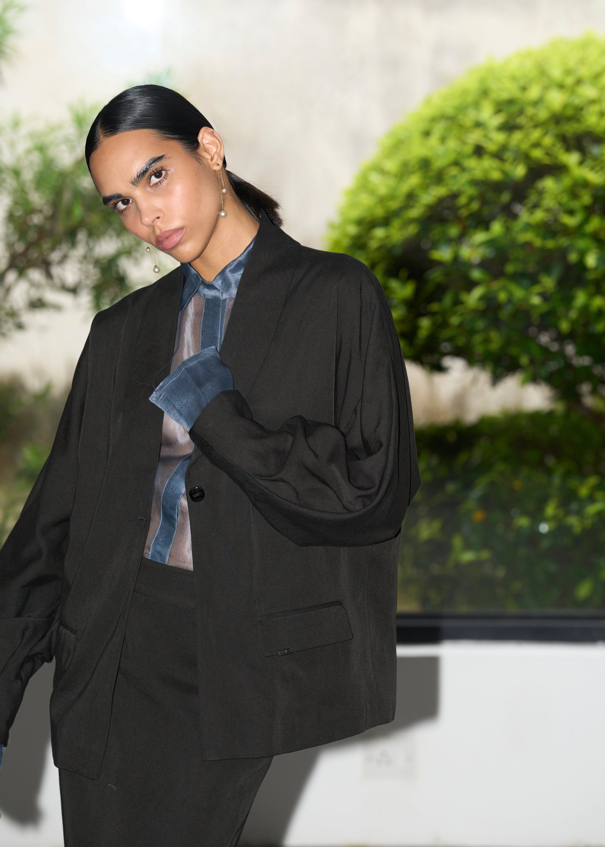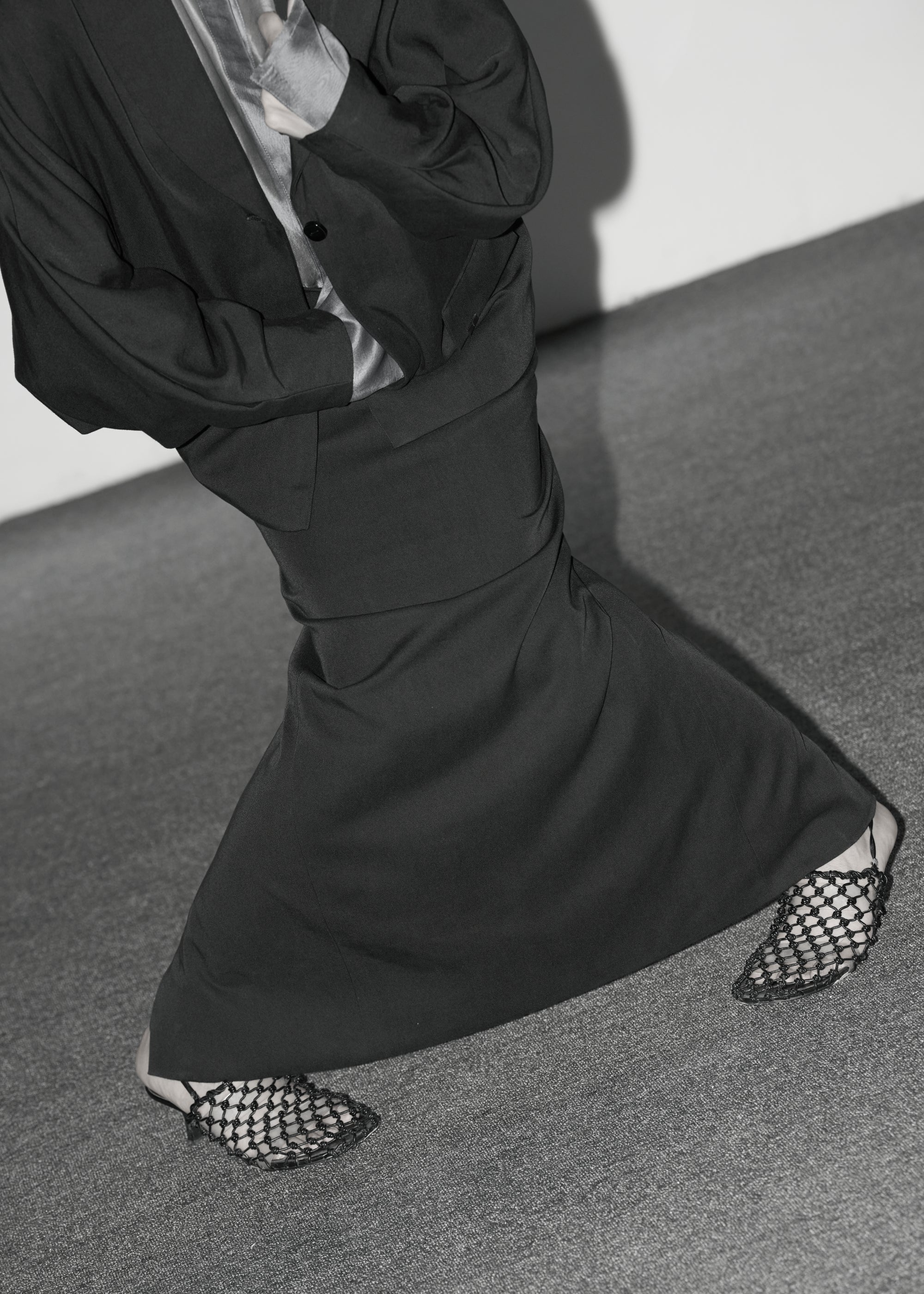 The shawl collar jacket is tailored with a classic yet contemporary silhouette. It is well-fitted at the waist with a rather relaxed drop shoulder, making it an hourglass shape. Paired with this jacket is a pencil skirt, which complements the jacket's tailored look. The skirt is sleek and form-fitting, tapering towards the knee and below, creating a streamlined silhouette. It features a high waist detail and includes a back slit.