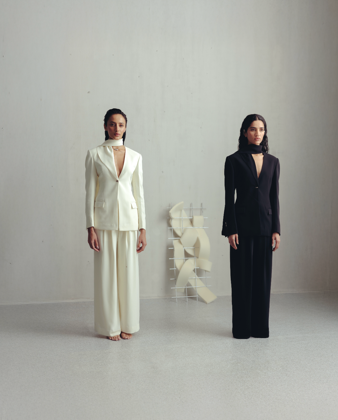 • Unique blazer featuring a scarf-like structure that wraps around the neck.
