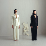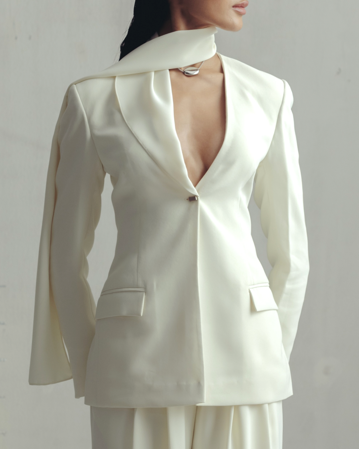 A scandi style scarf blazer with a clean single-button closure, padded shoulders and defined waist. The shawl collar that turns into a scarf balances elegance with playfulness.