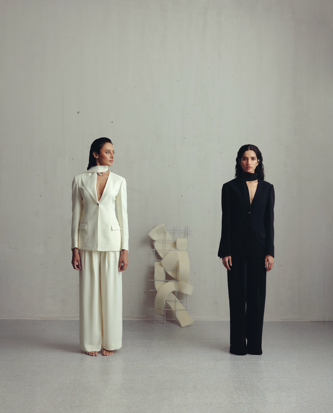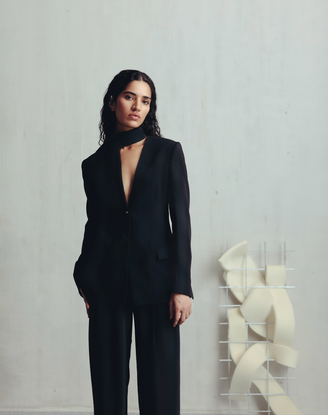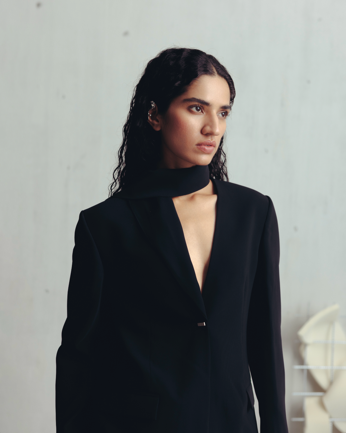 • Unique blazer featuring a scarf-like structure that wraps around the neck.