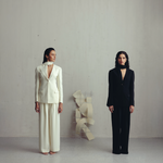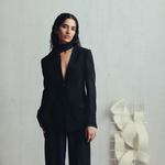 A scandi style scarf blazer with a clean single-button closure, padded shoulders and defined waist. The shawl collar that turns into a scarf balances elegance with playfulness.
