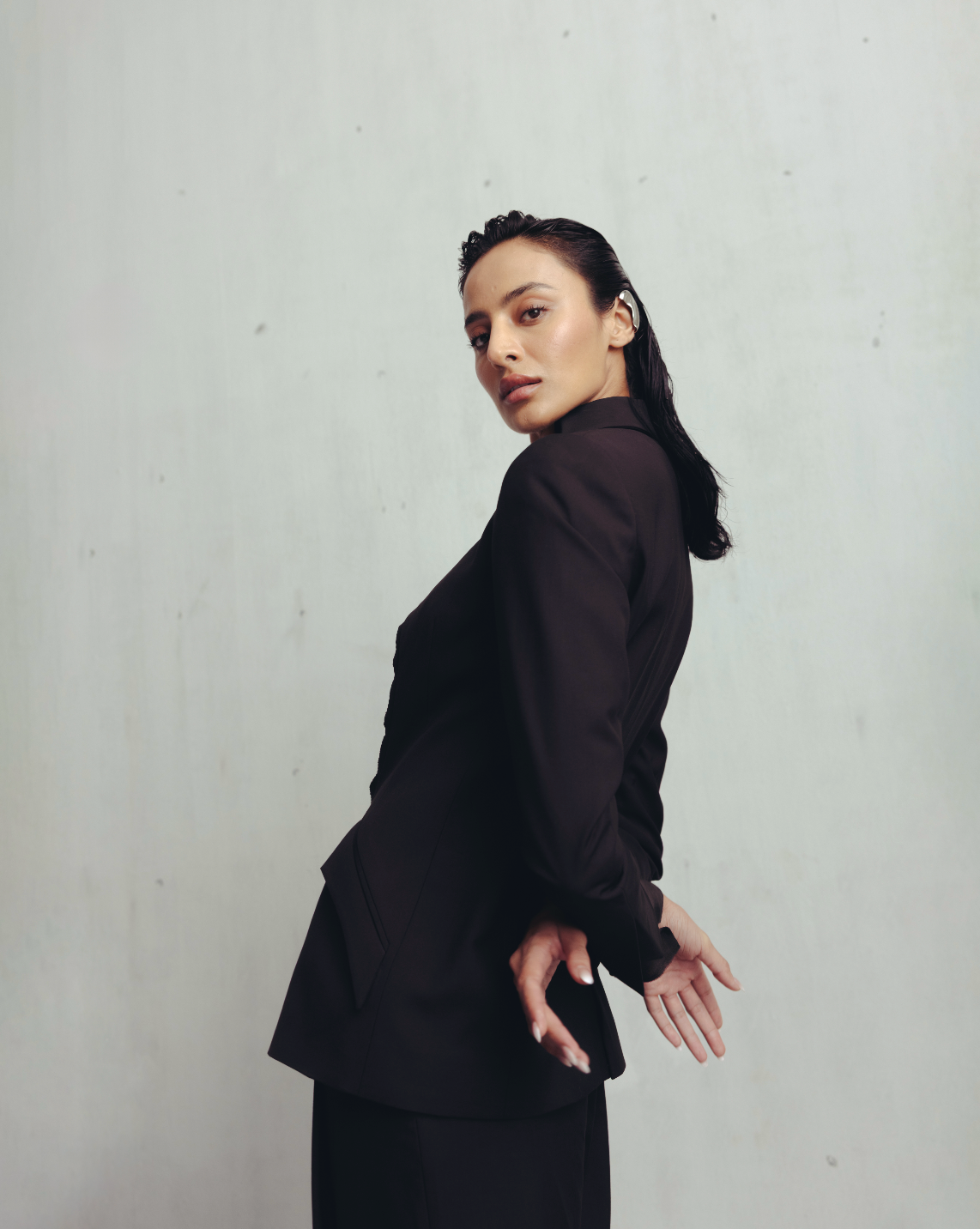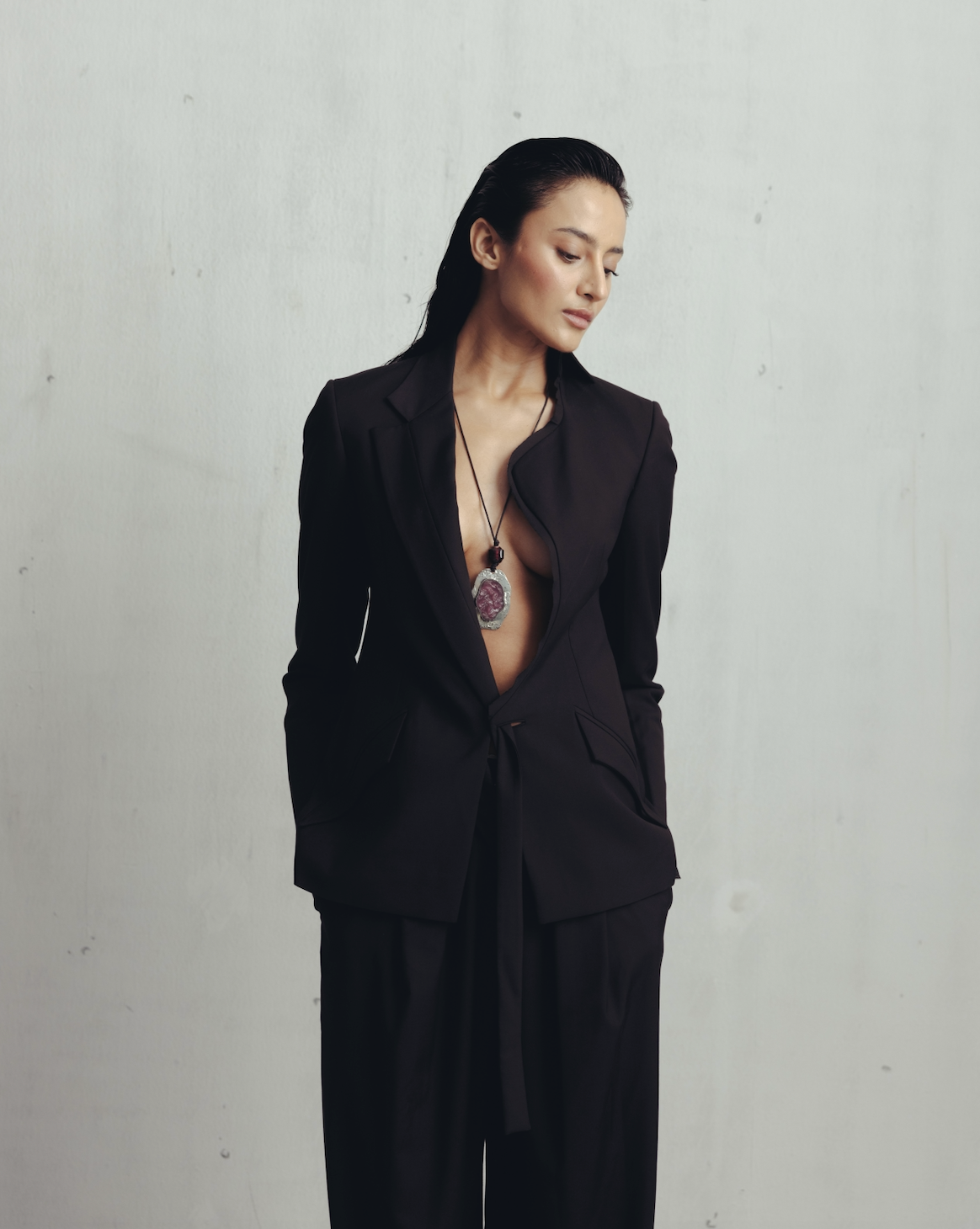 A well tailored blazer with a plunging cut-out neckline and tie-front closure, balancing structure with bold sensuality. Its a perfect blazer to wear, when you want to make a statement.