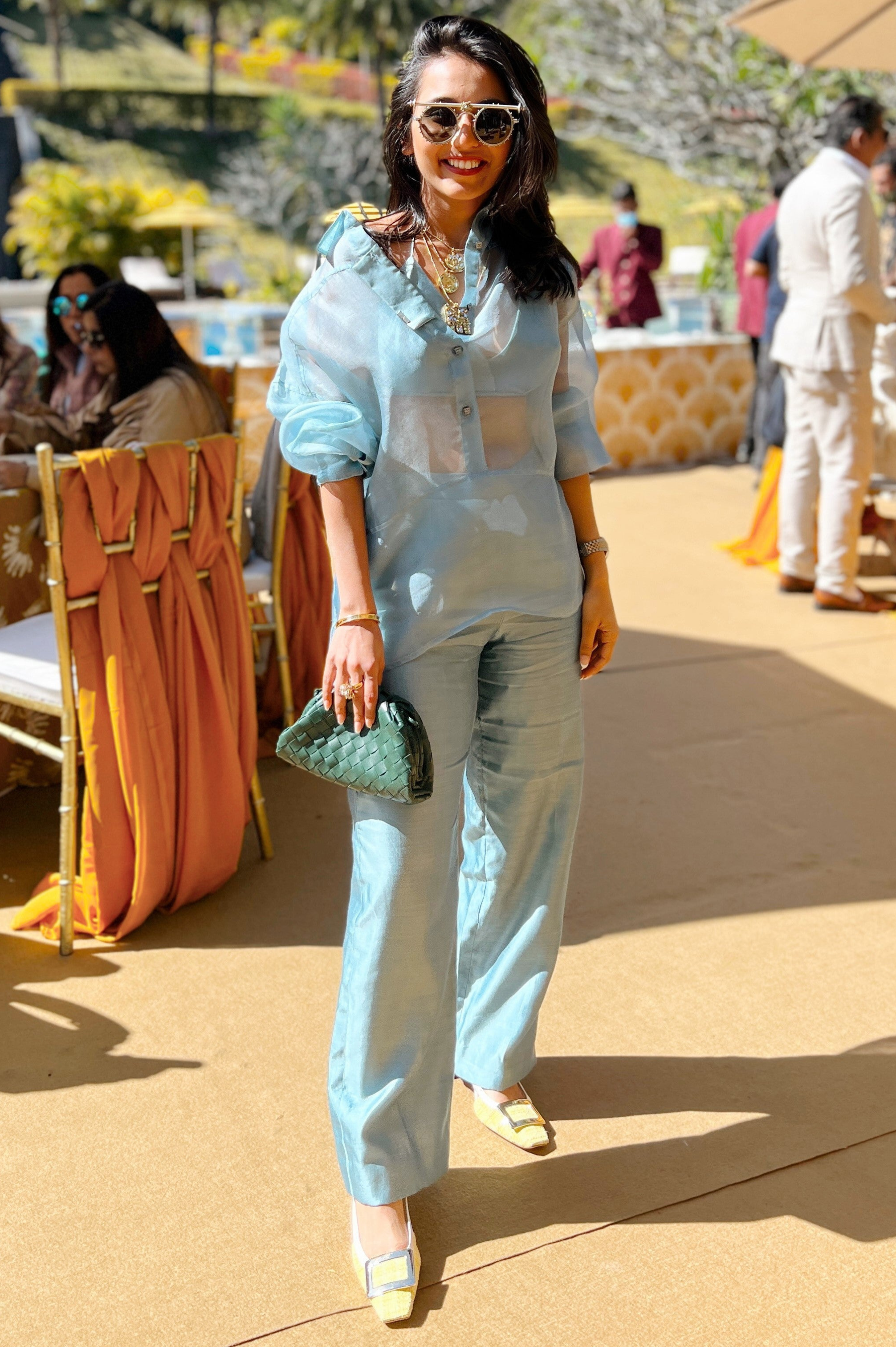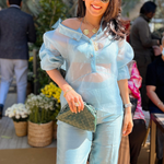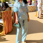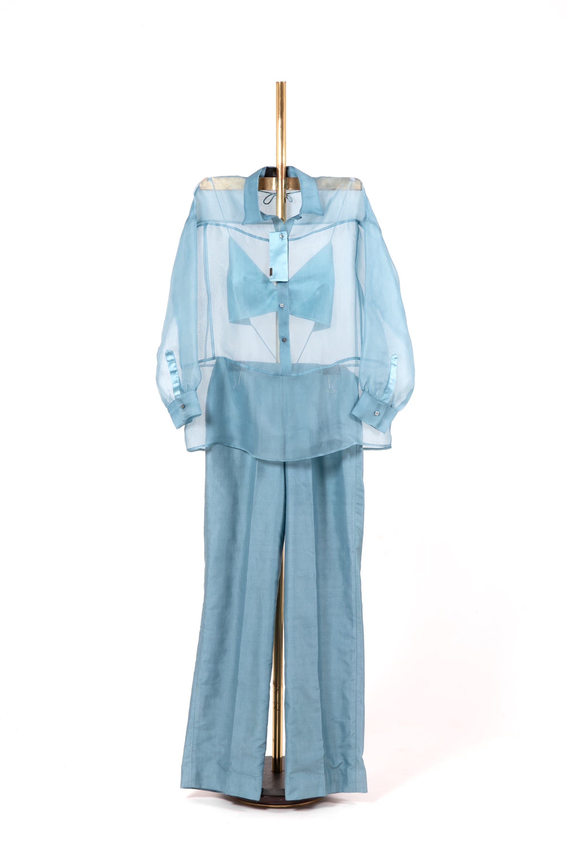 This pop colored co-ordinate set is a great outfit for a night out with friends or an event. The multiseam, oversize organza shirt with straight leg silk trousers & a halter bralette make it young & glamorous. Recommend pairing it up with contrast colored strappy heels & a singular piece of chunky jewellery.