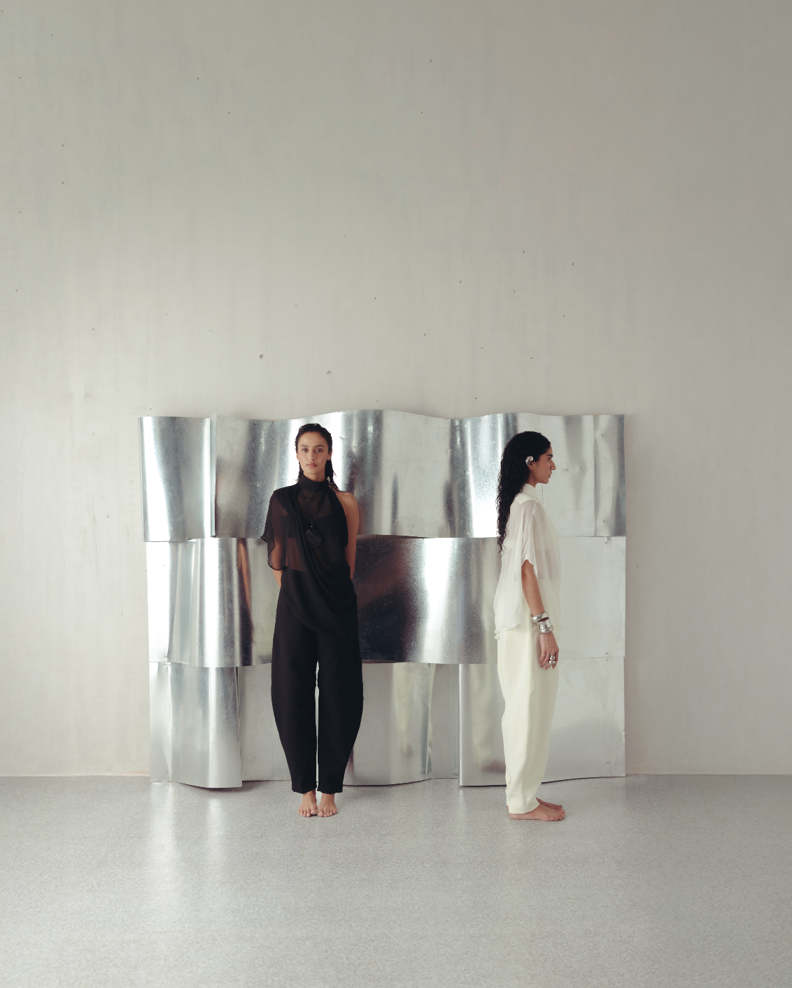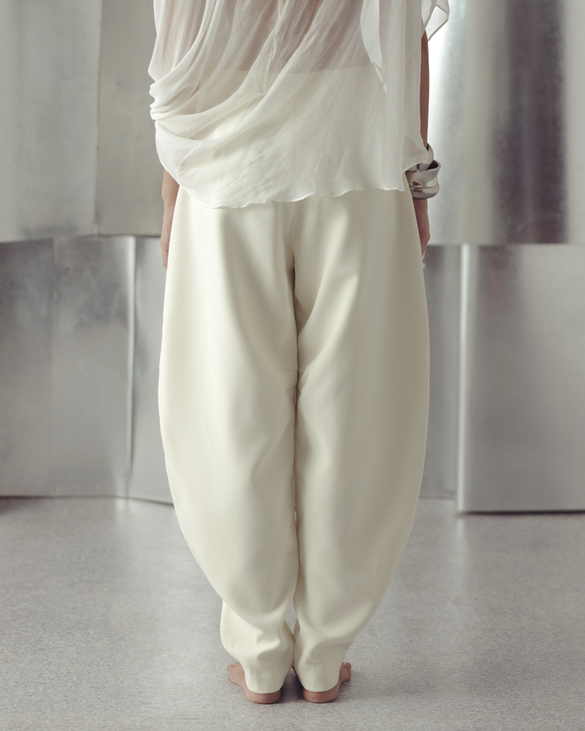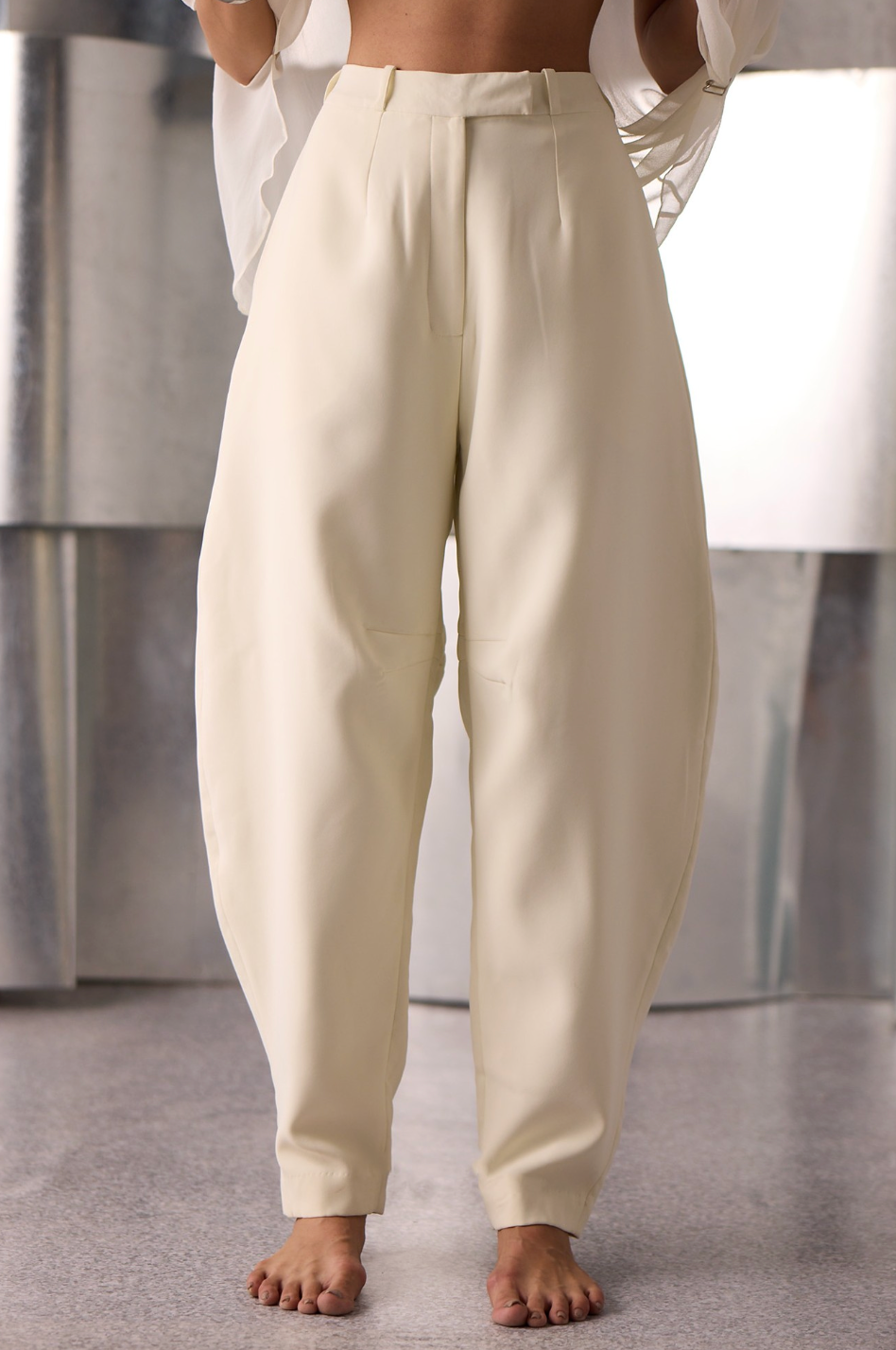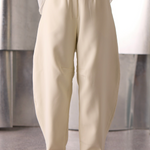 These barrel pants hold a voluminous silhouette that lightly taper at the ankles. Relaxed yet sculptural, they bring a modern edge to the look.