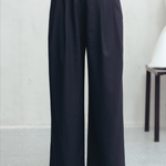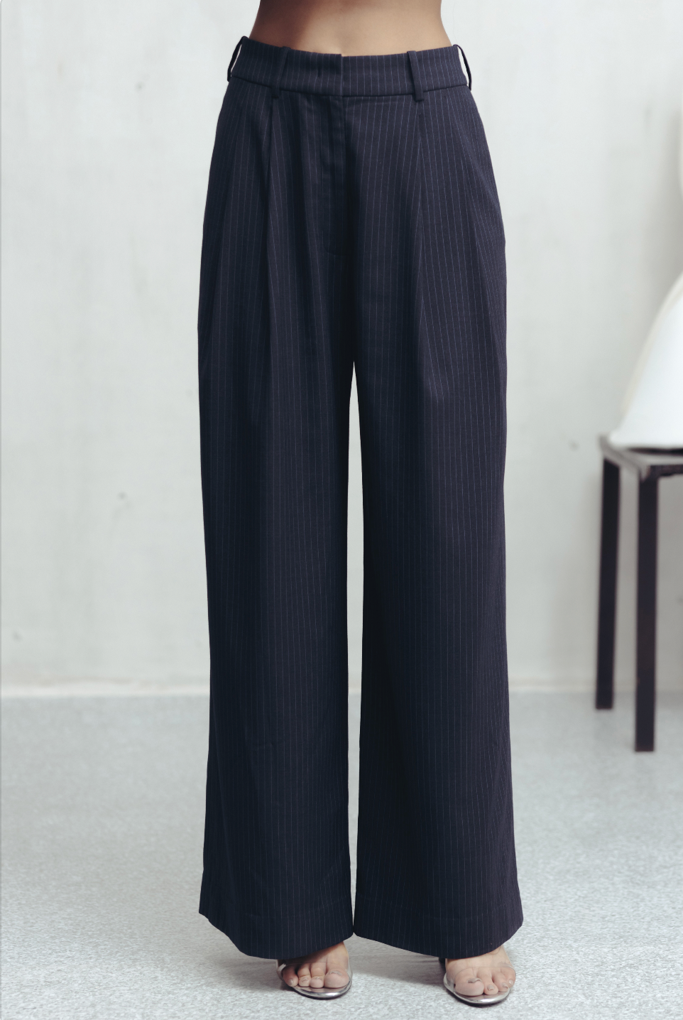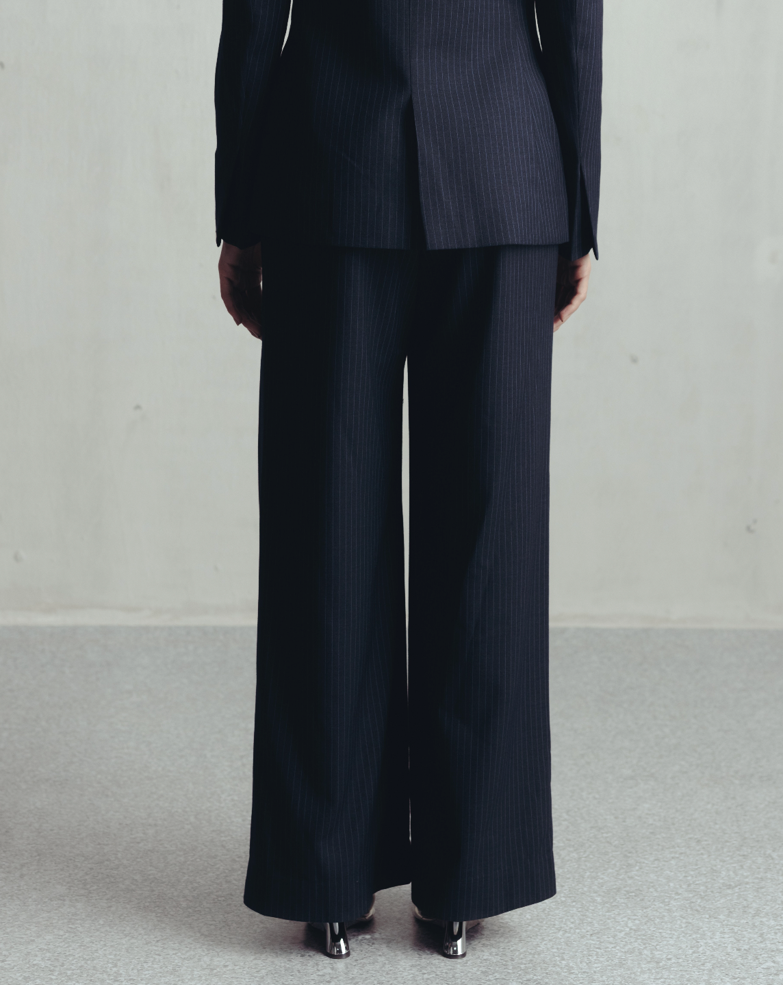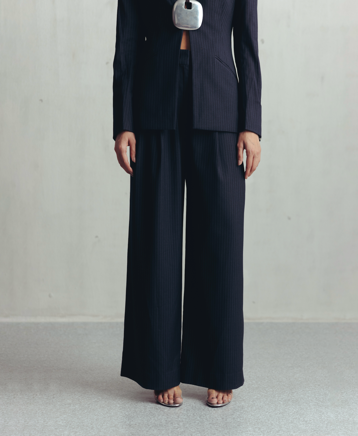 The trousers, crafted in the pinstripe suiting fabric, fall into a wide-leg shape that balances structure with fluidity, creating length and effortless movement.