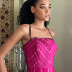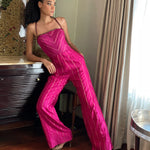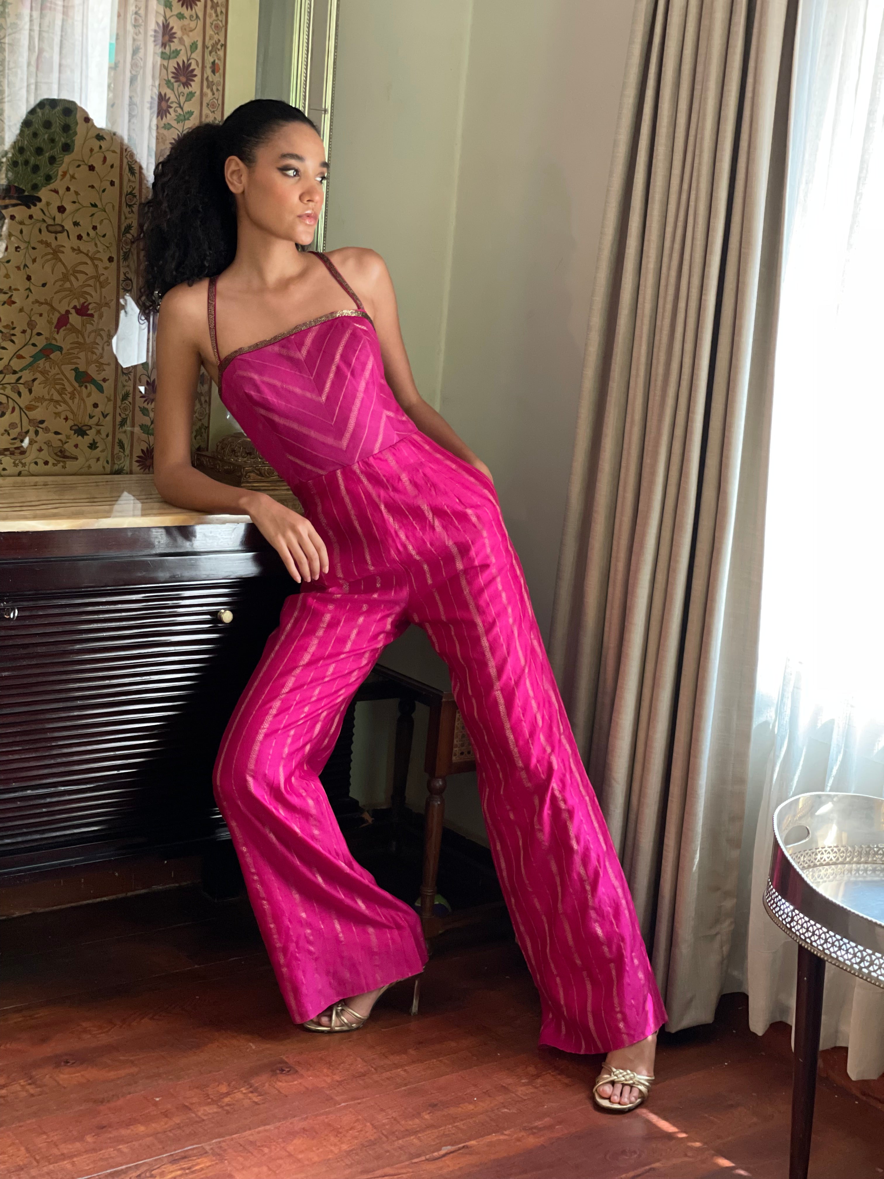 This Berry woven silk jumpsuit is a classic piece that you cannot go wrong with. The gold stripes keeps it formal for events/ dinners. Recommend pairing this look with white gold earrings and classic pumps.