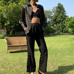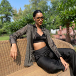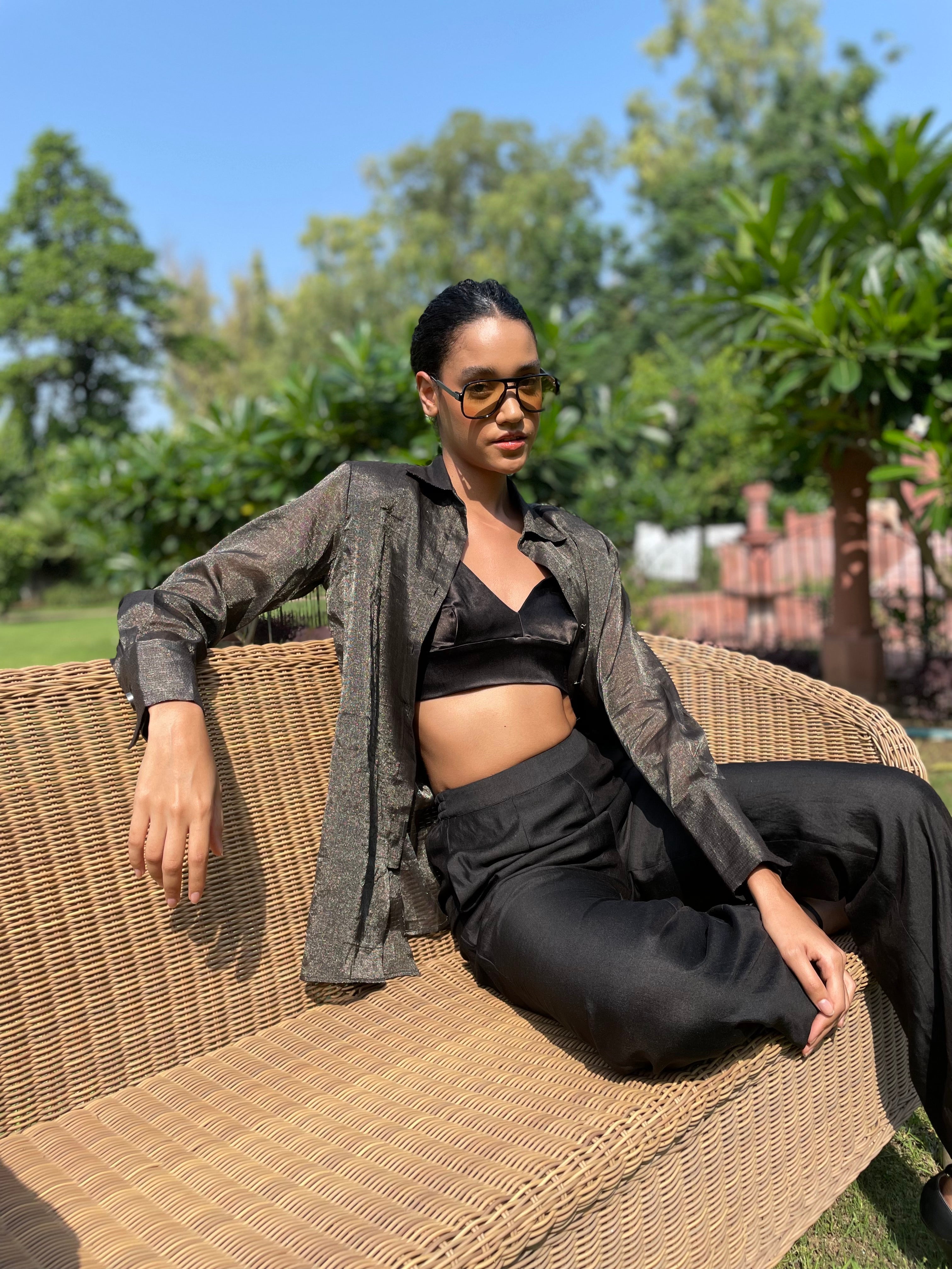 This breezy outfit is the perfect set for the summer. the subtle shine in the tissue shirt makes it formal enough to carry this from desk to dinner. recommend pairing it with pop colored strappy heels & bold sunglasses.