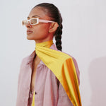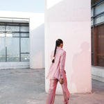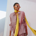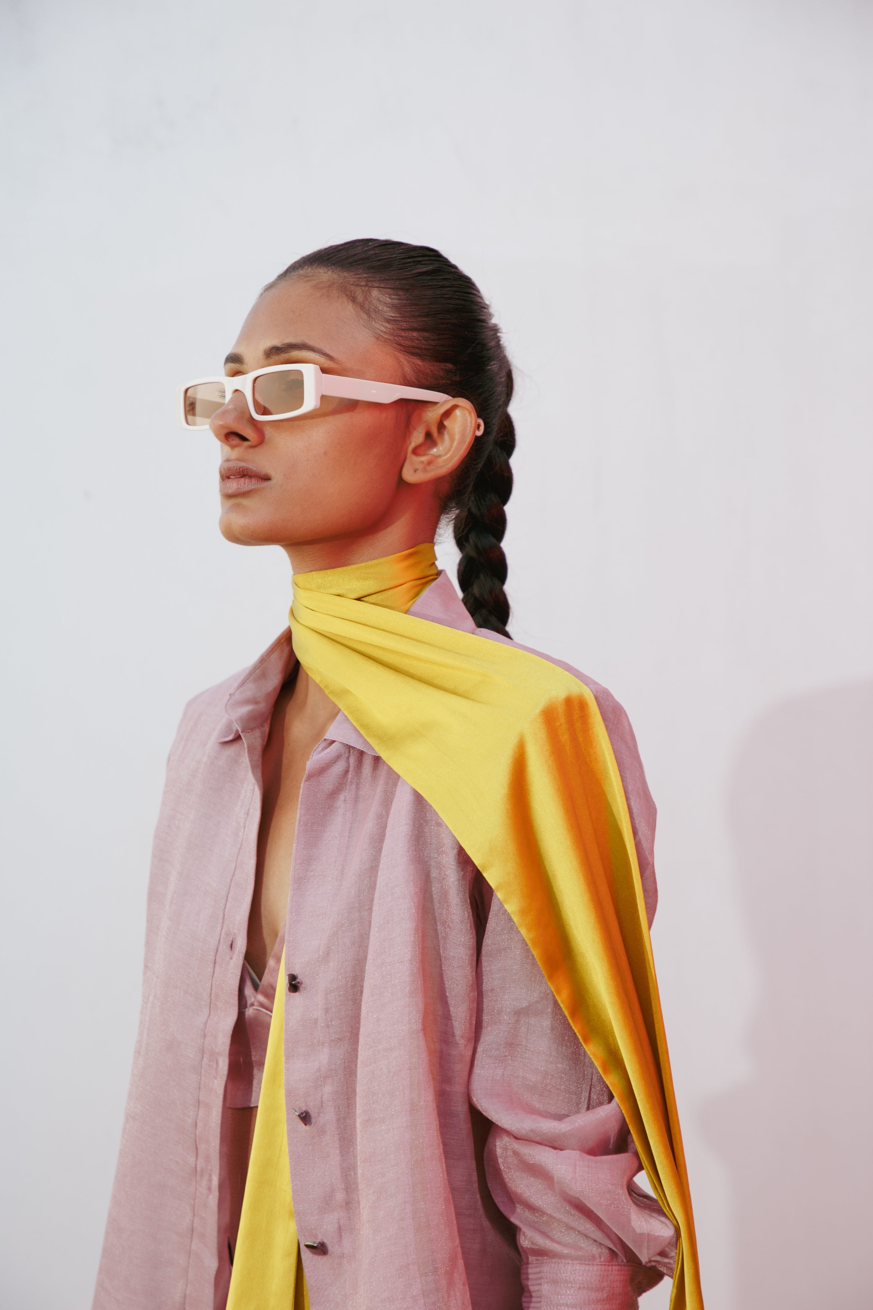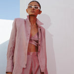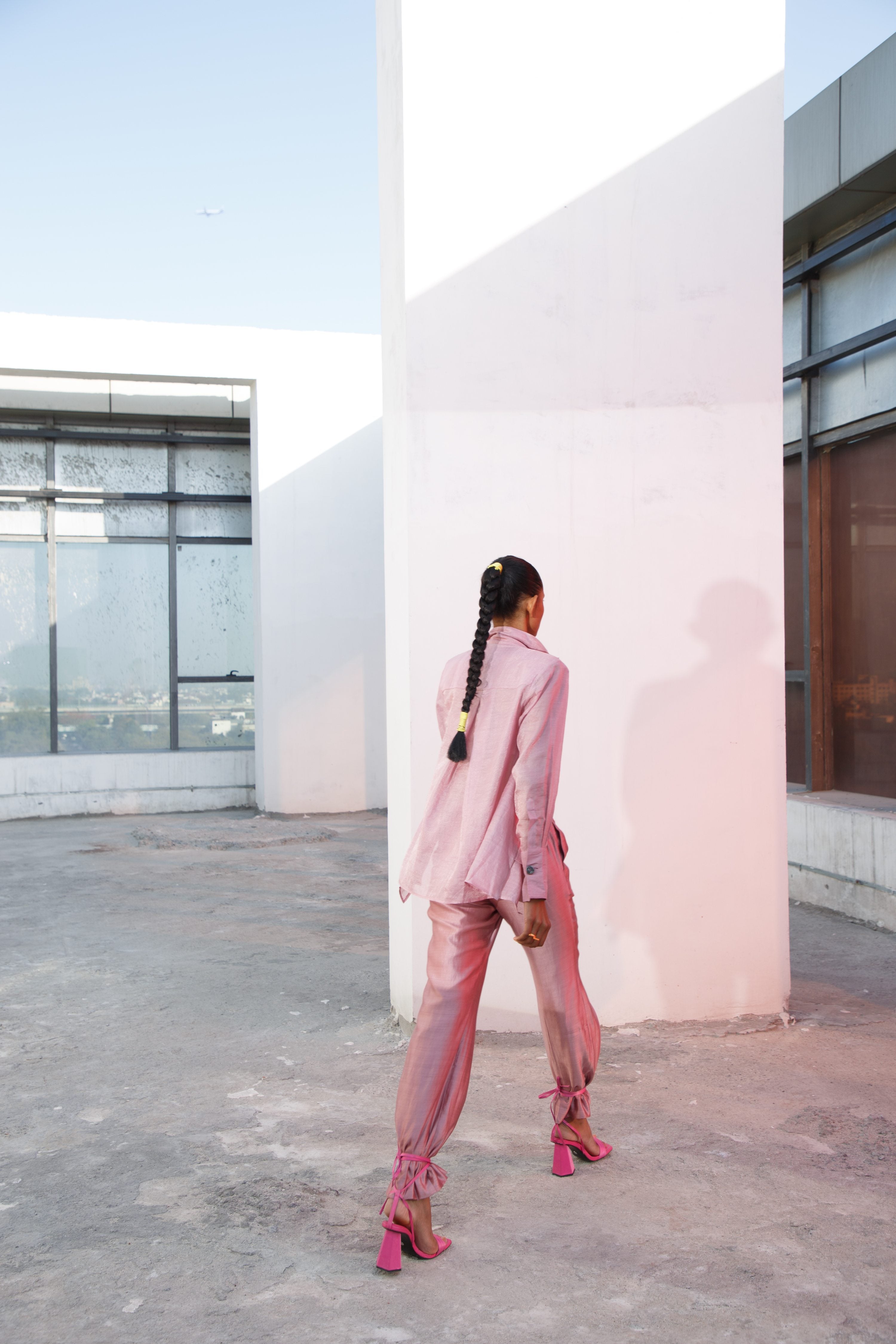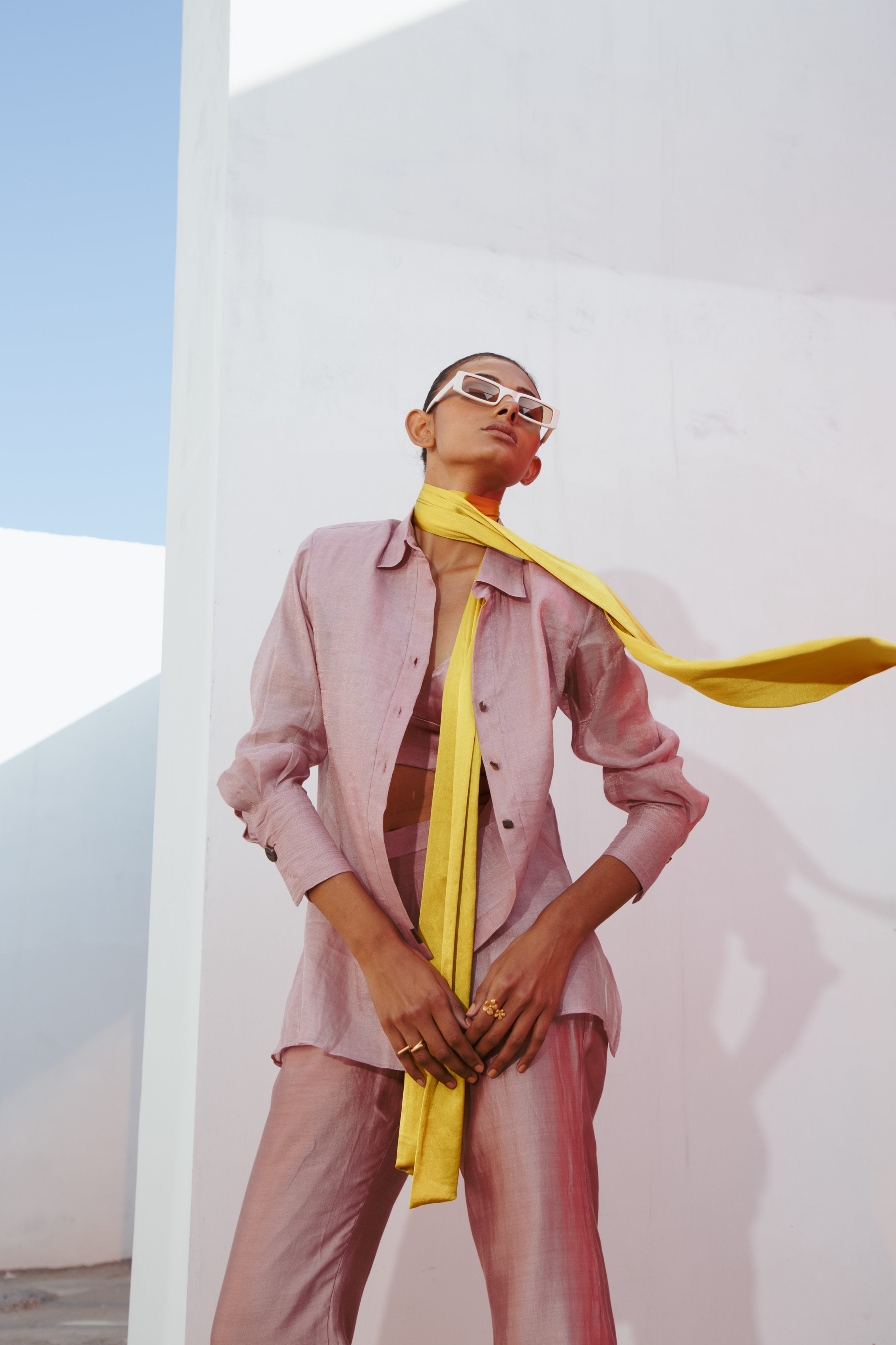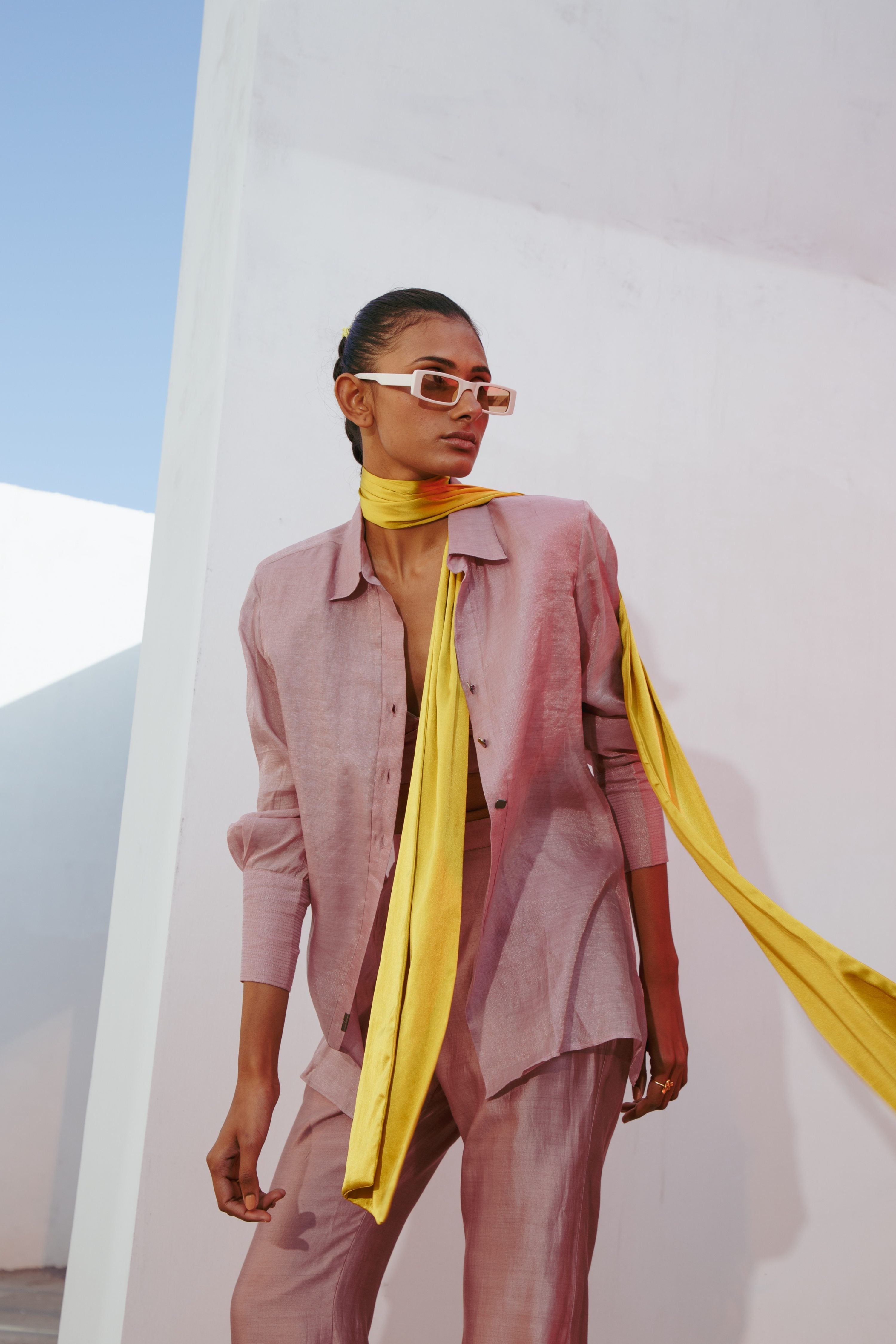 This breezy outfit is the perfect set for the summer. the subtle shine in the tissue shirt makes it formal enough to carry this from desk to dinner. recommend pairing it with pop colored strappy heels & bold sunglasses.