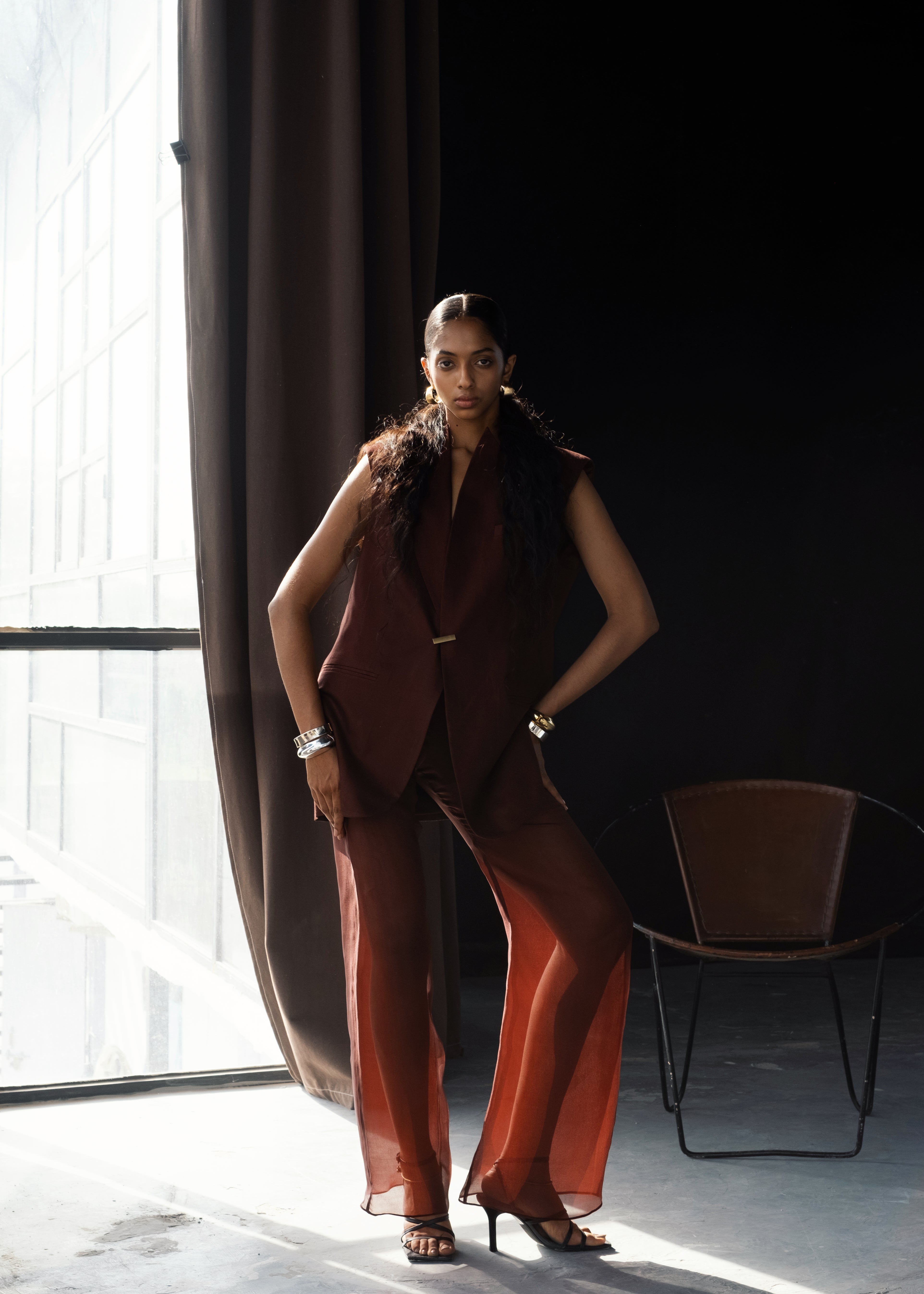 Organza Blazer & Woven Tiger Print Barrel Pants