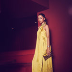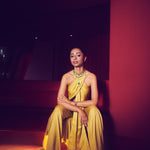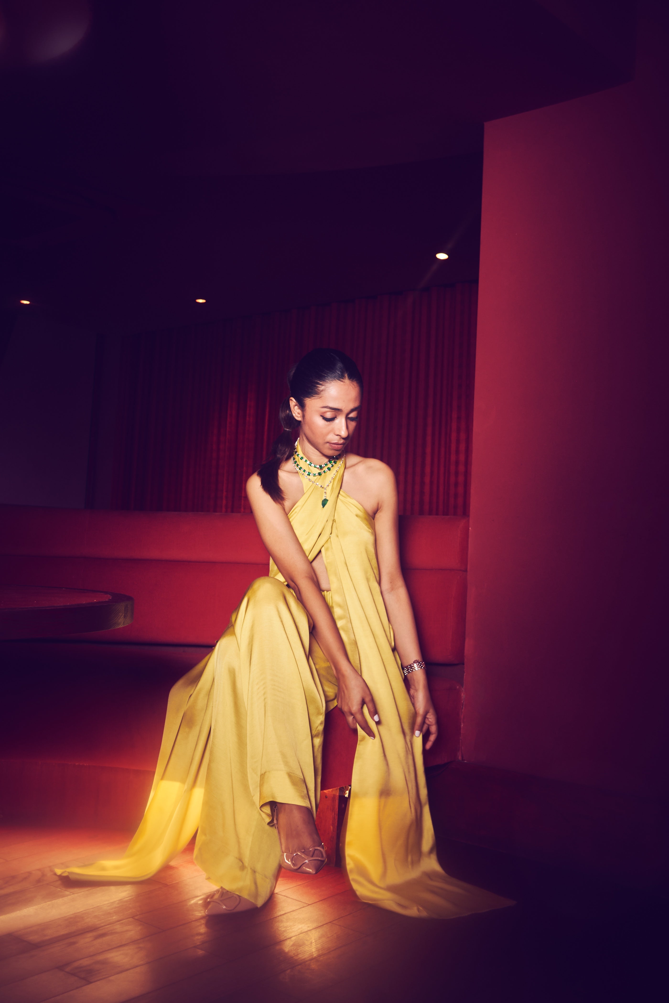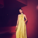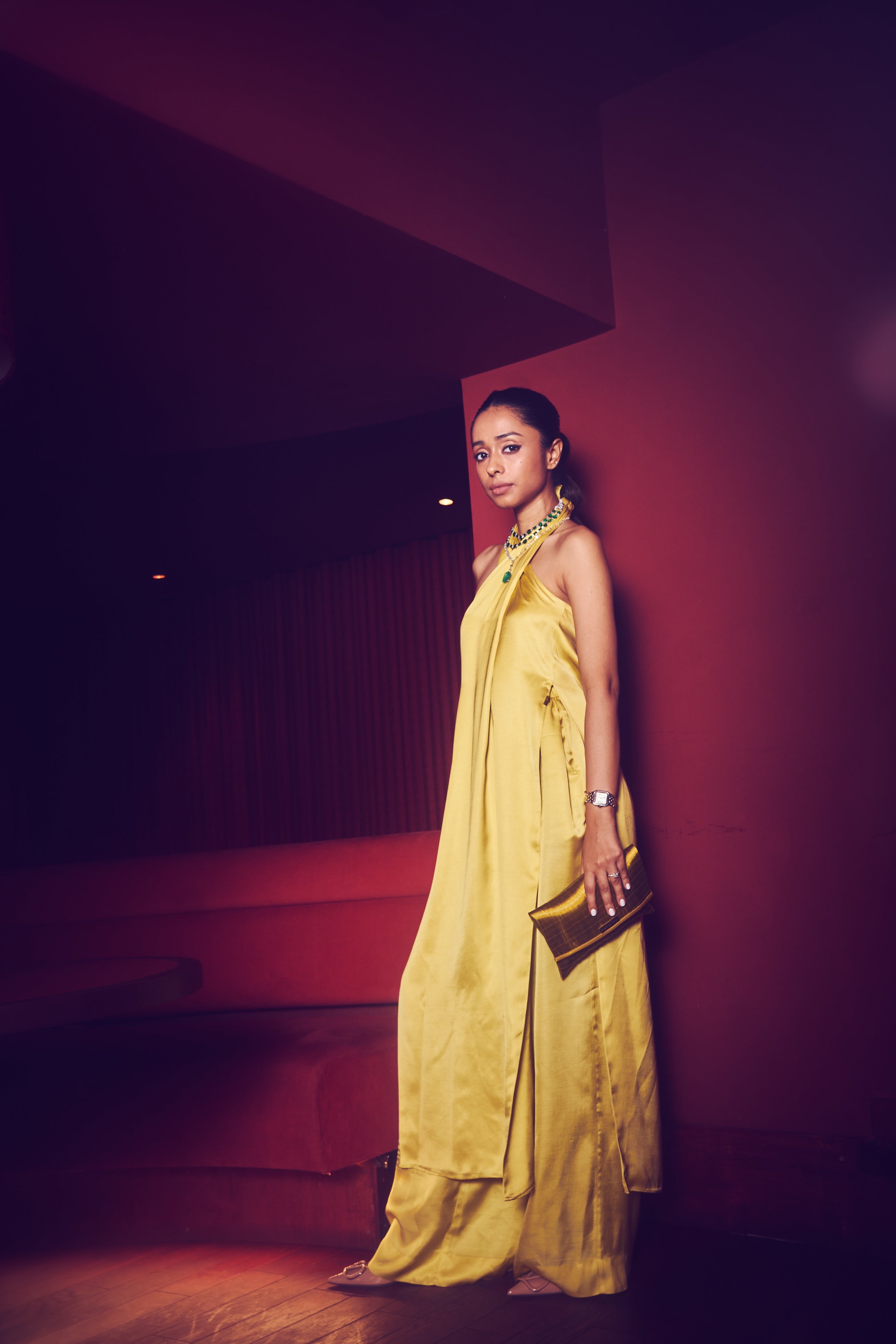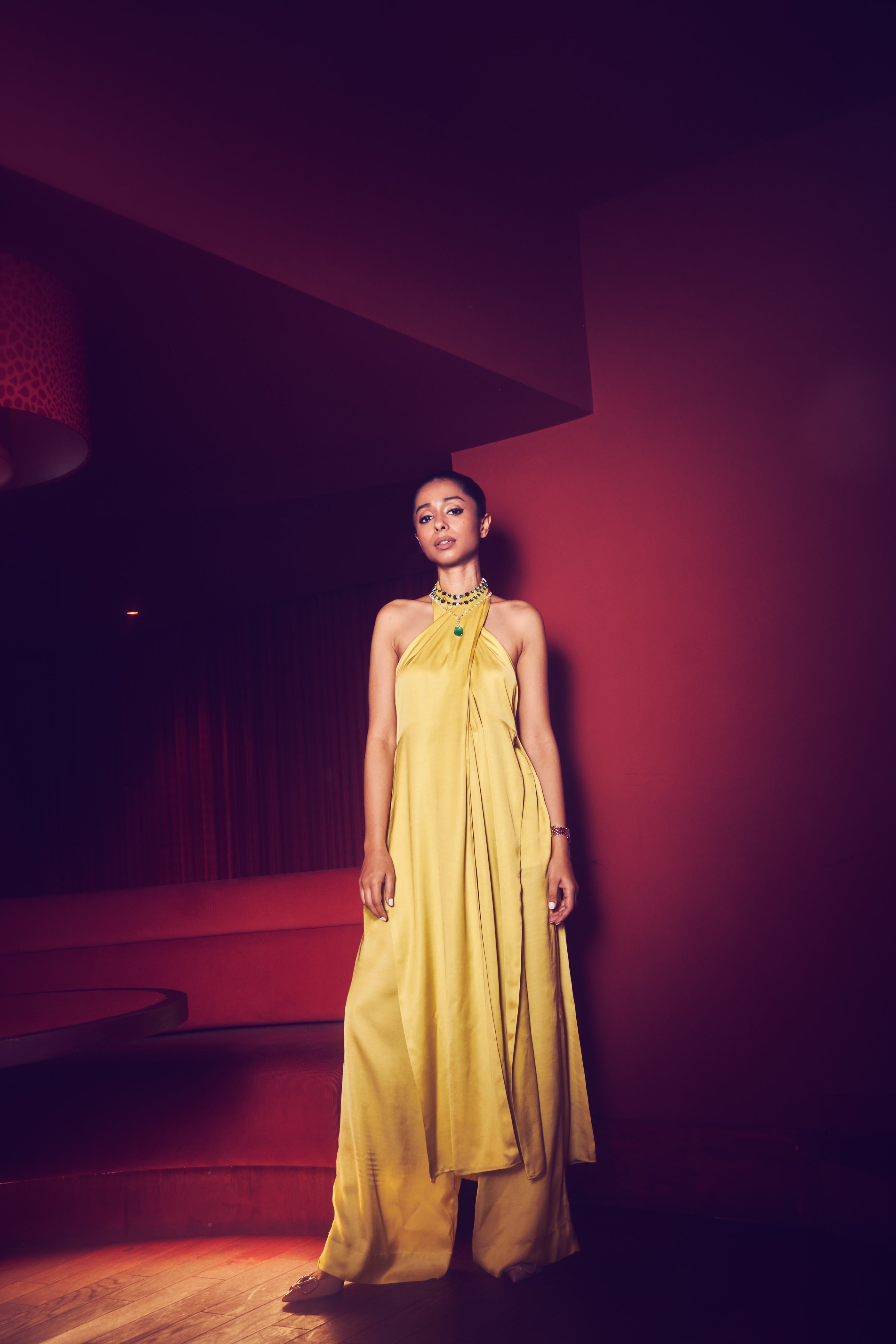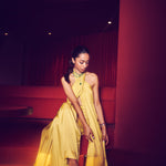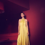 She feels young & vibrant, full of energy & possibility, as she walks around in this flowy outfit. The soft satin gently drapes around her figure, fluttering in the warm summer breeze, emboding a carefree spirit. The understated tie around neck with an exposed back makes her feel trendy & fashion forward as strolls along the beach.