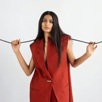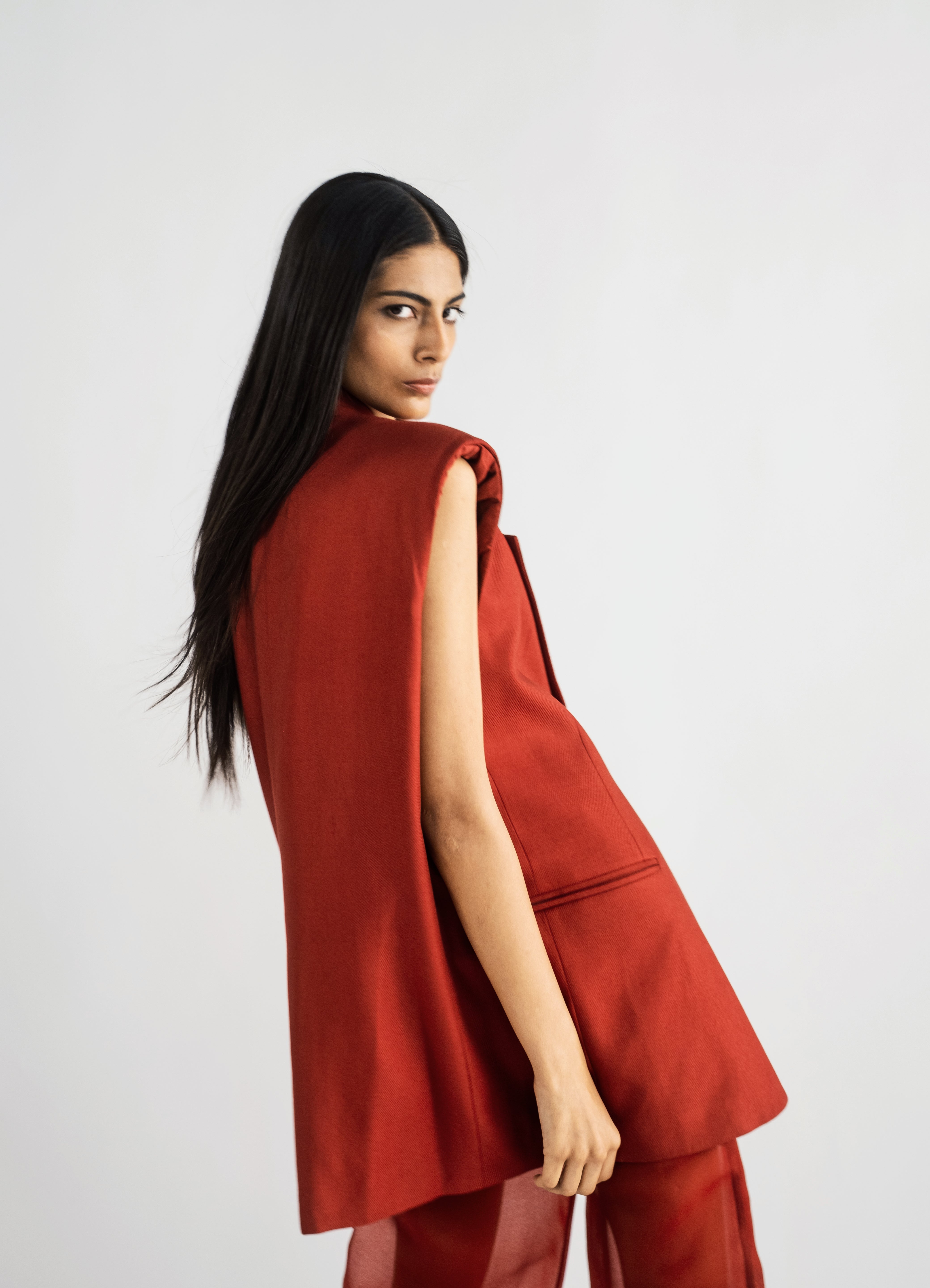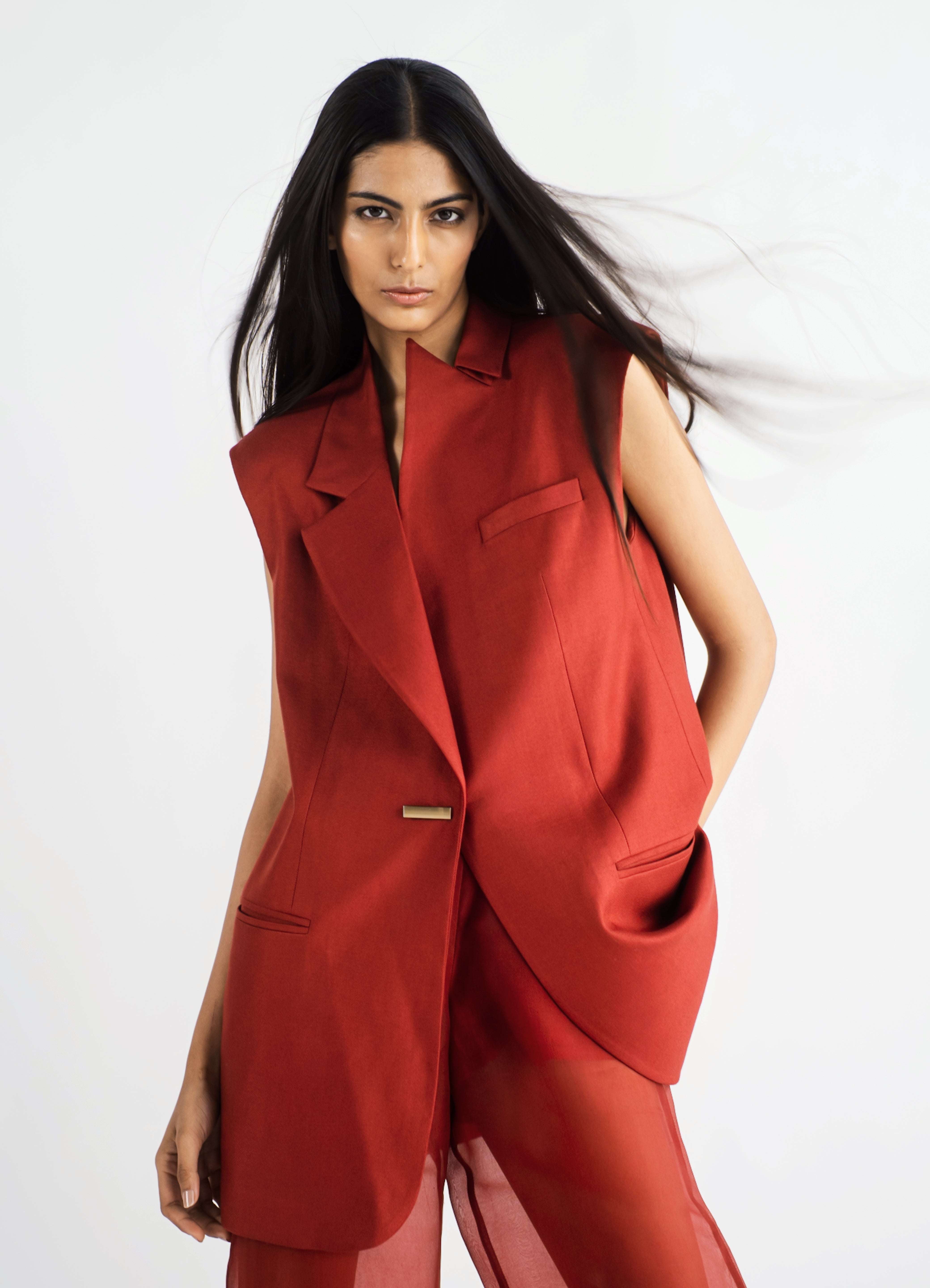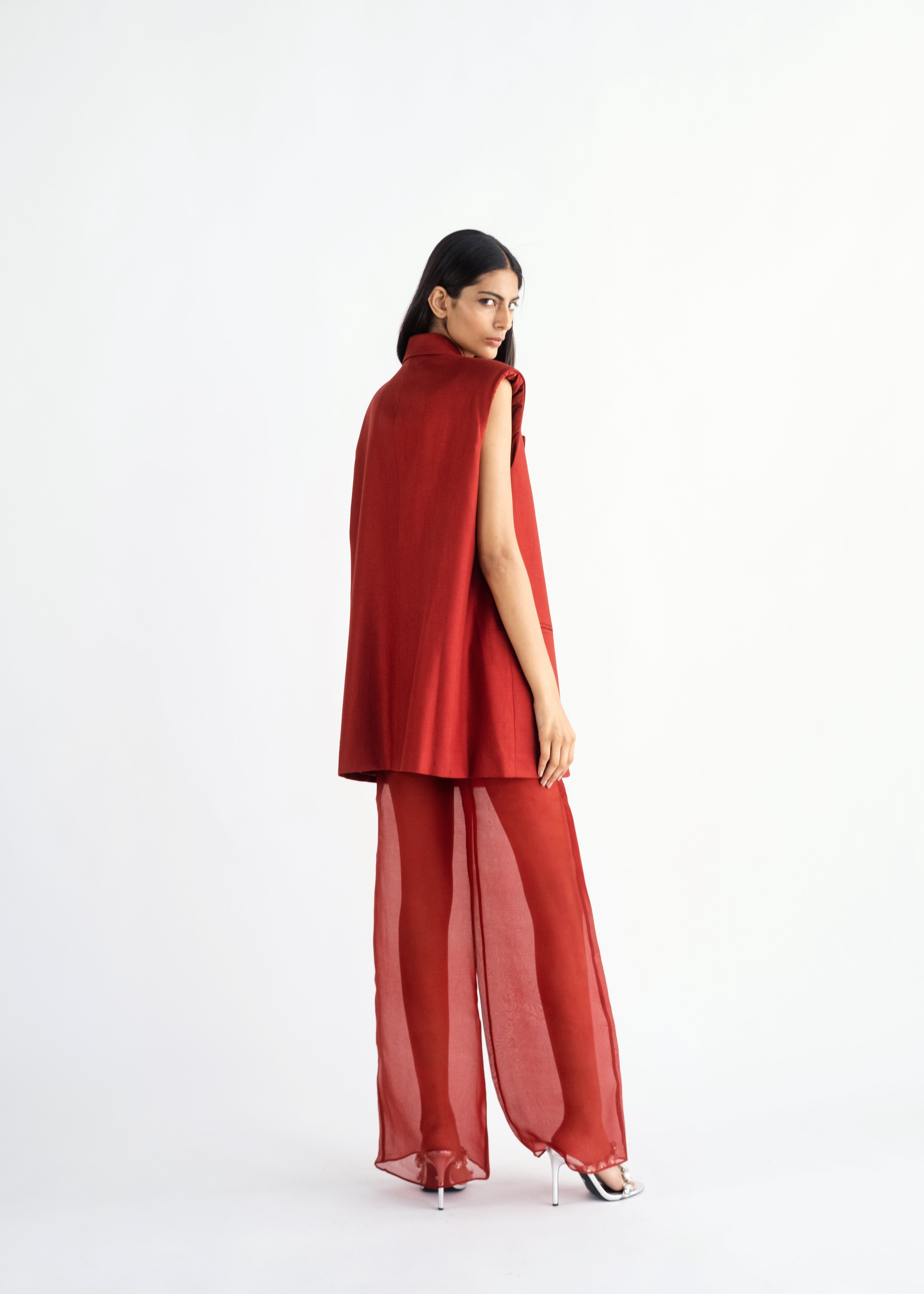 Constructed from high-quality suiting fabric, this oversized masculine vest with shoulder pads boasts a bold presence with its generous proportions and structured silhouette. The asymmetrical lapel draws the eye with its angular lines and distinctive shape, creating a dynamic focal point. Paired with the oversized vest, are straight organza pants.The sheer fabric lends a delicate and airy quality to the pants, creating a captivating contrast with the structured silhouette of the vest. This ensemble epitomizes contemporary style with a distinctive edge, perfect for making a bold fashion statement at any occassion.