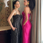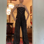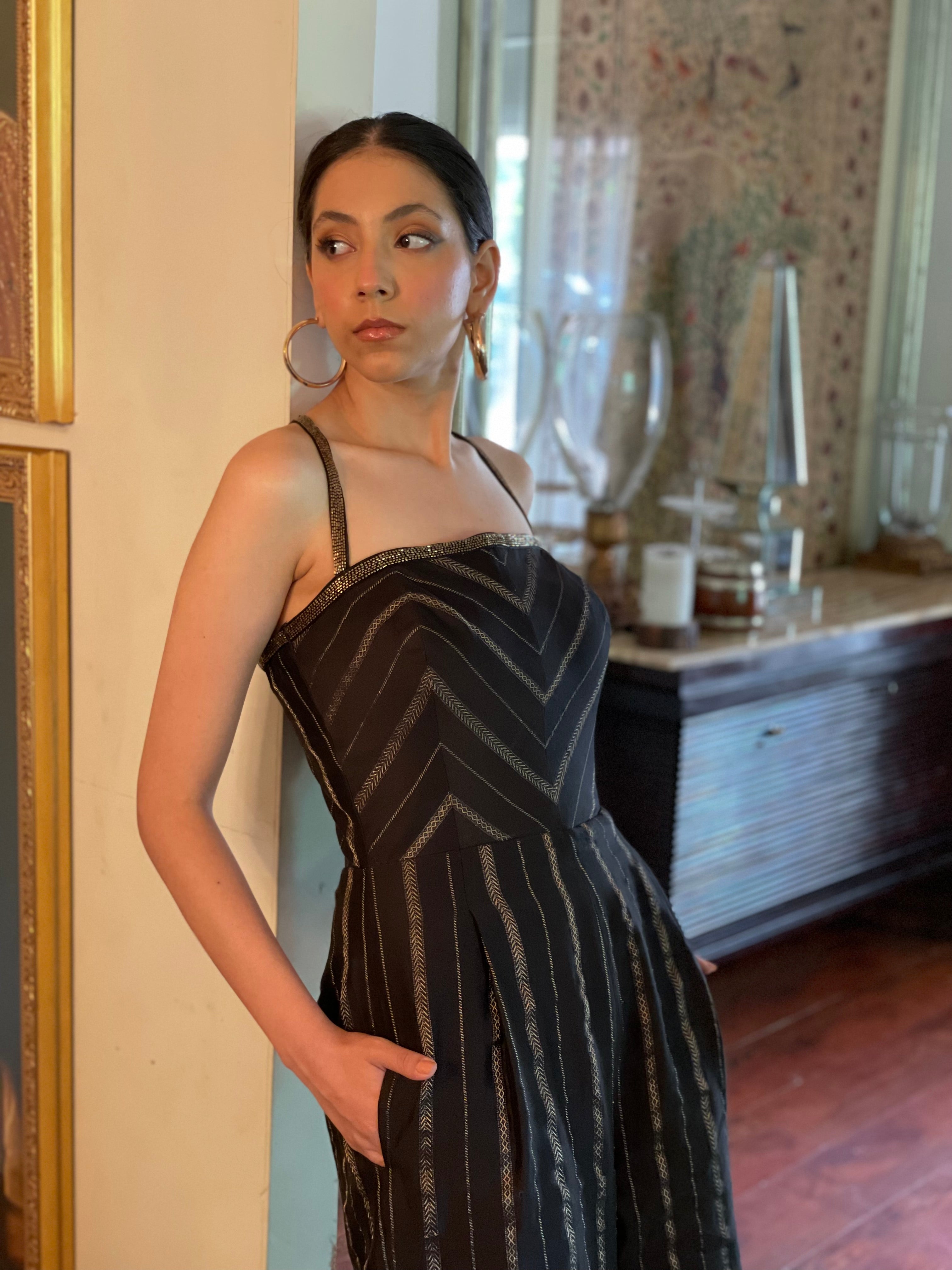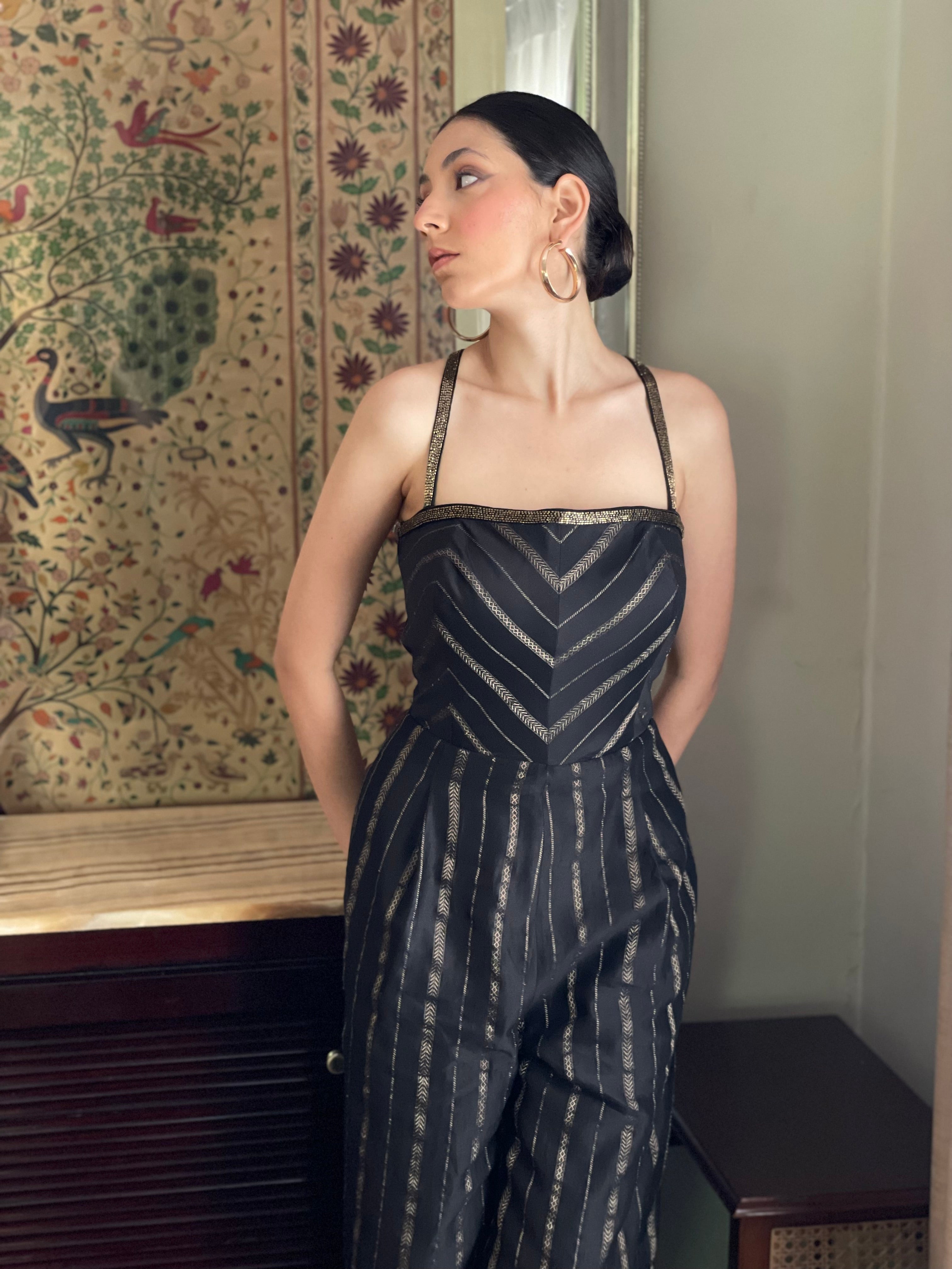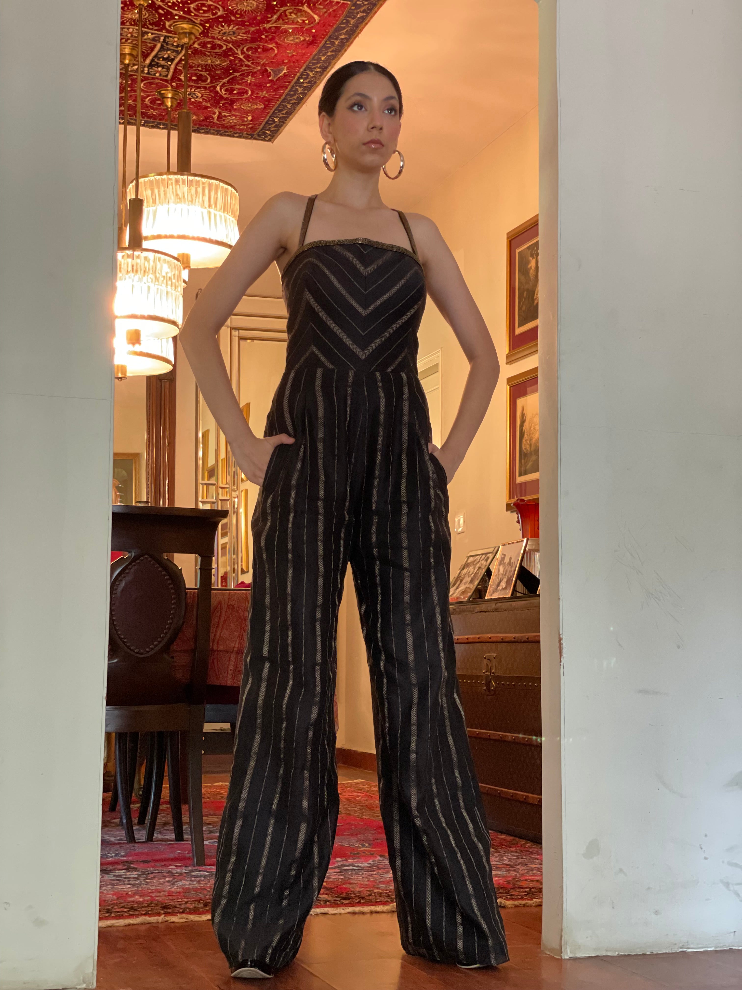 This black woven silk jumpsuit is a classic piece that you cannot go wrong with. The gold stripes keeps it formal for events/ dinners. Recommend pairing this look with white gold earrings and classic pumps.