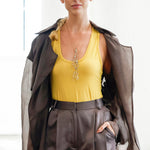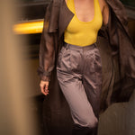 This scoop neck bodysuit in a soft yellow hue is a stunning embodiment of comfort and style. Crafted from hand knitted suede fabric, it combines the luxurious feel of suede with the flexibility of knit, resulting in a unique and tactile piece. The shade is both uplifting and versatile, making it suitable for various occasions and skin tones. The deep scoop neck accentuates the décolletage adding a touch of sensuality without being overly revealing. The deep asymmetrical racer back is a striking design element that sets this bodysuit apart. It's a statement of understated luxury and artistic design that offers a fresh and playful addition to any wardrobe.