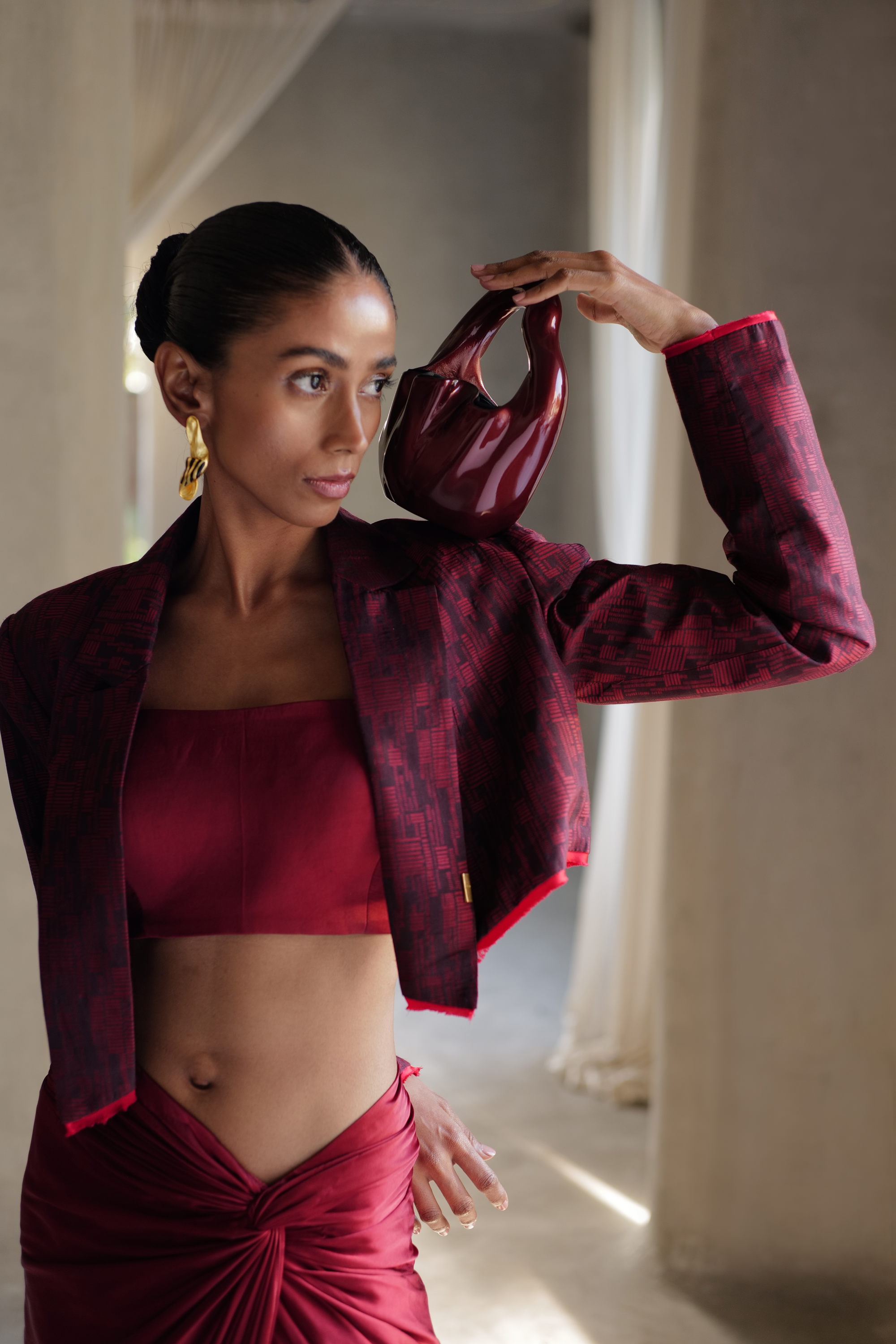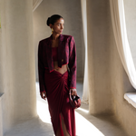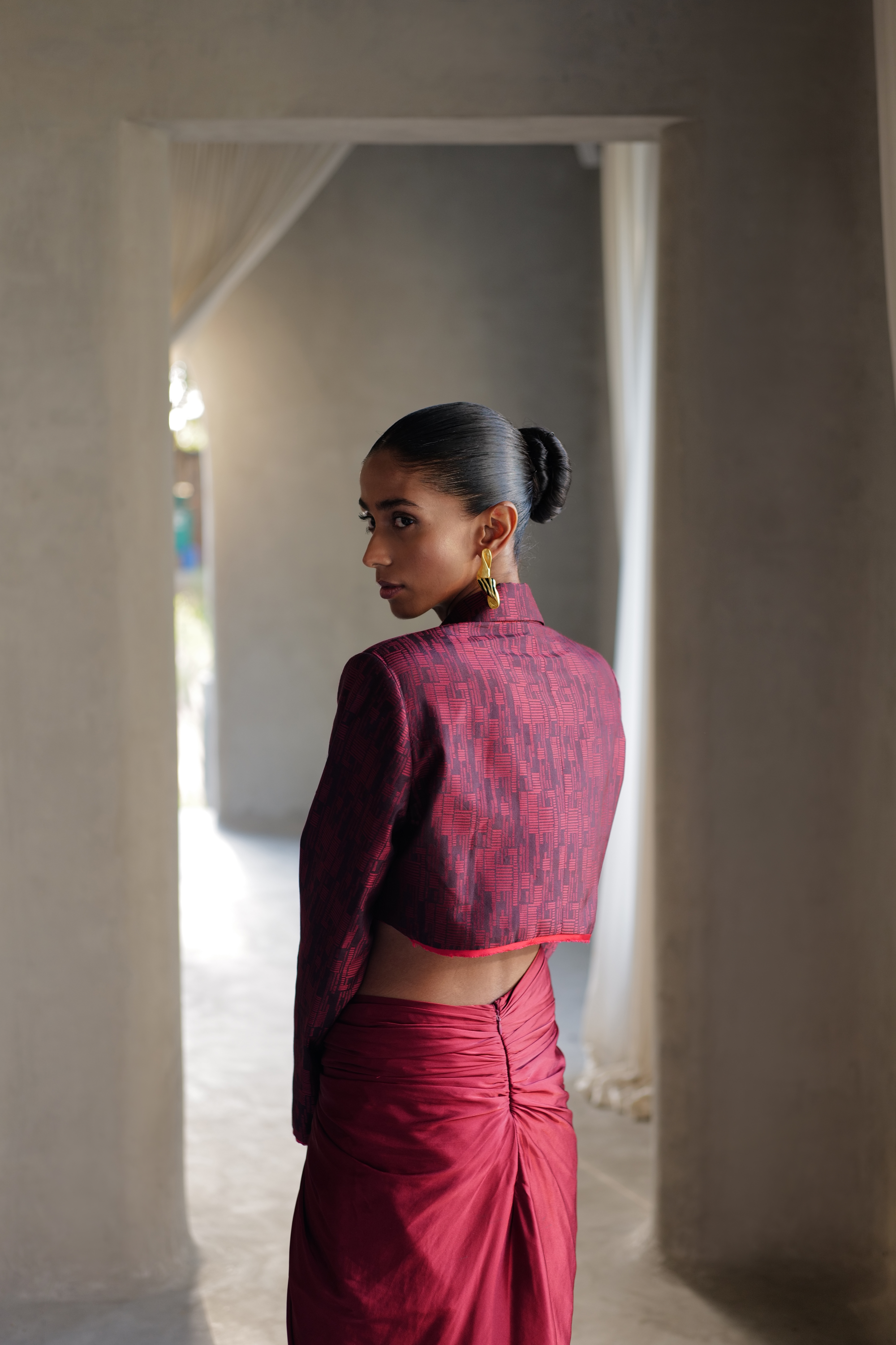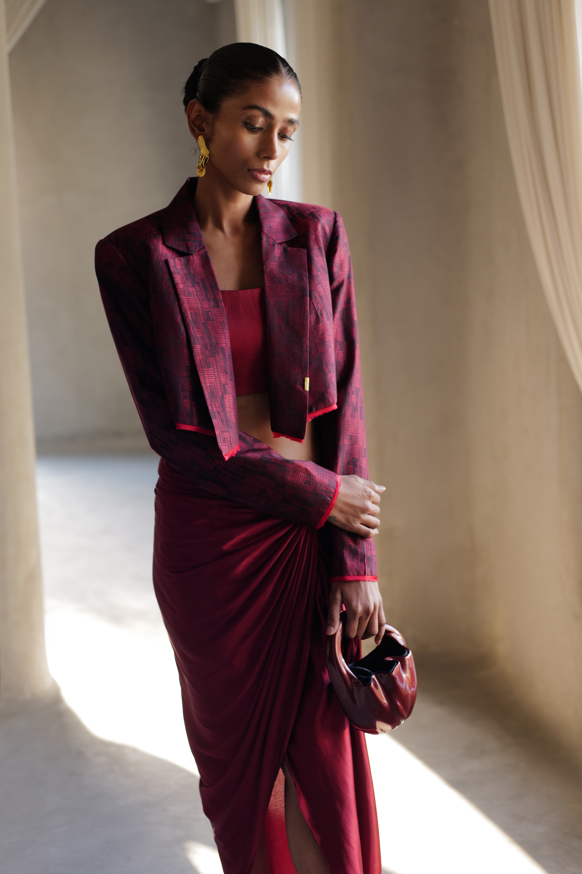 She exuberates opulence & grandeur in this cropped blazer & skirt. Her outfit is a beautiful masterpiece, crafted with the finest handwoven silk & attention to detail. The texture of the handwoven fabric is soft & luxurious, the intricate design woven into it speak to the level of craftsmanship that went into its creation. The well tailored cropped blazer with strong shoulders & the understated skirt with a flattering waist detail makes for a grand yet elegant silhouette. Every step she takes is purposeful & deliberate, as if she is savoring the moment & the attention it brings.