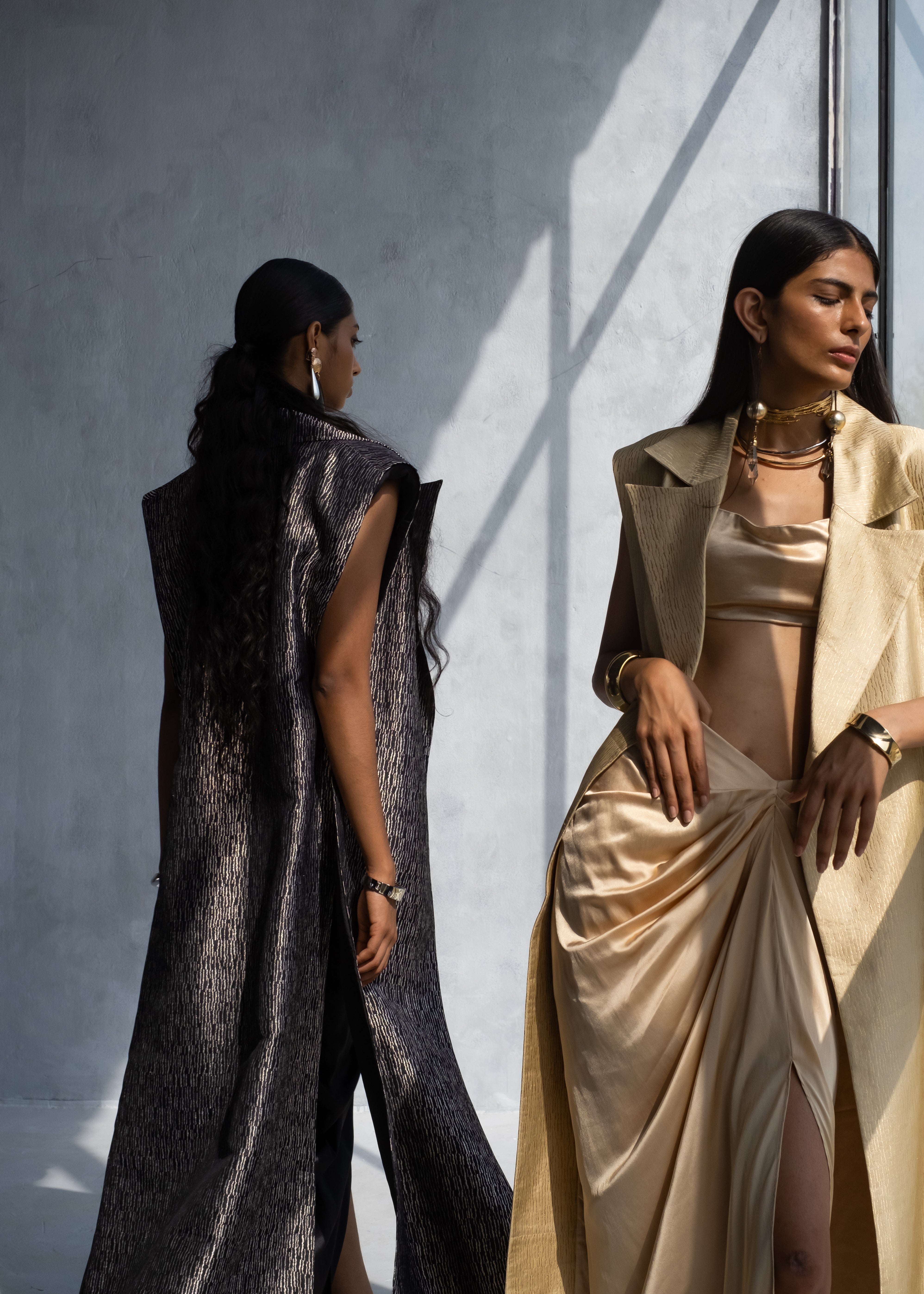Crafted from a handwoven silk fabric, this cape seamlessly blends artisanal craftsmanship with modern elegance. The fabric is a work of art, featuring an intricate texture woven by skilled artisans. Its rich, tactile quality adds depth to the garment, captivating the eye with its mesmerizing shine. The cape gracefully drapes over the body while holding its strong shoulder pads and broad lapel. It is held together by personalized metal clasps on the sides to give a more free flowing feel. The silhouette is voluminous yet effortlessly chic. Paired with it, is a satin slit skirt that drapes fluidly around the hips and waist, creating a harmonious balance of structure and fluidity.