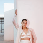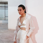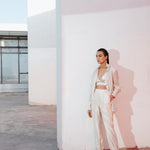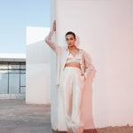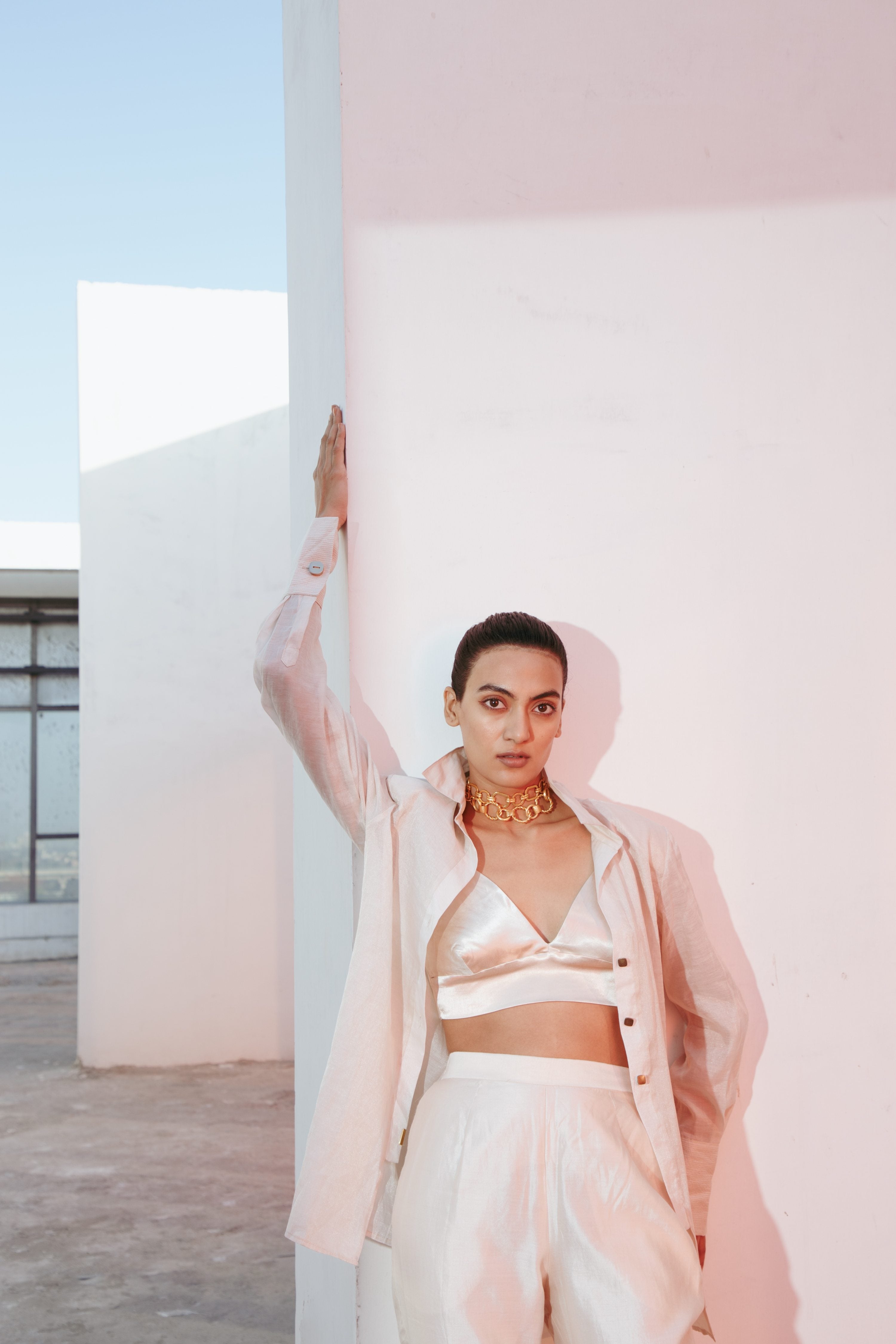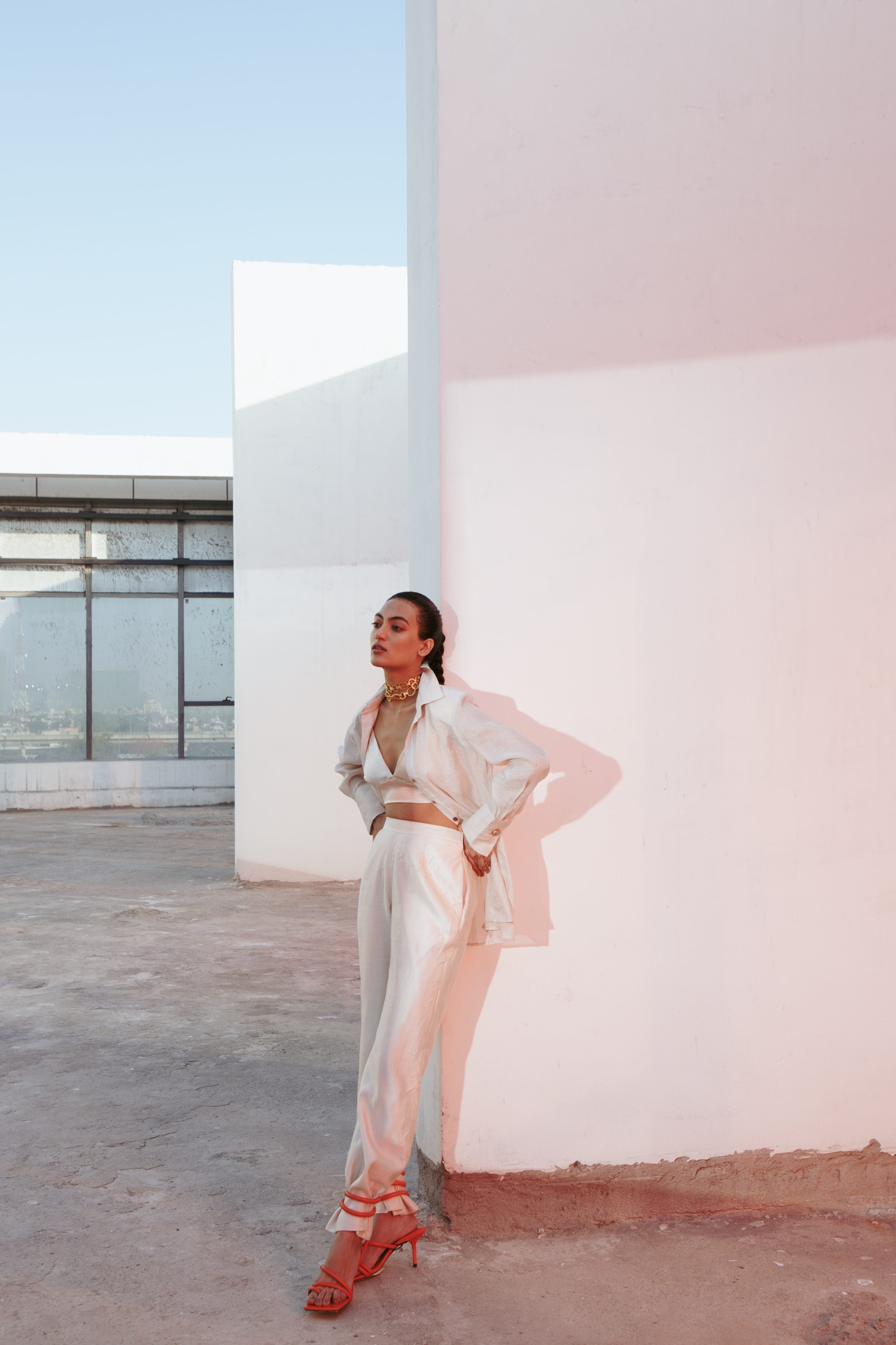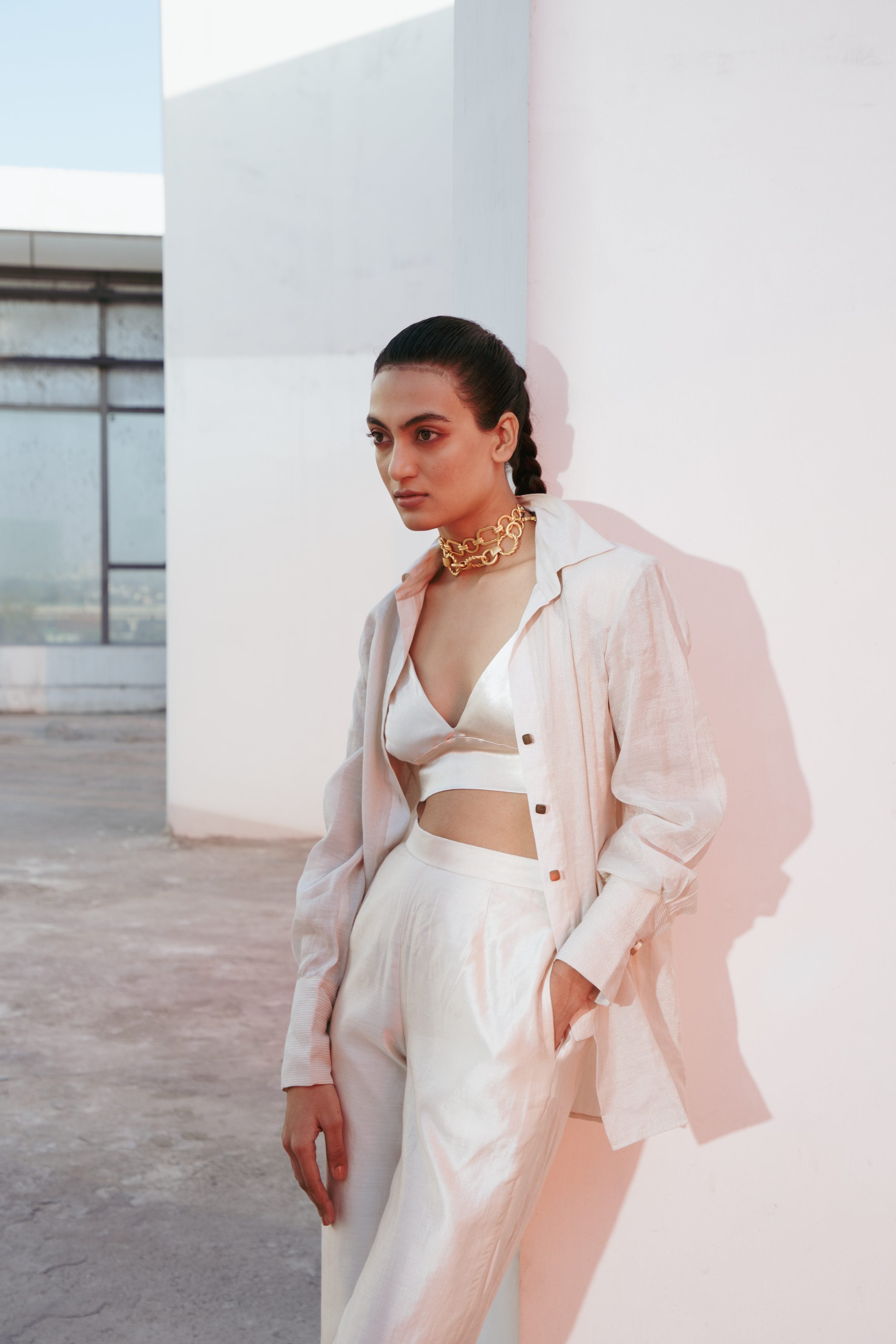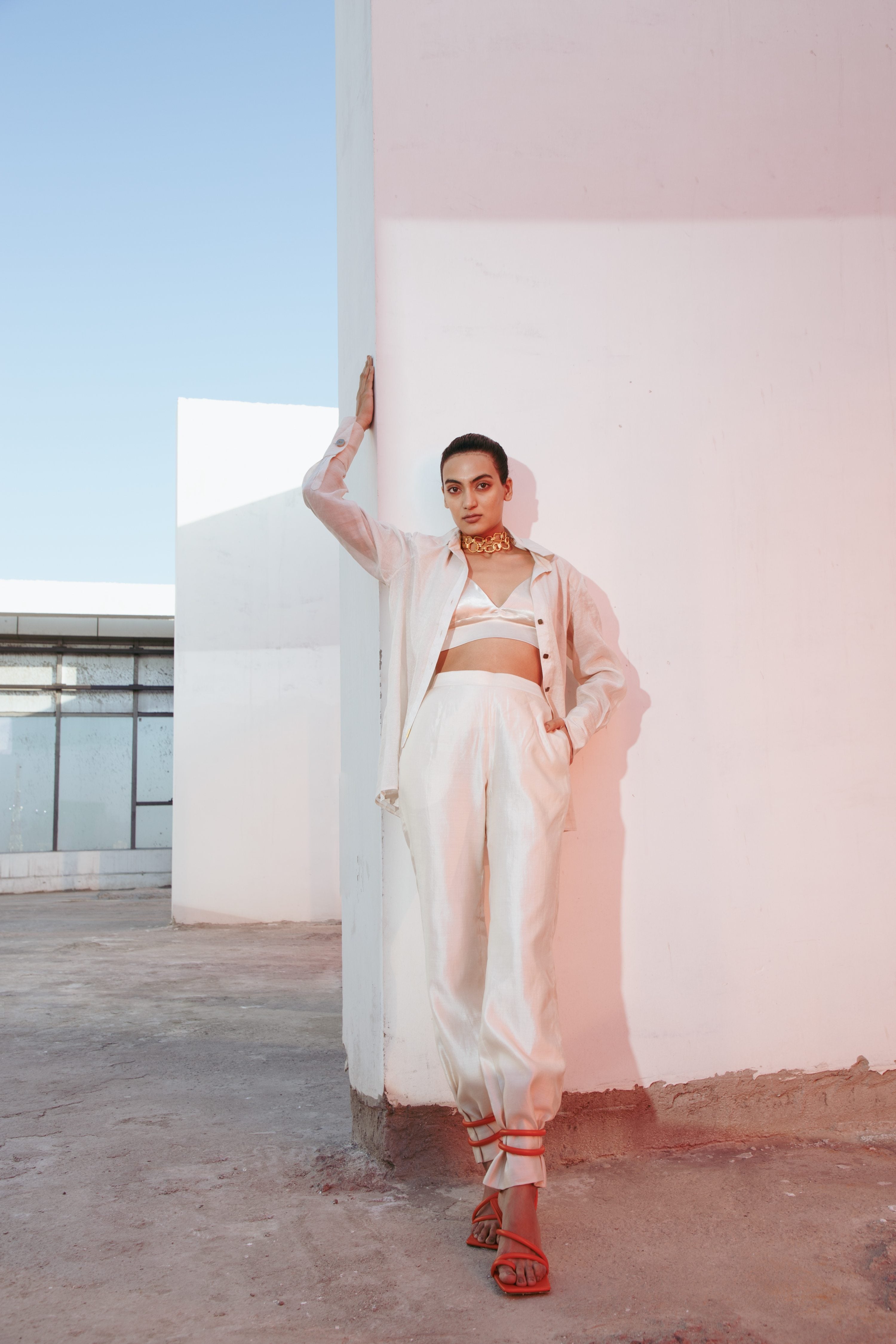 This breezy outfit is the perfect set for the summer. the subtle shine in the tissue shirt makes it formal enough to carry this from desk to dinner. recommend pairing it with pop colored strappy heels & bold sunglasses.