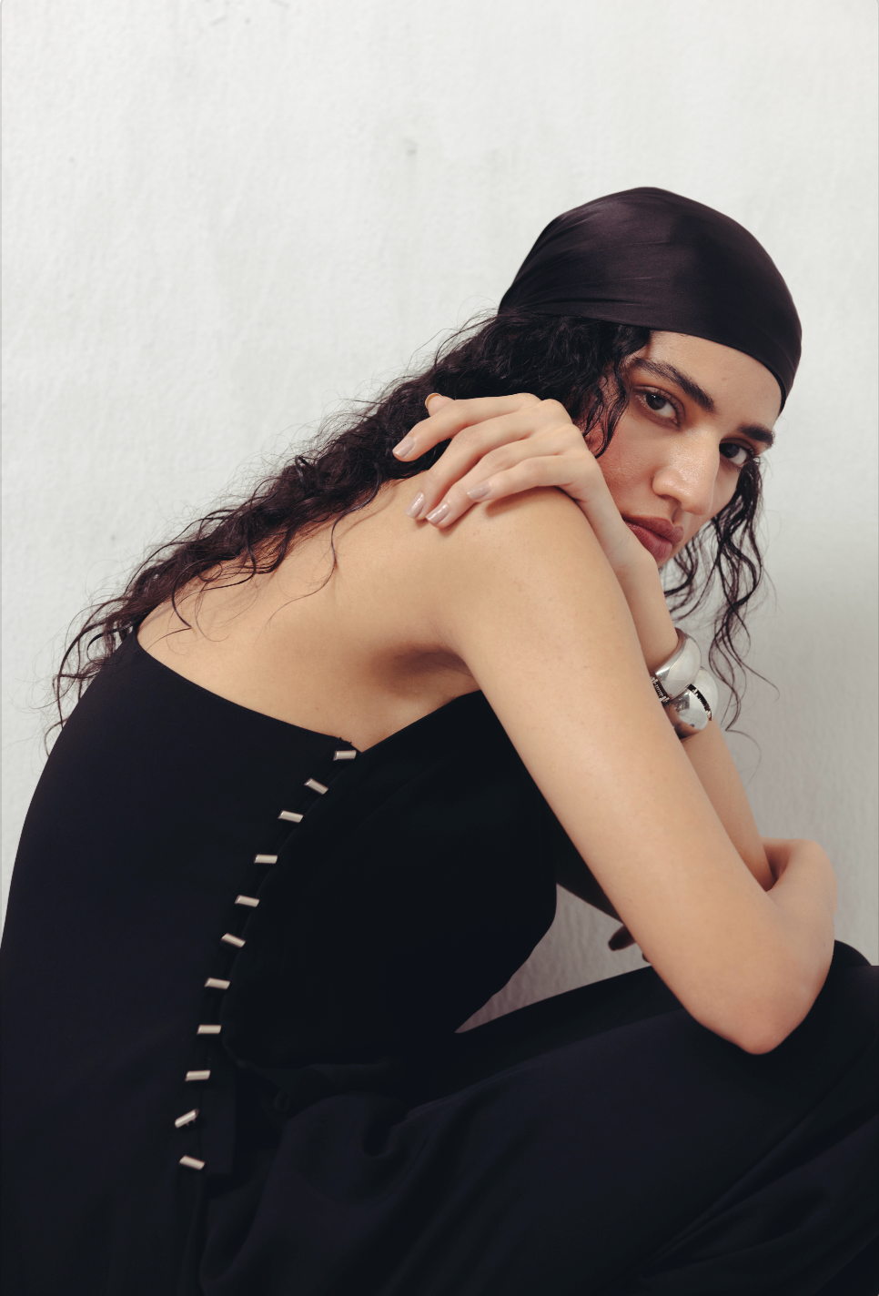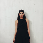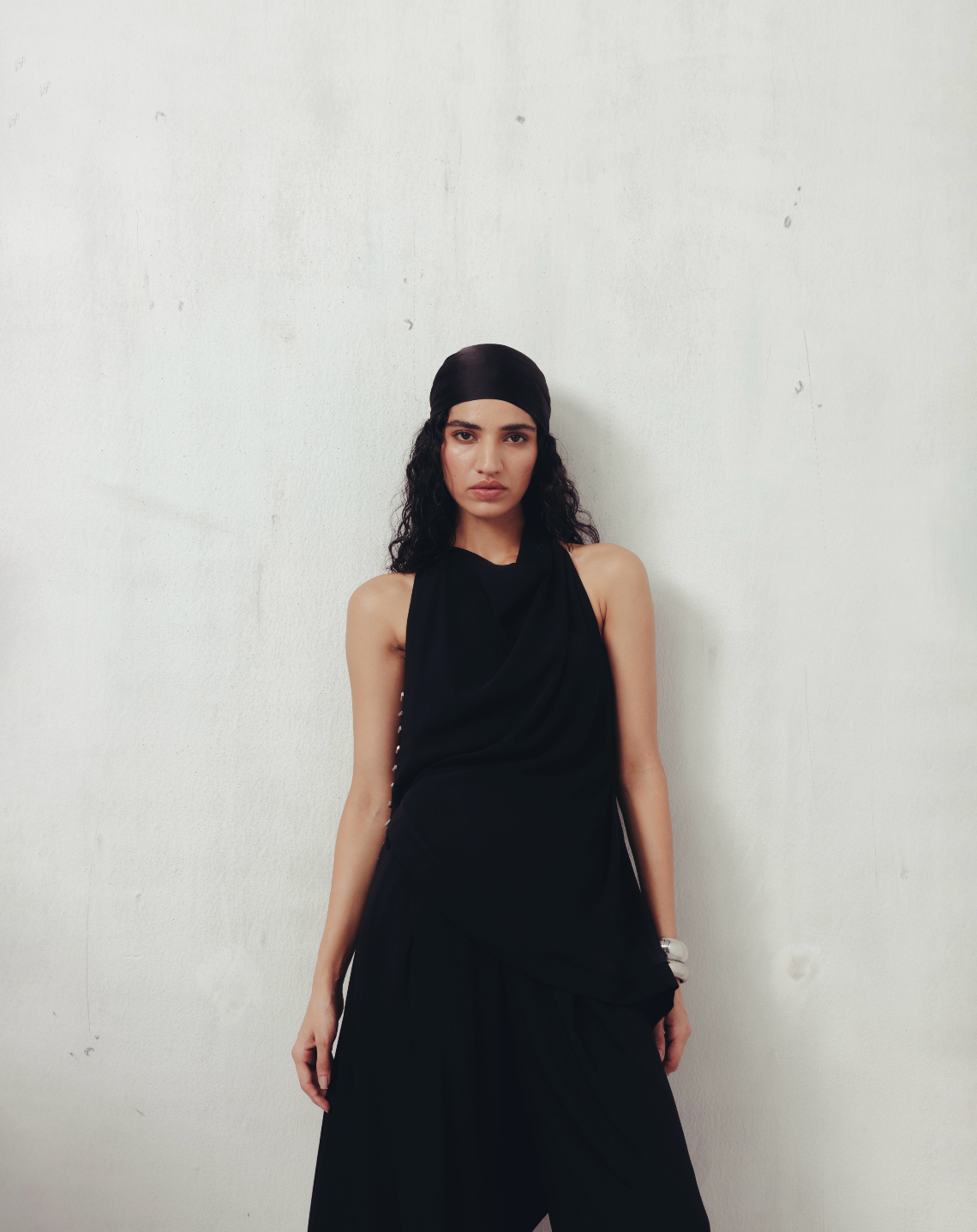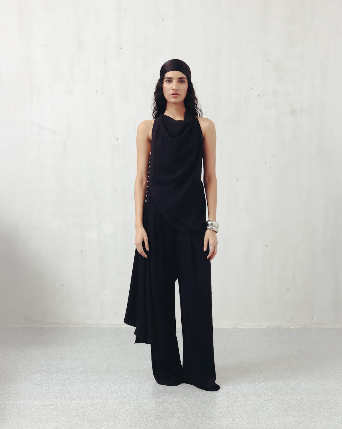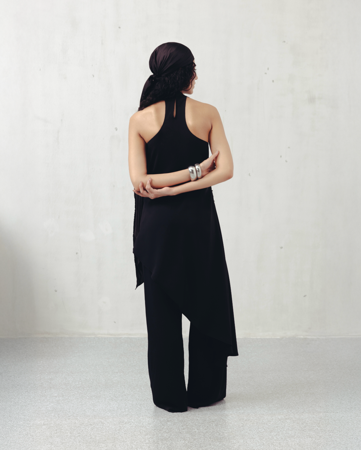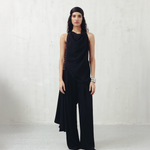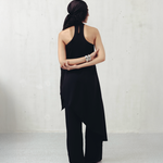 A racer back-style draped top with a soft cowl detailing that falls gracefully along the neckline. Its fluid construction of the asymmetric hem and metal buttons create movement and elegance, offering a refined yet effortless look.