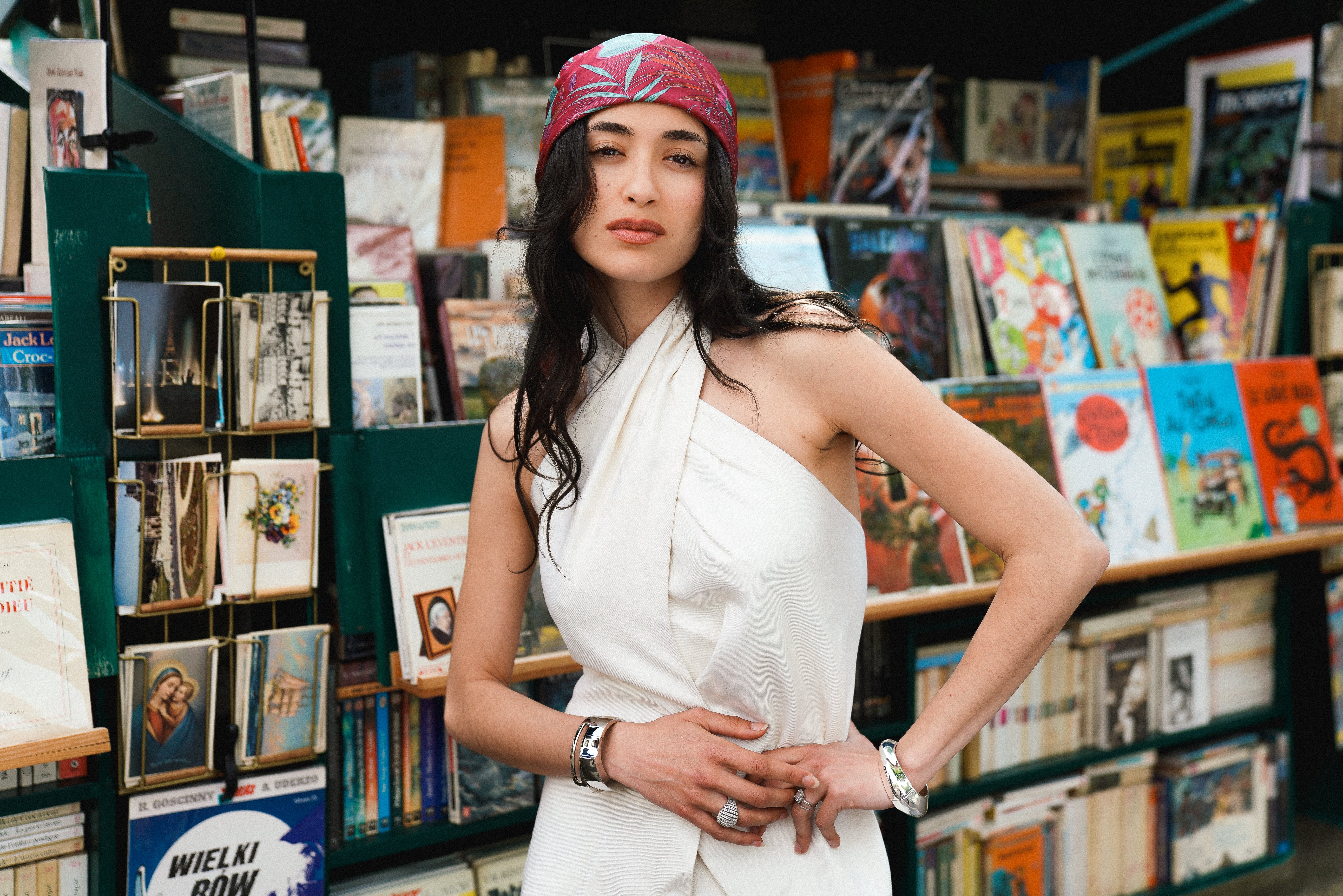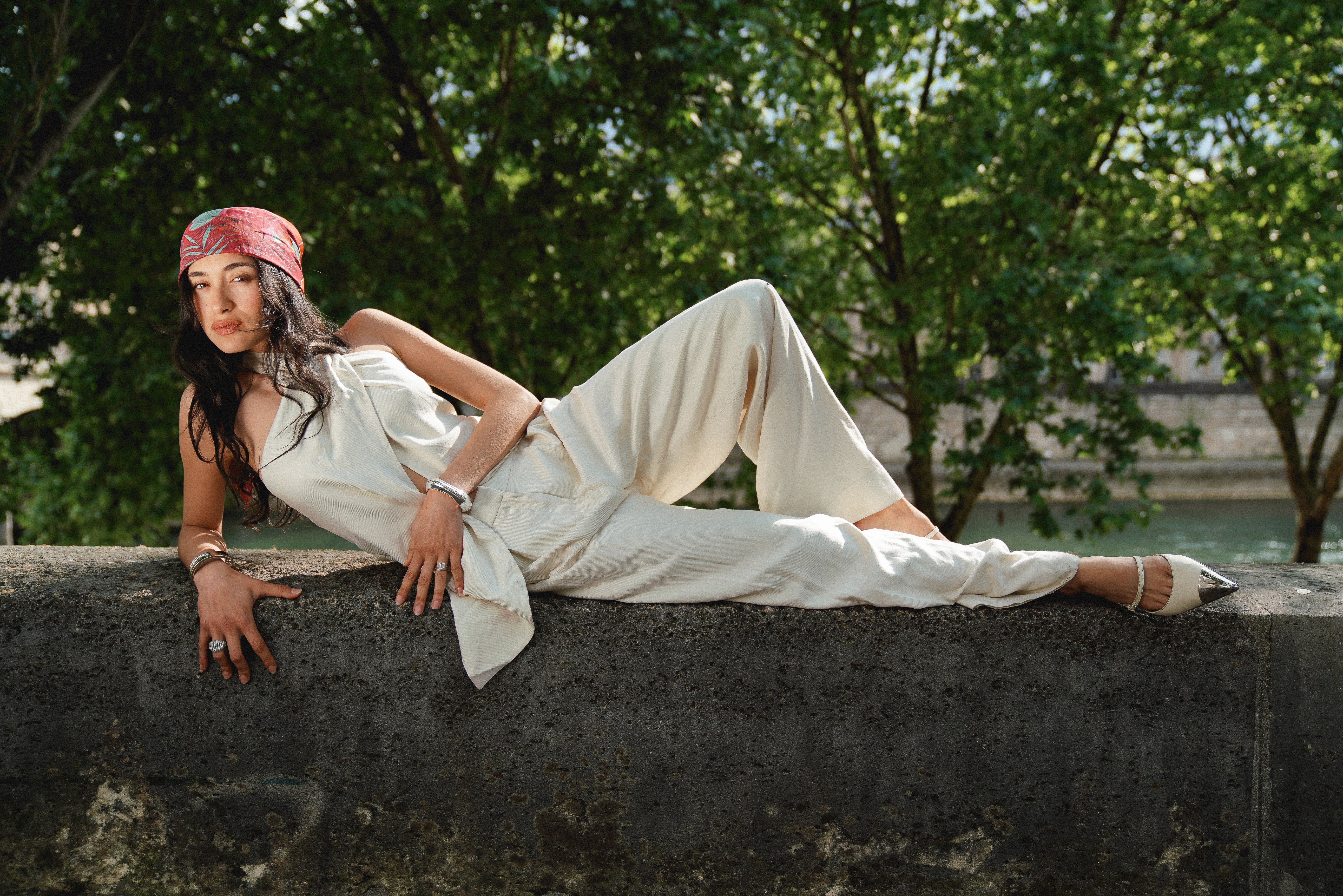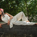 This co-ord set screams summer chic. The halter neck top features a criss-cross front that converges at the back, creating a flattering neckline. An intriguing detail of unstructured buttons which are placed slightly tilted at the back adds a unique touch, enhancing the overall aesthetic. Paired with wide-leg pants, the ensemble offers a relaxed yet polished look, perfect for various occasions.