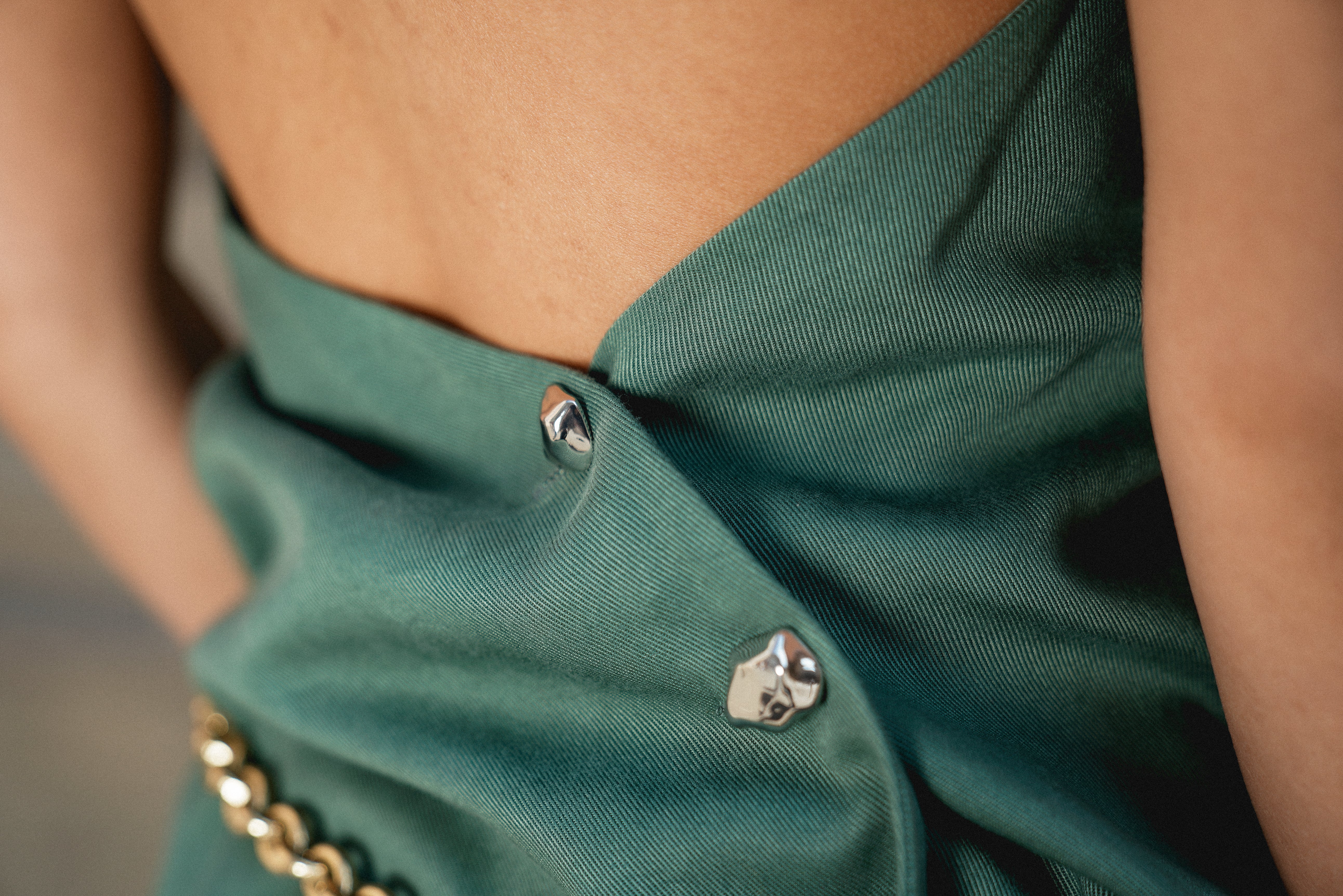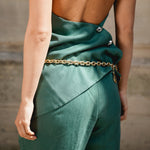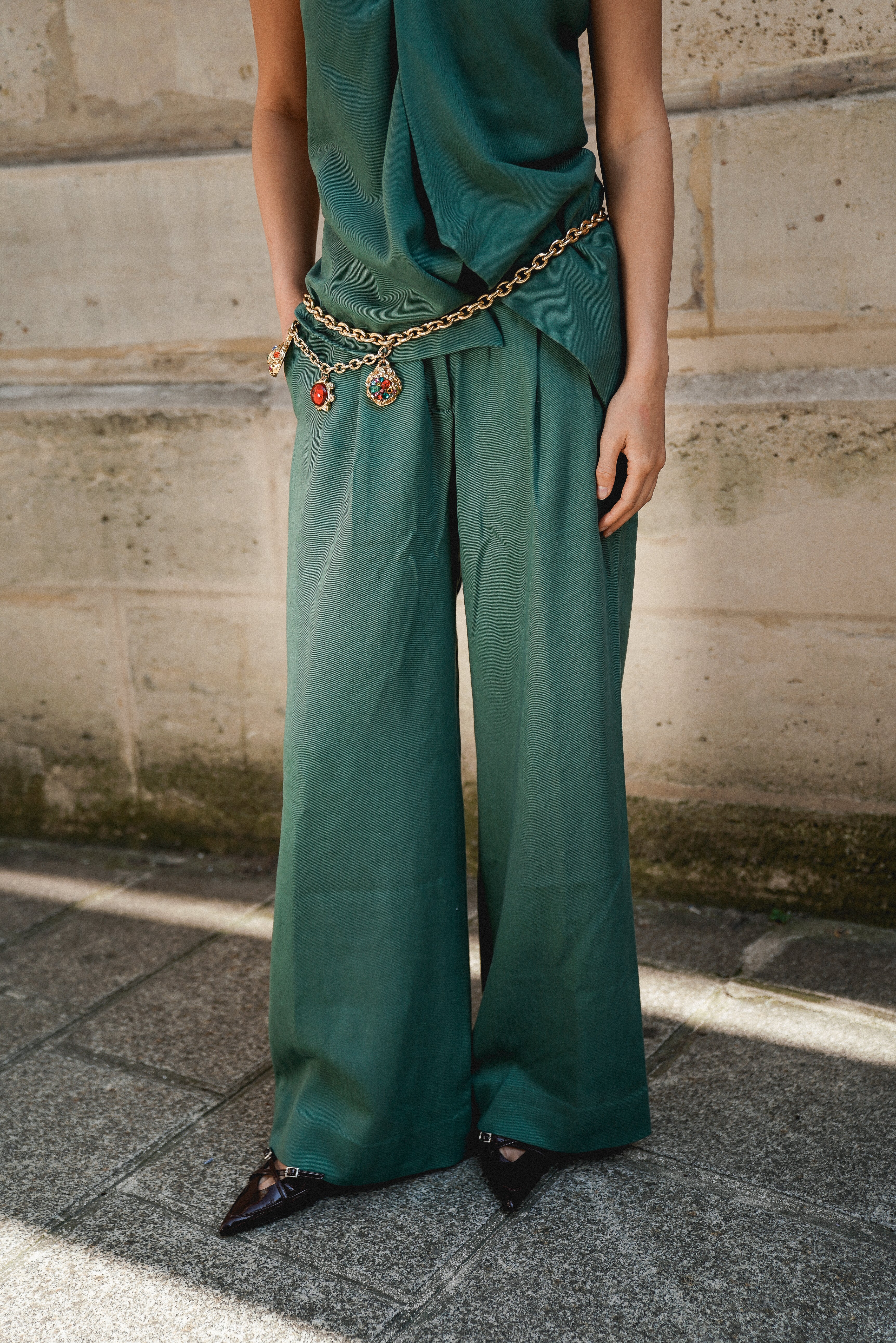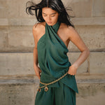 This co-ord set screams summer chic. The halter neck top features a criss-cross front that converges at the back, creating a flattering neckline. An intriguing detail of unstructured buttons which are placed slightly tilted at the back adds a unique touch, enhancing the overall aesthetic. Paired with wide-leg pants, the ensemble offers a relaxed yet polished look, perfect for various occasions.