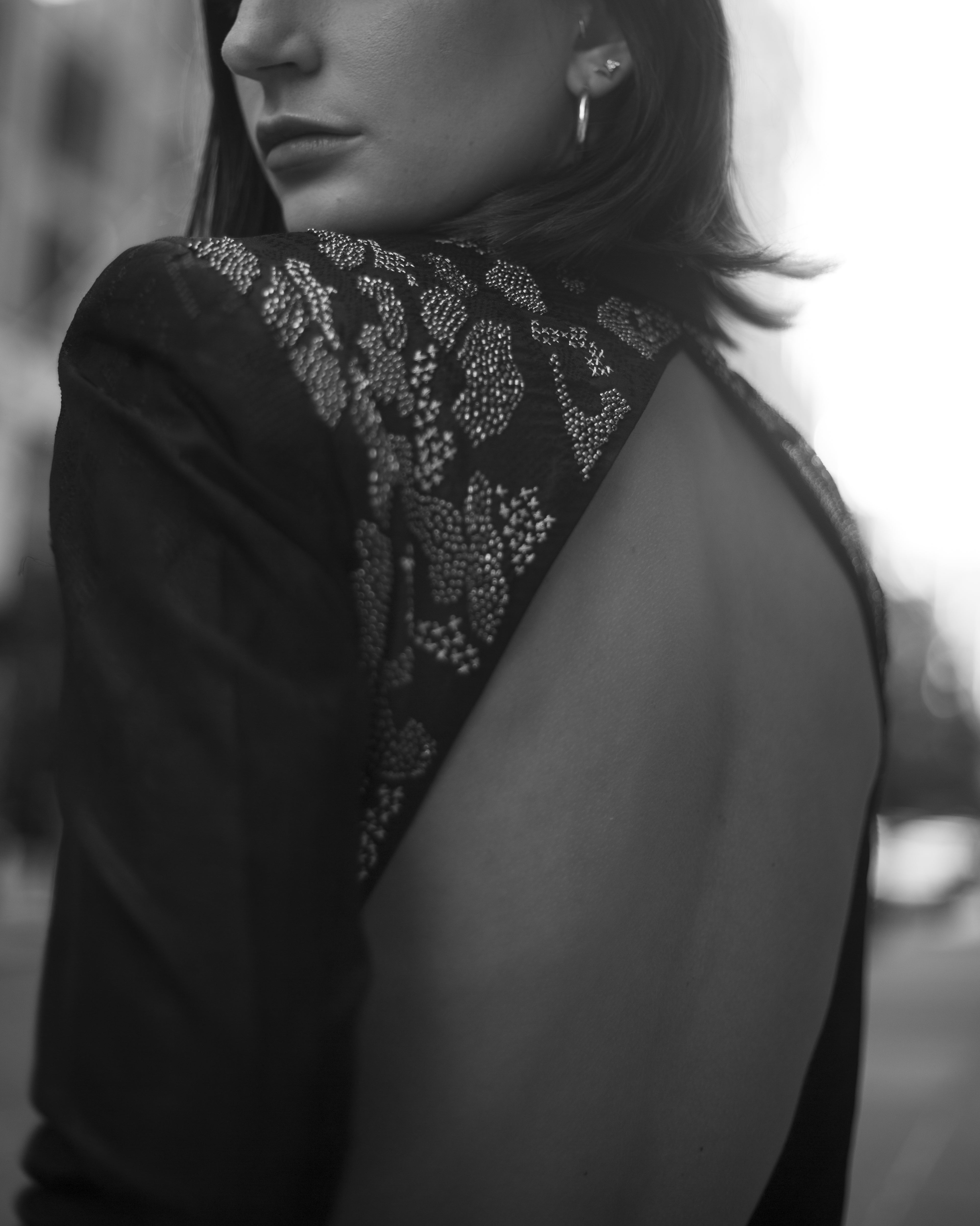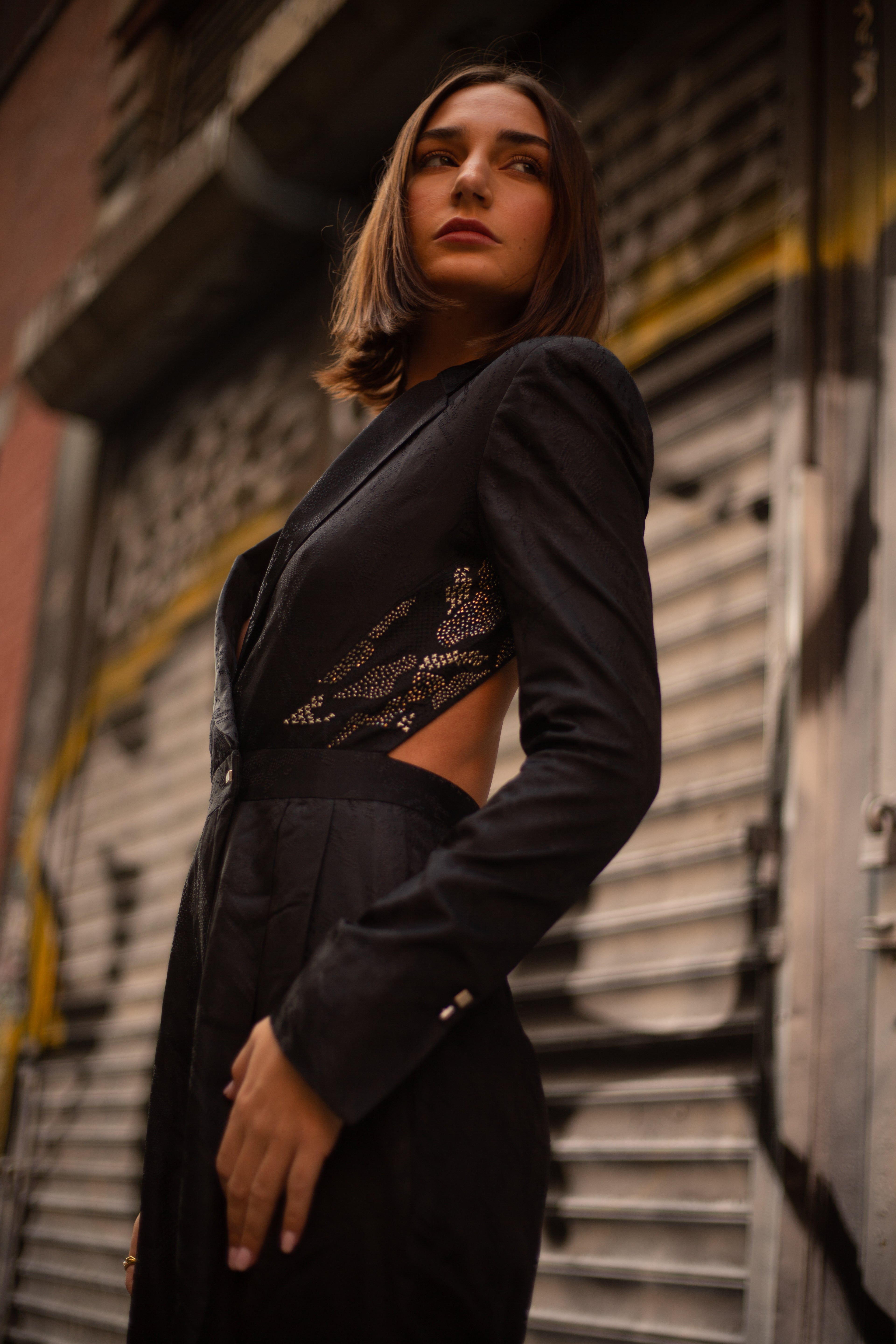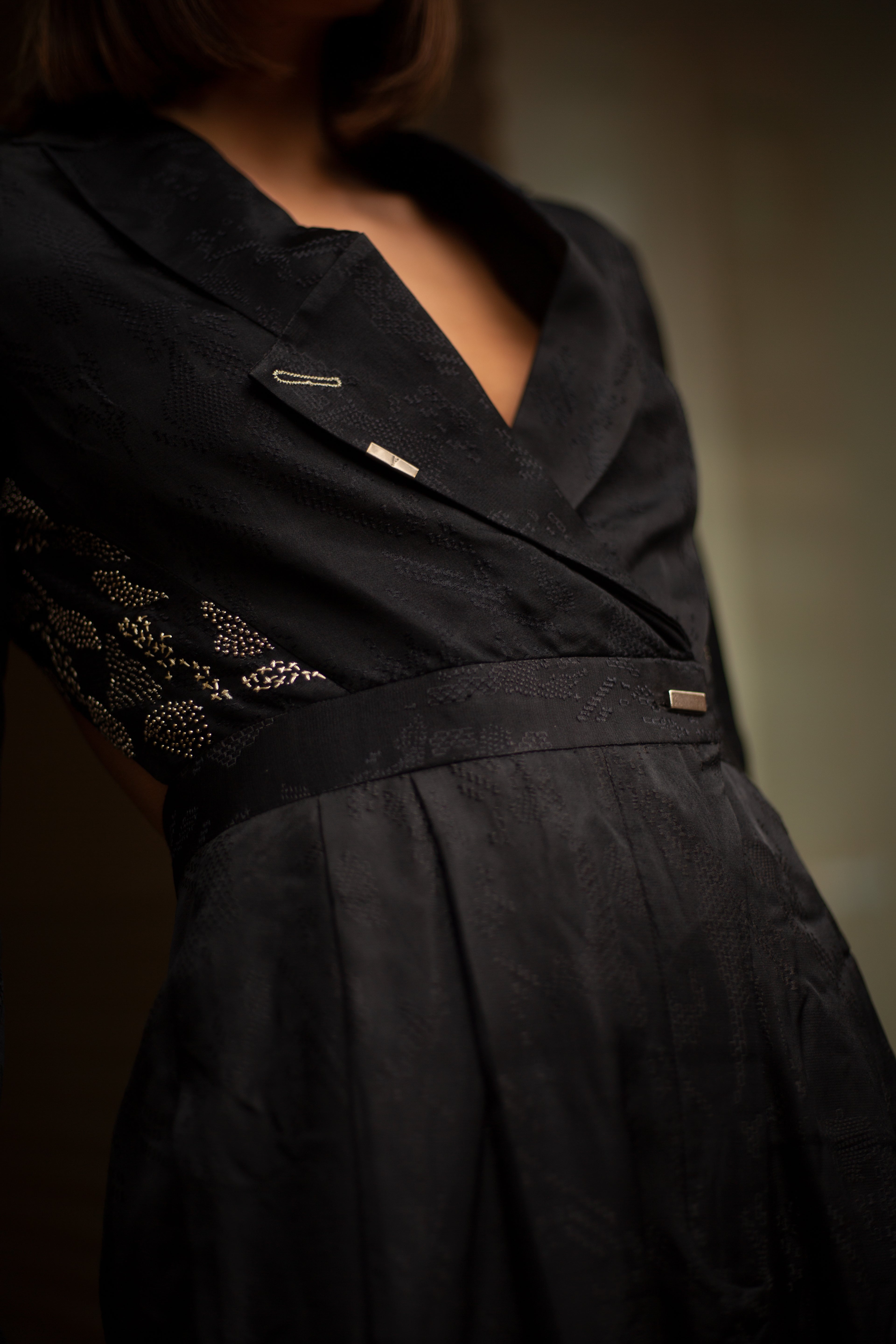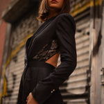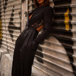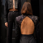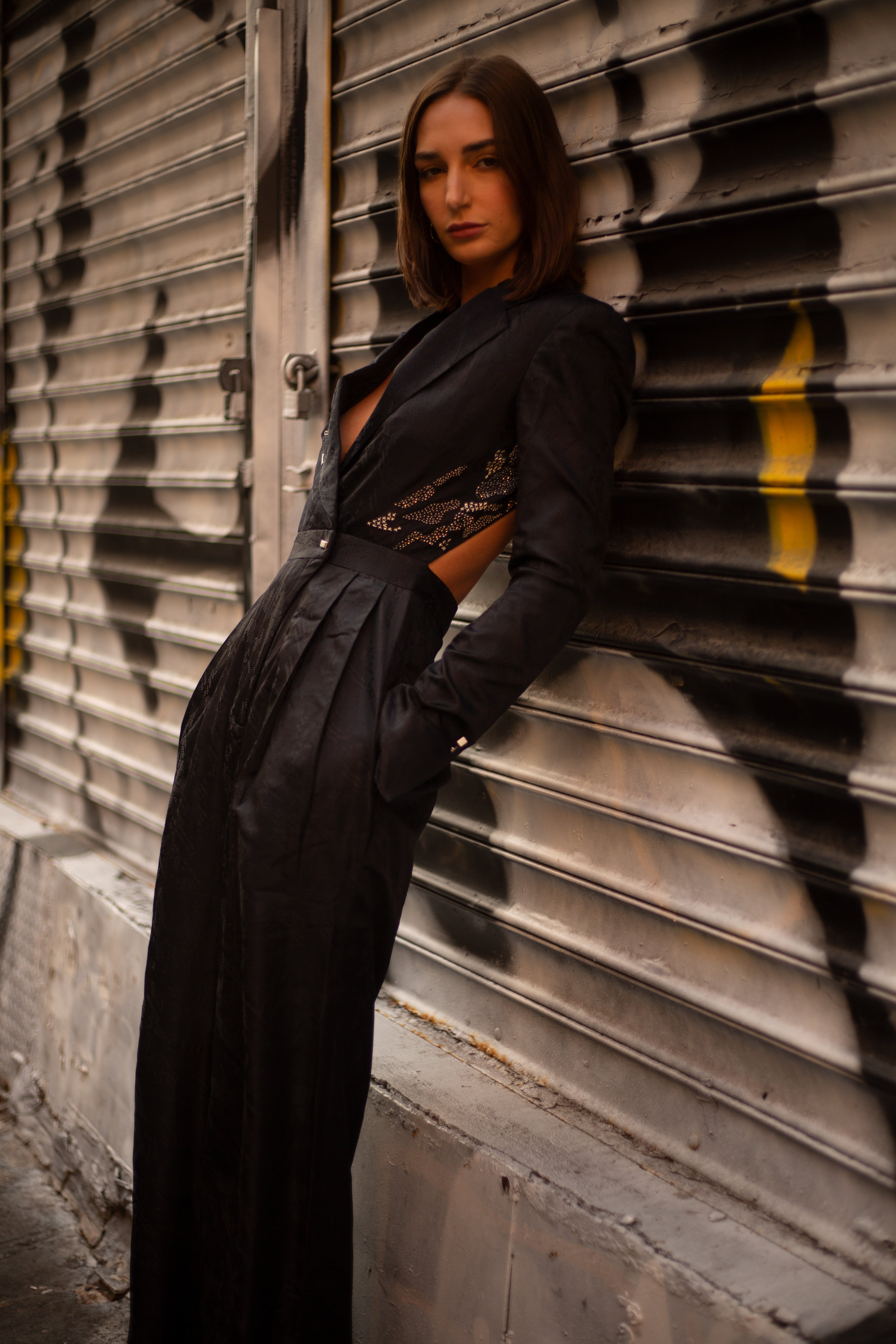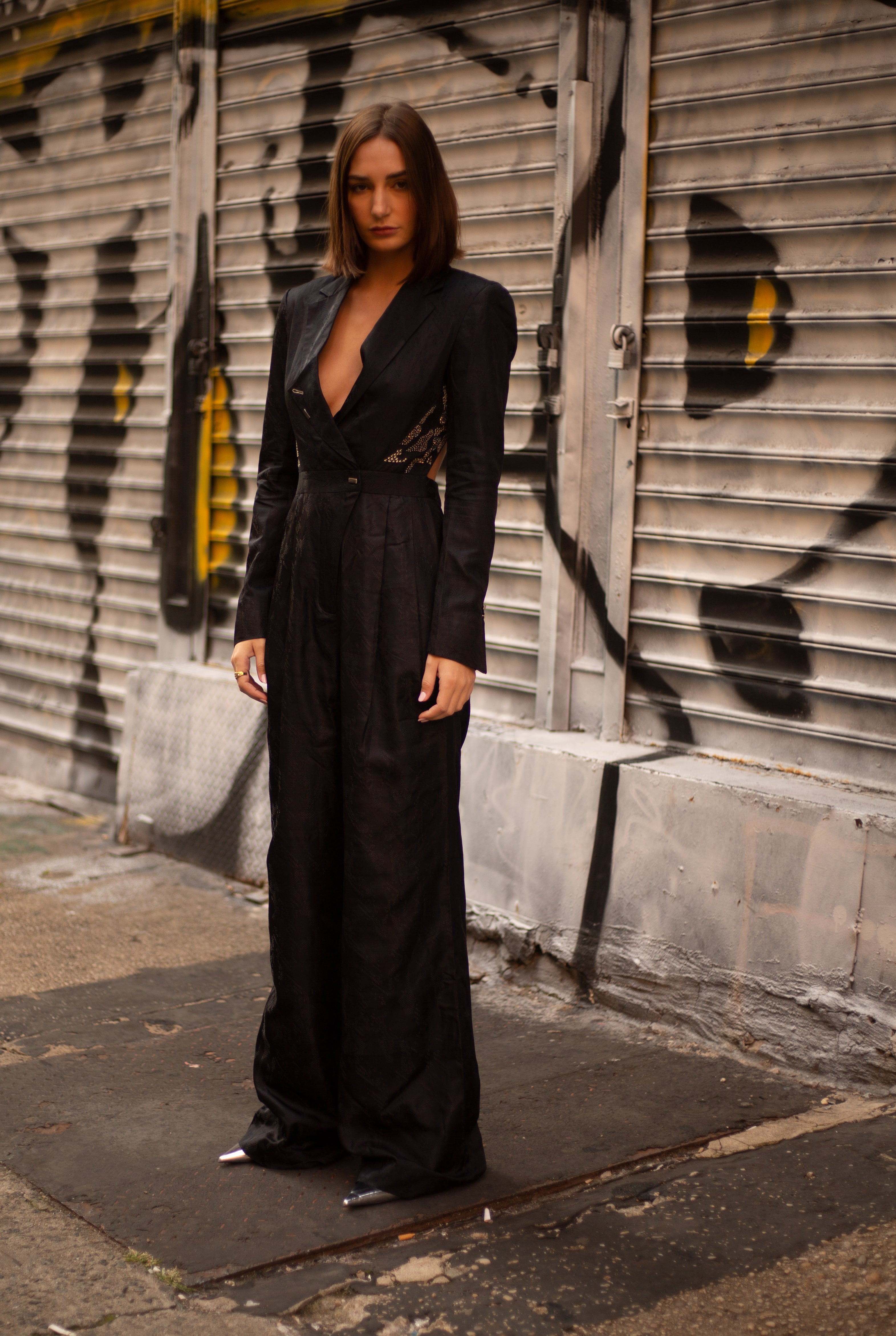 This is a well tailored jumpsuit accentuates the wearer's figure while maintaining a sophisticated edge. The black hue lends a timeless look to the outfit, making it suitable for a wide range of events while the abstractly handwoven fabric adds a touch of luxury. The standout feature of this jumpsuit, being the deep exposed back is designed to dip gracefully, revealing a tasteful amount of skin. This unexpected detail adds an alluring and contemporary twist to the formal wear, making it truly eye-catching from every angle. To enhance this appeal the back is adorned with metallic embellishments that are strategically placed to create an abstract pattern, adding a touch of opulence and visual interest. This silhouette is harmonious blend of classic elegance and contemporary flair, making it an exquisite choice for those who seek a memorable and stylish attire for upscale events.