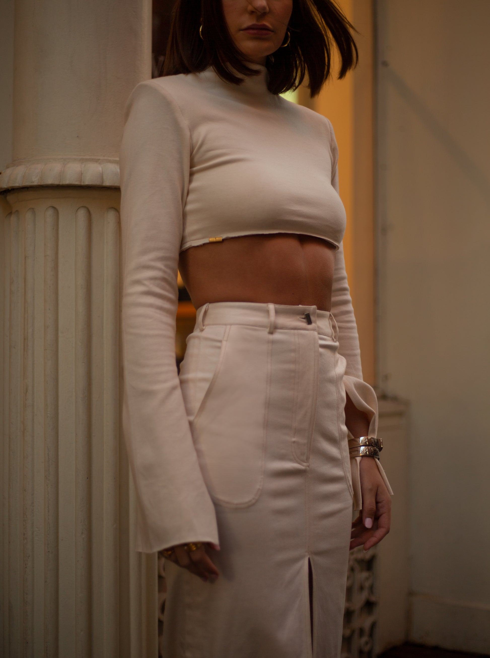 The top features a zero neckline and strong shoulders which adds to its clean aesthetic, allowing the focus to shift to the minimalist lines and powerful shoulders. The long sleeves with elongated cuff add a touch of sophistication while maintaining a sense of balance with the cropped length.