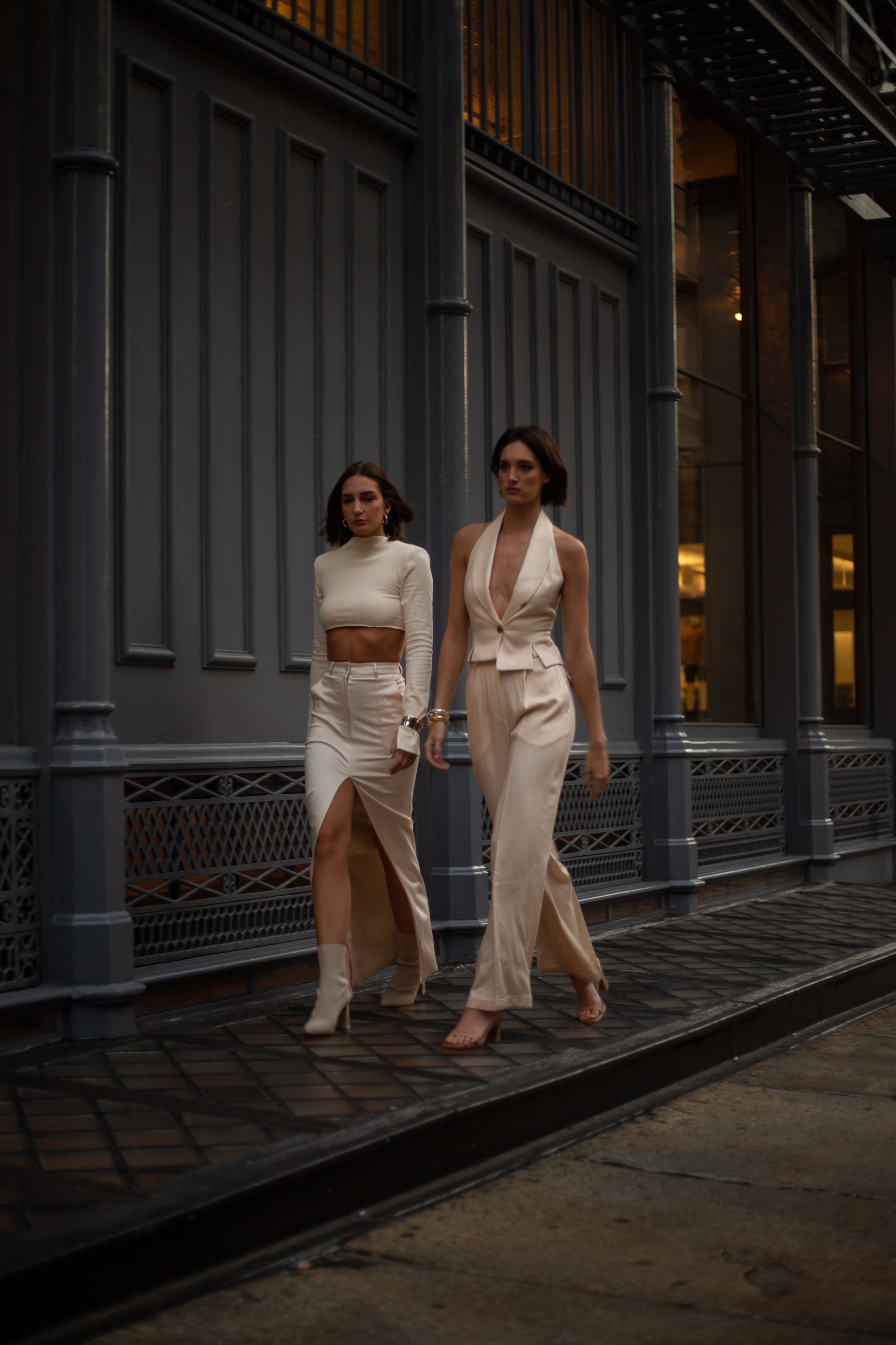 The floor-length cream skirt seamlessly combines sophistication with a touch of alluring elegance. It is designed to flatter the figure while adding a captivating element of sex appeal through a well-placed center slit. The silhouette is fitted through the hips and thighs, accentuating the wearer's natural shape. As it cascades downwards, the skirt gently widens, allowing for ease of movement and a sense of gracefulness.
