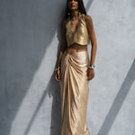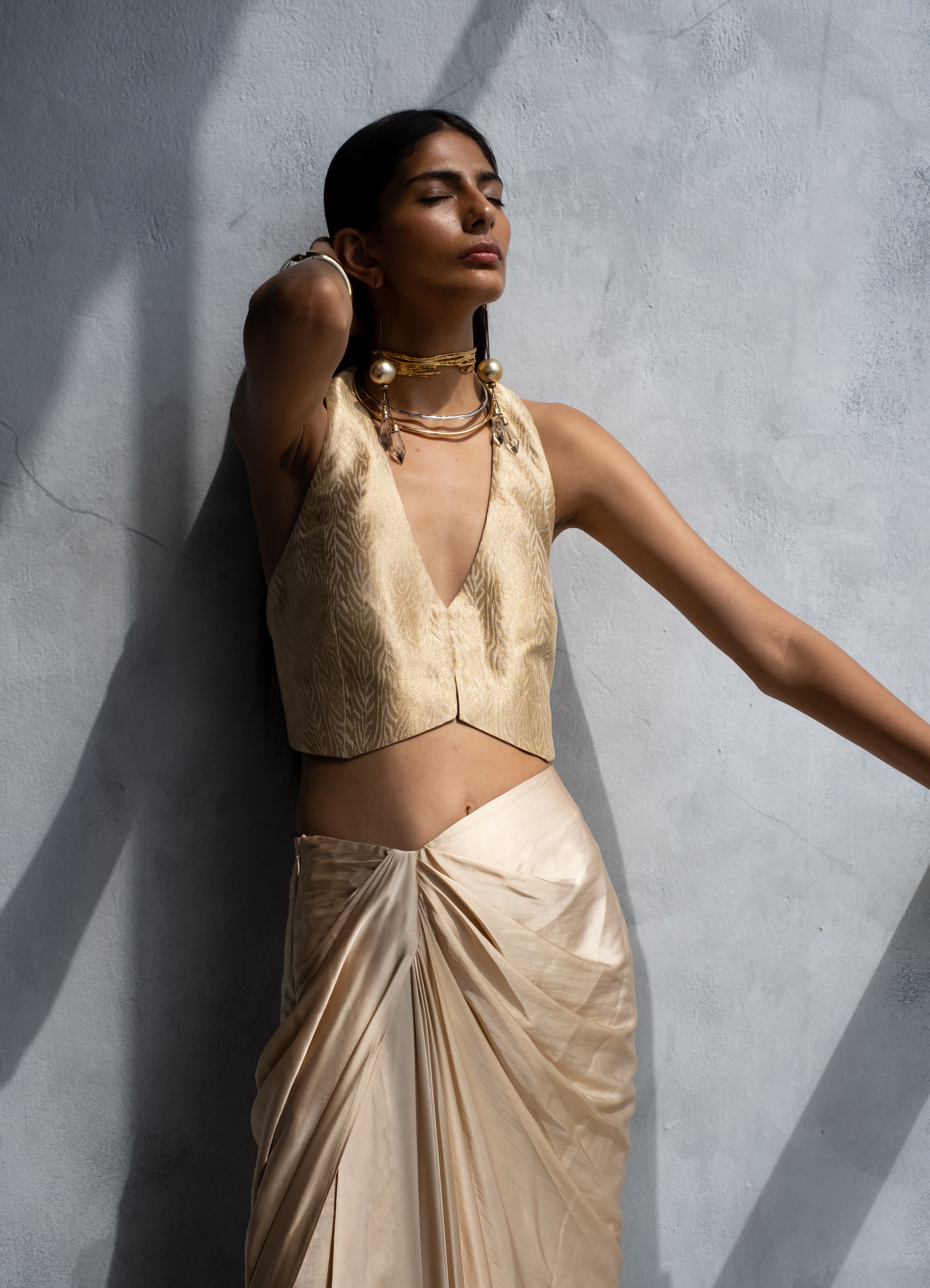 The deep racerback waistcoat crafted from an abstract handwoven fabric exudes a contemporary flair. The silver embroidery enhances the abstract motif of the fabric by adding depth and a touch of glamour, elevating it to a statement piece.The silhouette is paired with a long drapey satin skirt that has as asymetrical V shaped waist. The waist detailing accetuates the wearers torso by giving it a snatched effect. Overall, this ensemble is visually captivating and elegantly daring, making it a standout piece for a special occasion.
