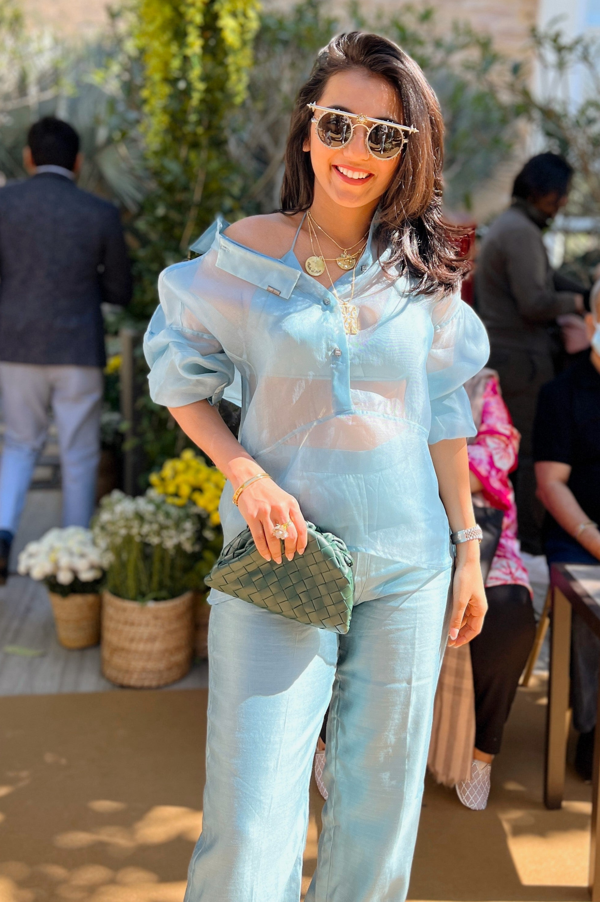 This pop colored co-ordinate set is a great outfit for a night out with friends or an event. The multiseam, oversize organza shirt with straight leg silk trousers & a halter bralette make it young & glamorous. Recommend pairing it up with contrast colored strappy heels & a singular piece of chunky jewellery.