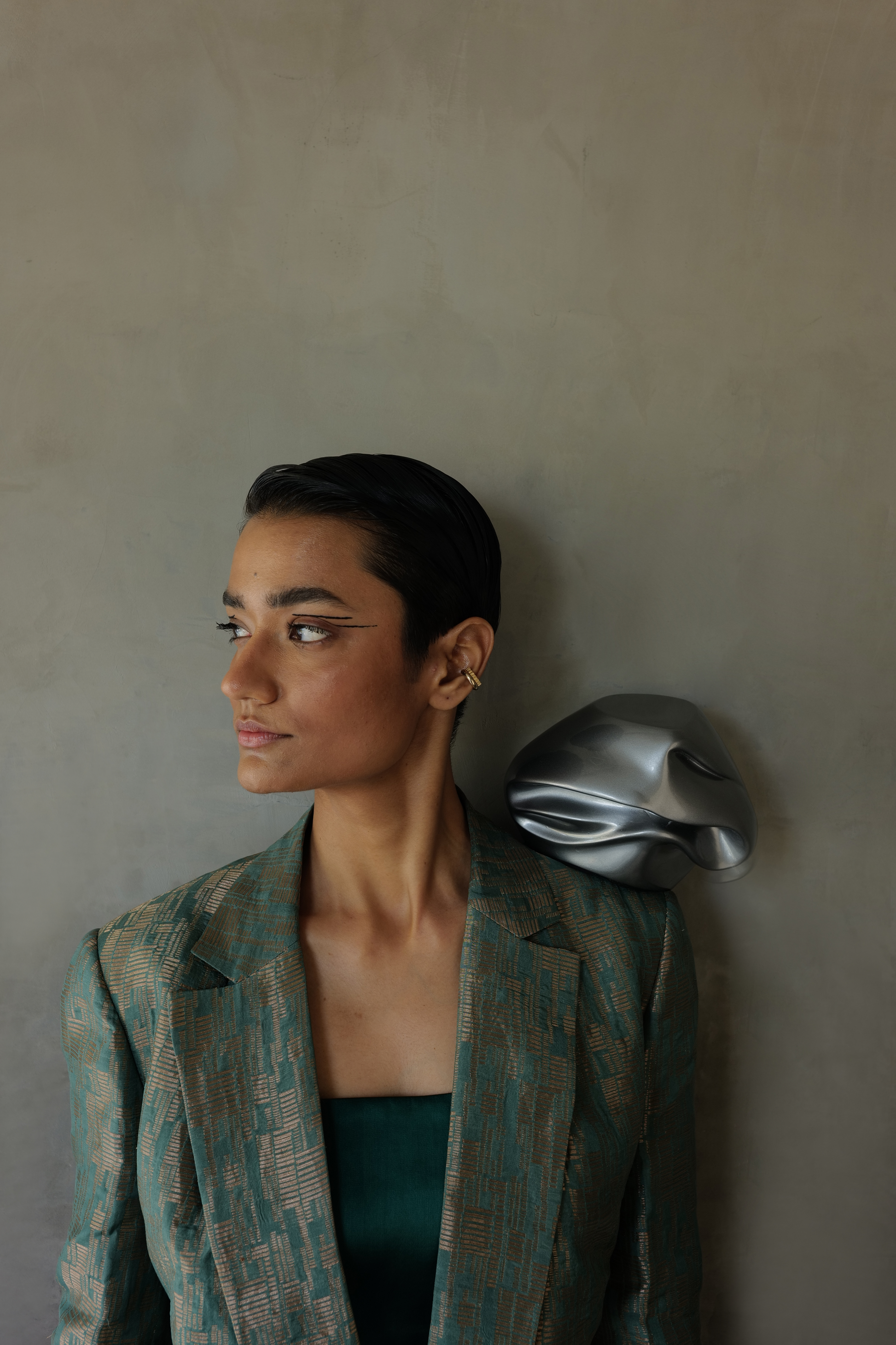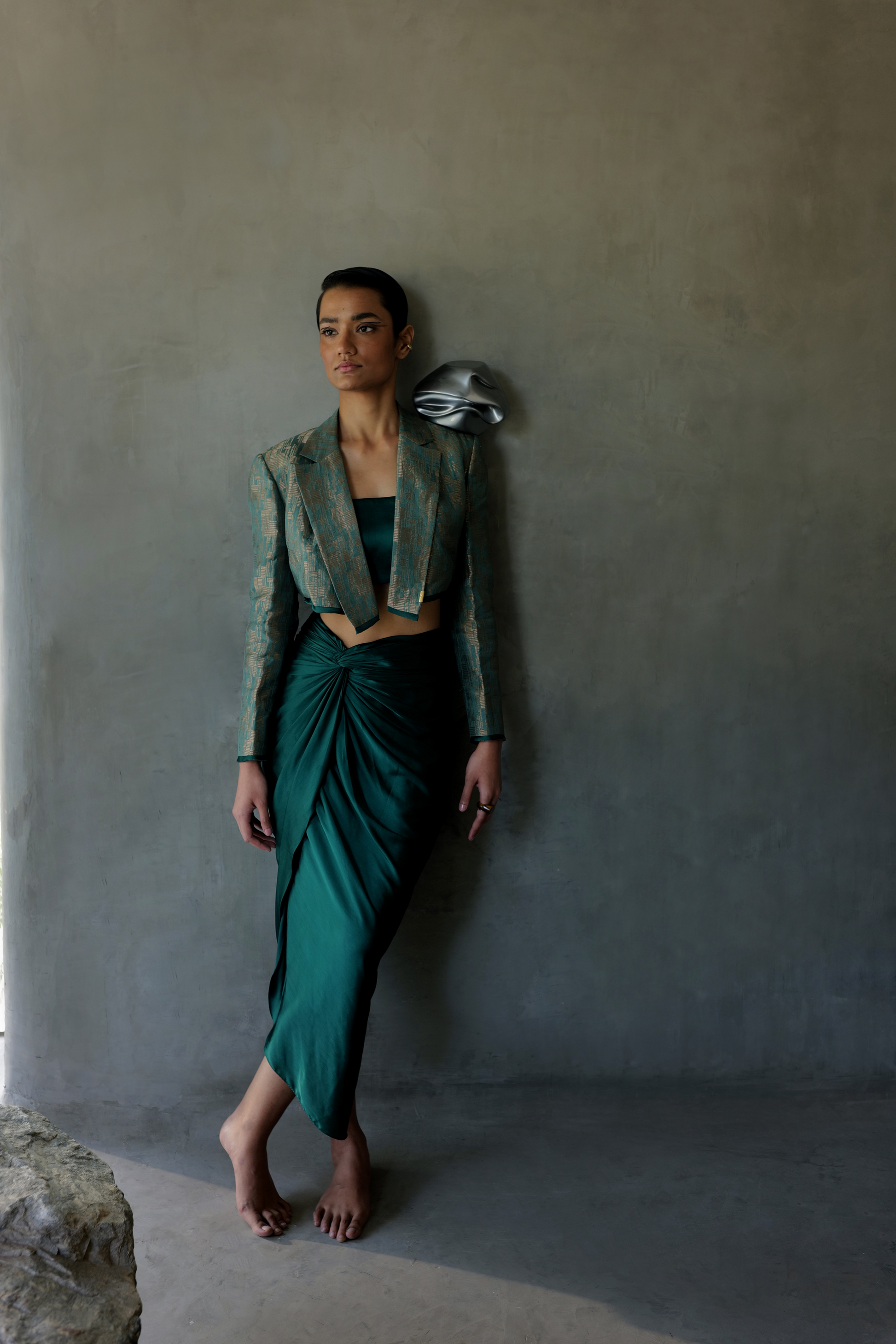 She exuberates opulence & grandeur in this cropped blazer & skirt. Her outfit is a beautiful masterpiece, crafted with the finest handwoven silk & attention to detail. The texture of the handwoven fabric is soft & luxurious, the intricate design woven into it speak to the level of craftsmanship that went into its creation. The well tailored cropped blazer with strong shoulders & the understated skirt with a flattering waist detail makes for a grand yet elegant silhouette. Every step she takes is purposeful & deliberate, as if she is savoring the moment & the attention it brings.