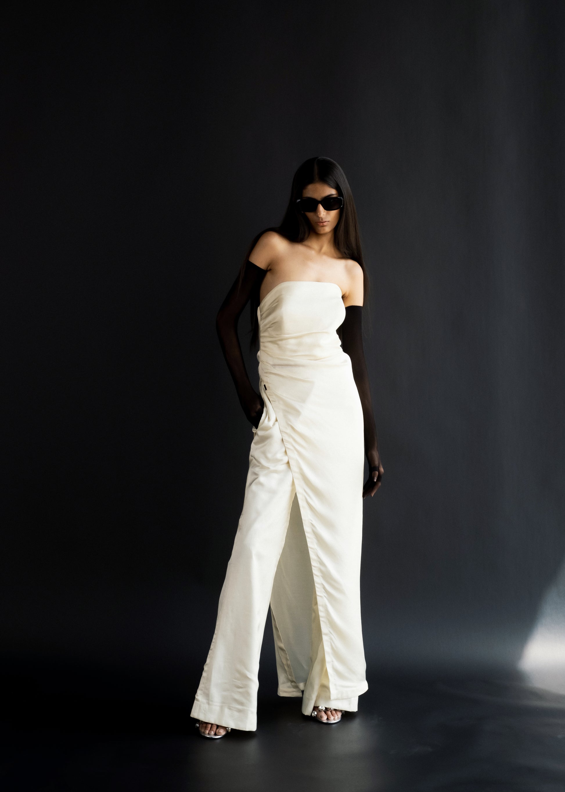 The off-shoulder satin corset asymmertcial top paired with flared pants offers a modern interpretation of classic femininity. The corset top, crafted from luxurious satin fabric accentuates the décolletage and collarbones with its alluring off-shoulder neckline. The flared pants exude a sense of retro-inspired glamour, evoking a sense of effortless elegance.