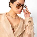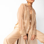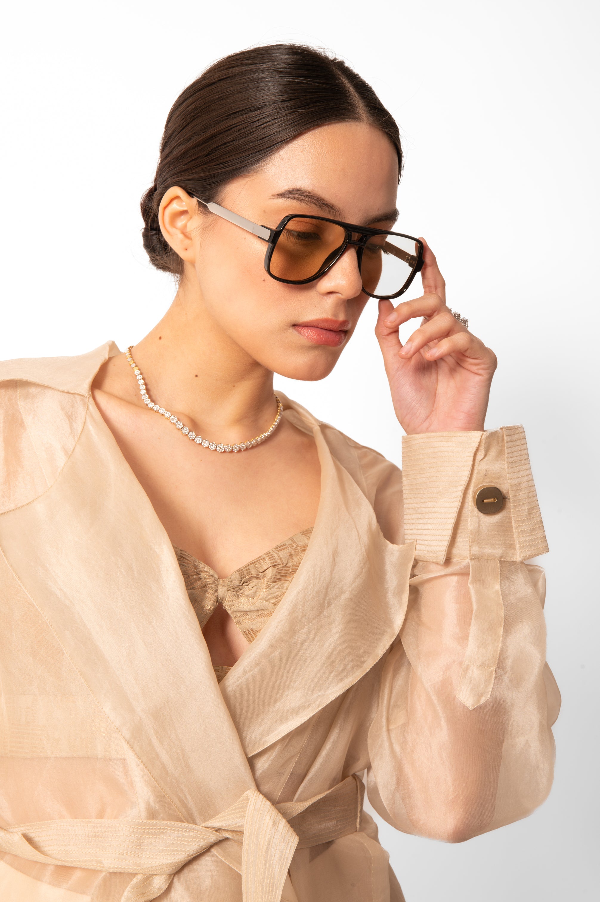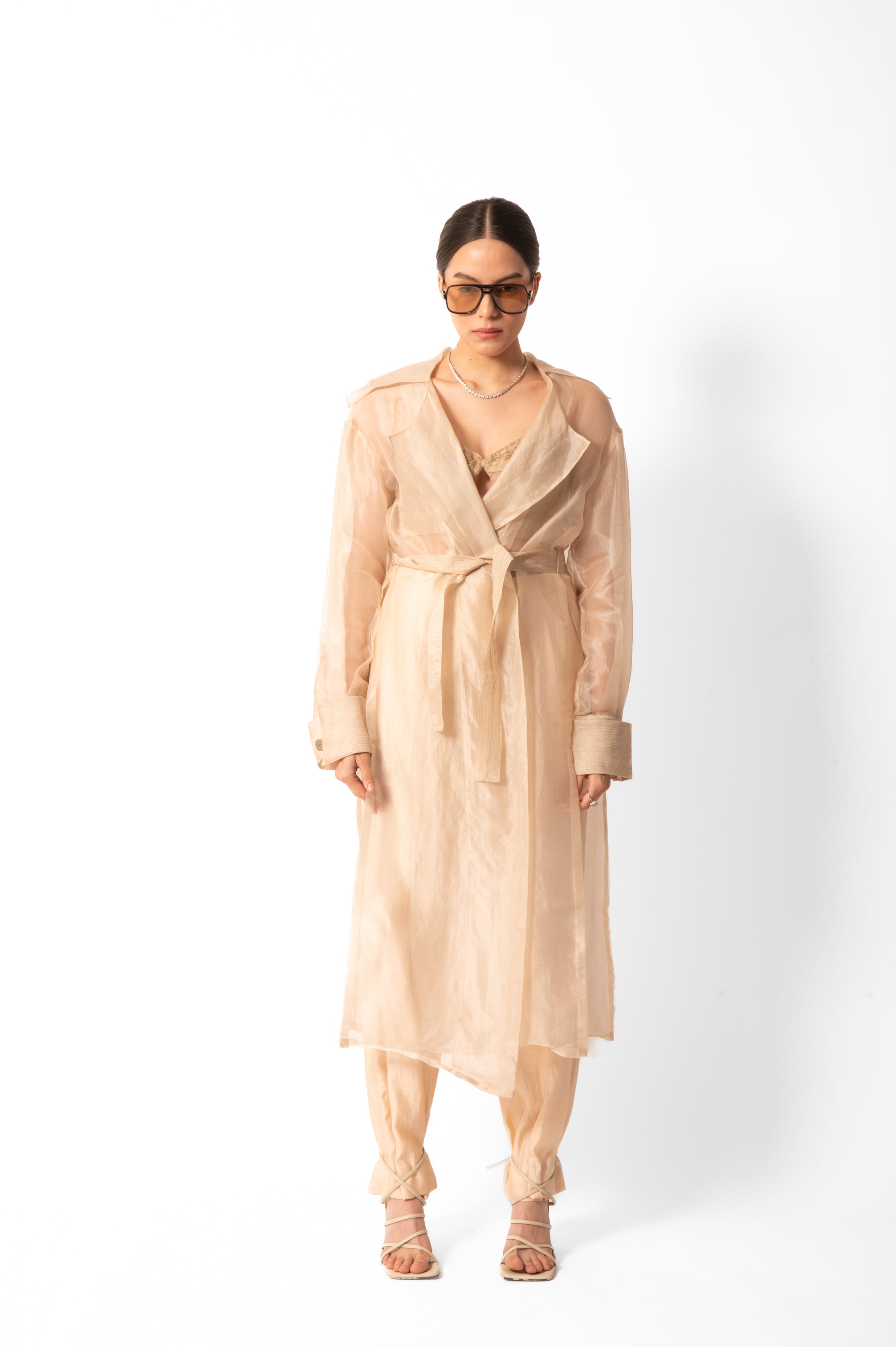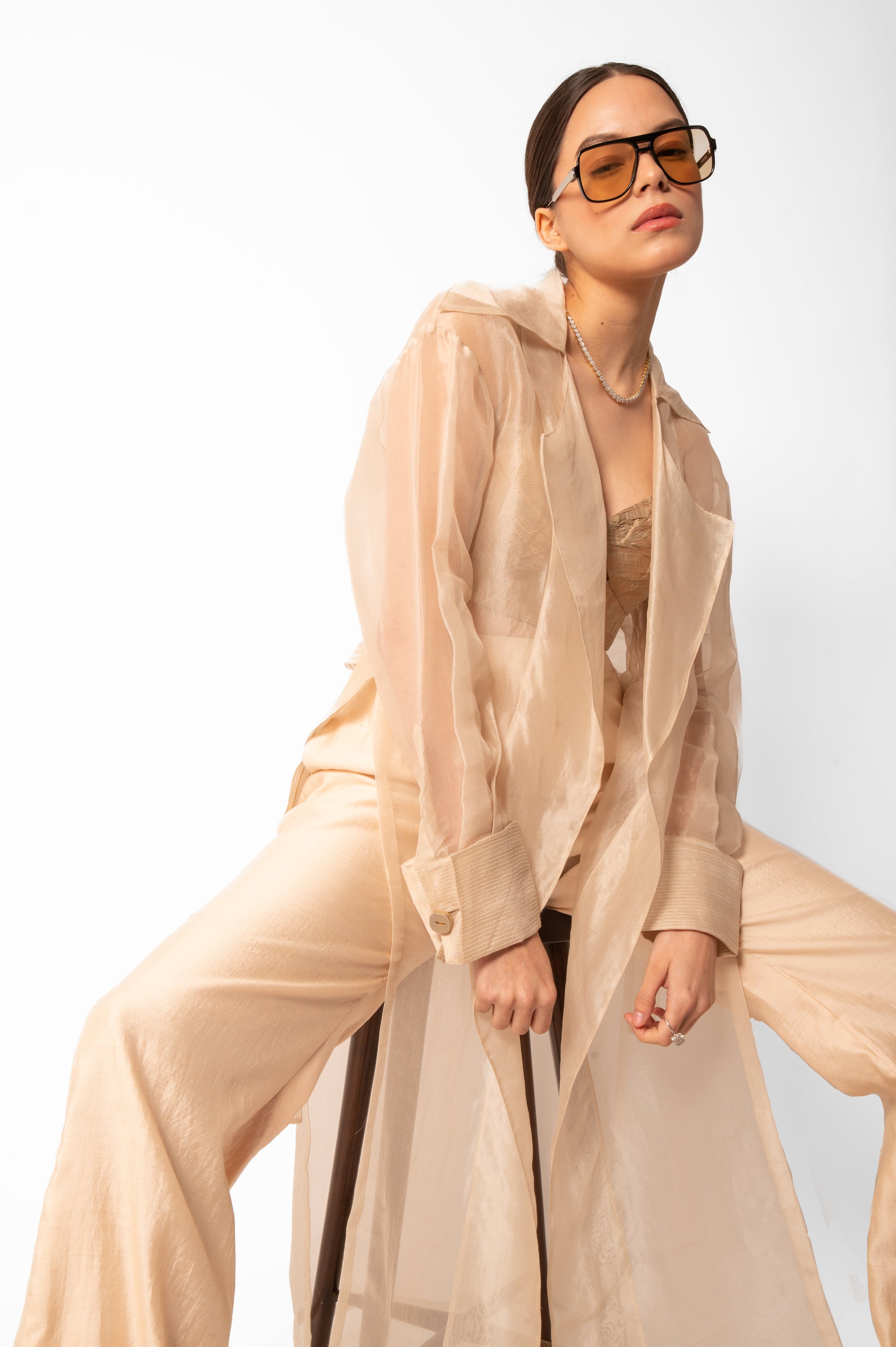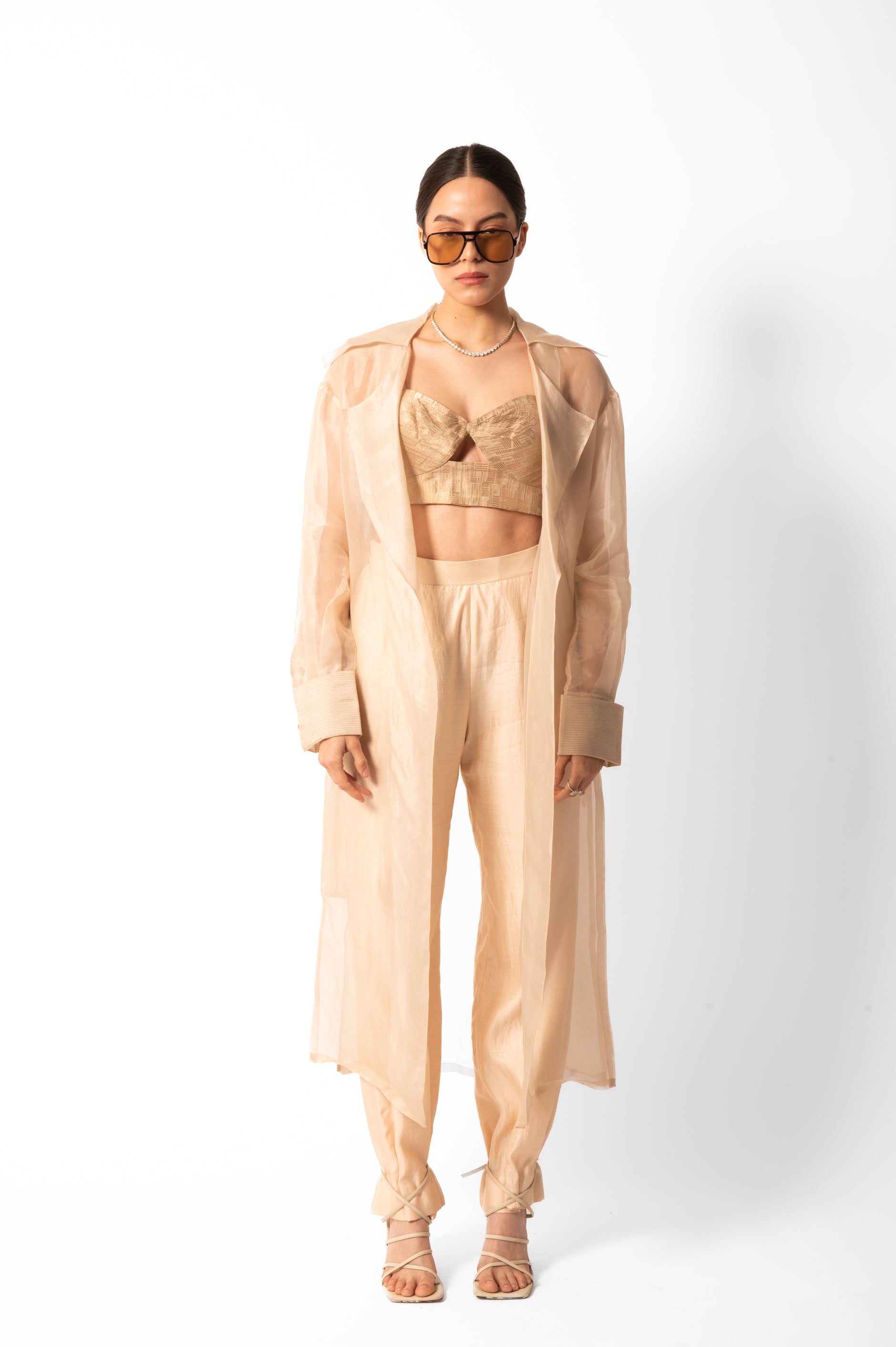 This chic tonal outfit is a great set to have for the summer. The subtle shine in the Corset & the oversized organza trench makes it formal enough to carry this from desk to dinner. Recommend pairing it with chunky earrings & a statement bag.