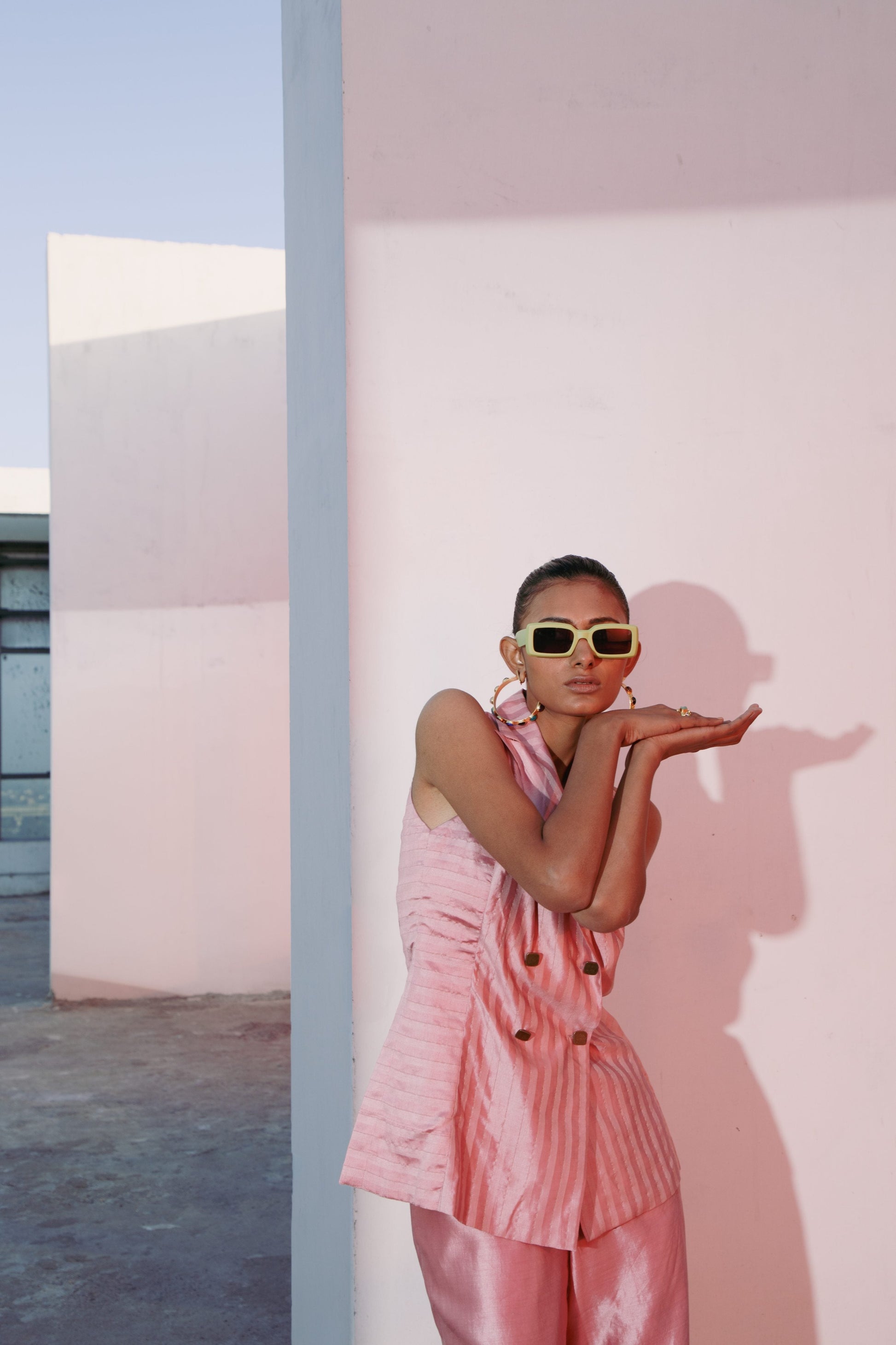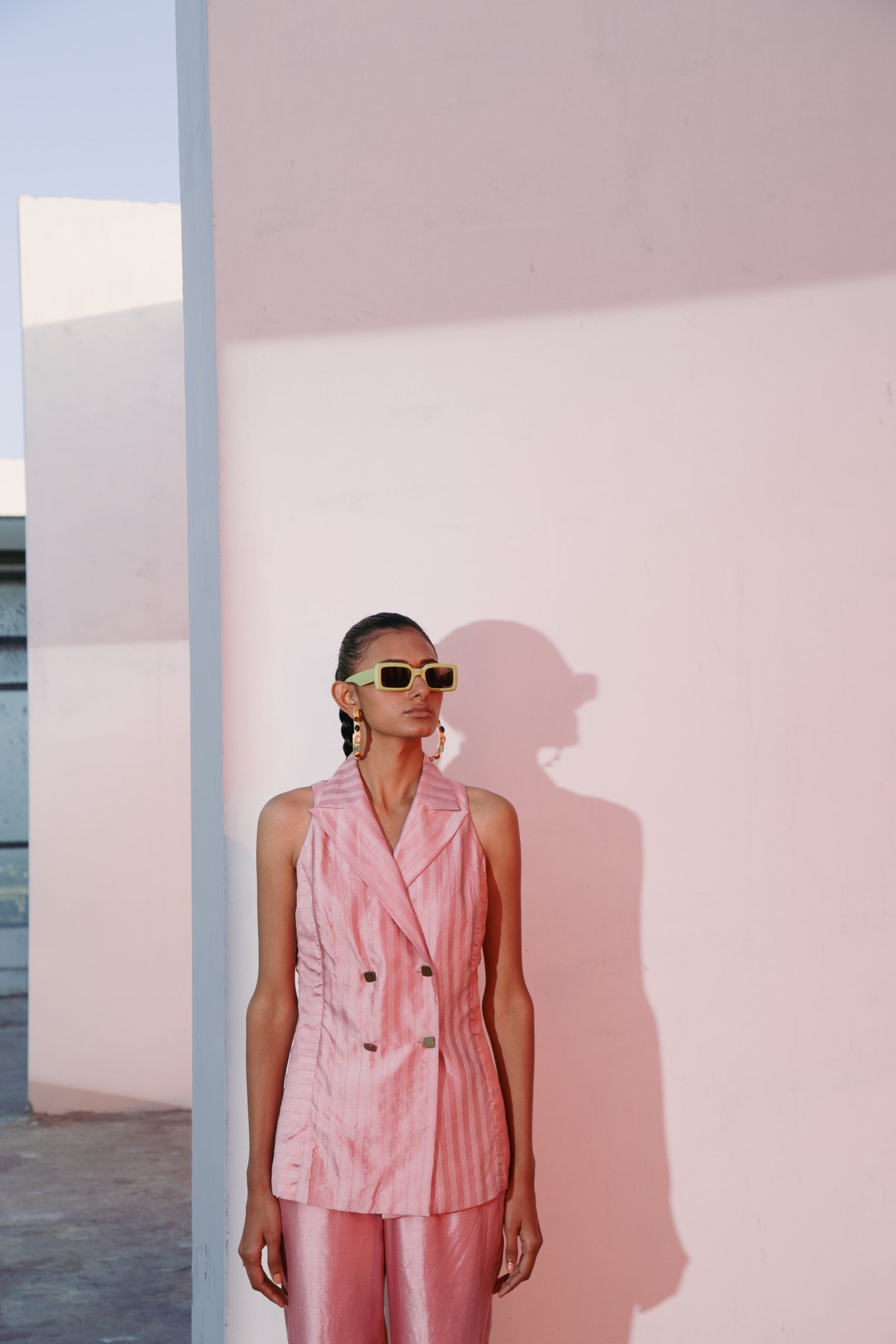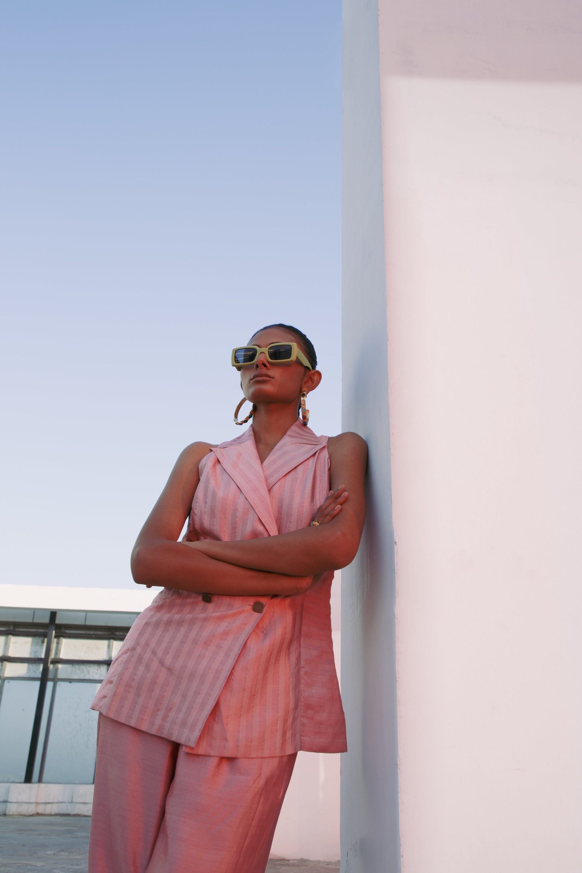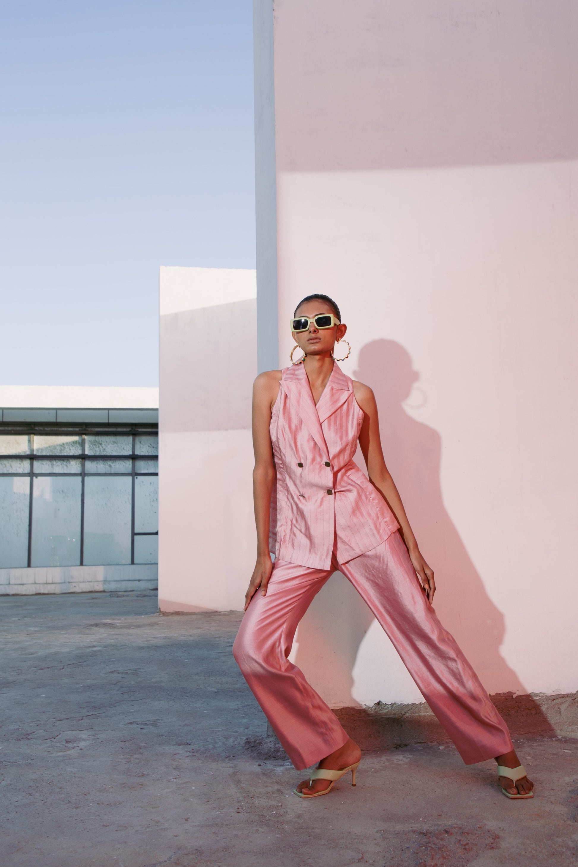 This pastel color double breasted set is a perfect transition for a work to event outfit. the lapel collar waistcoat look with straight silk trousers makes it business casual and chic. Recommend pairing it up with bold sunglasses and a top handle bag.