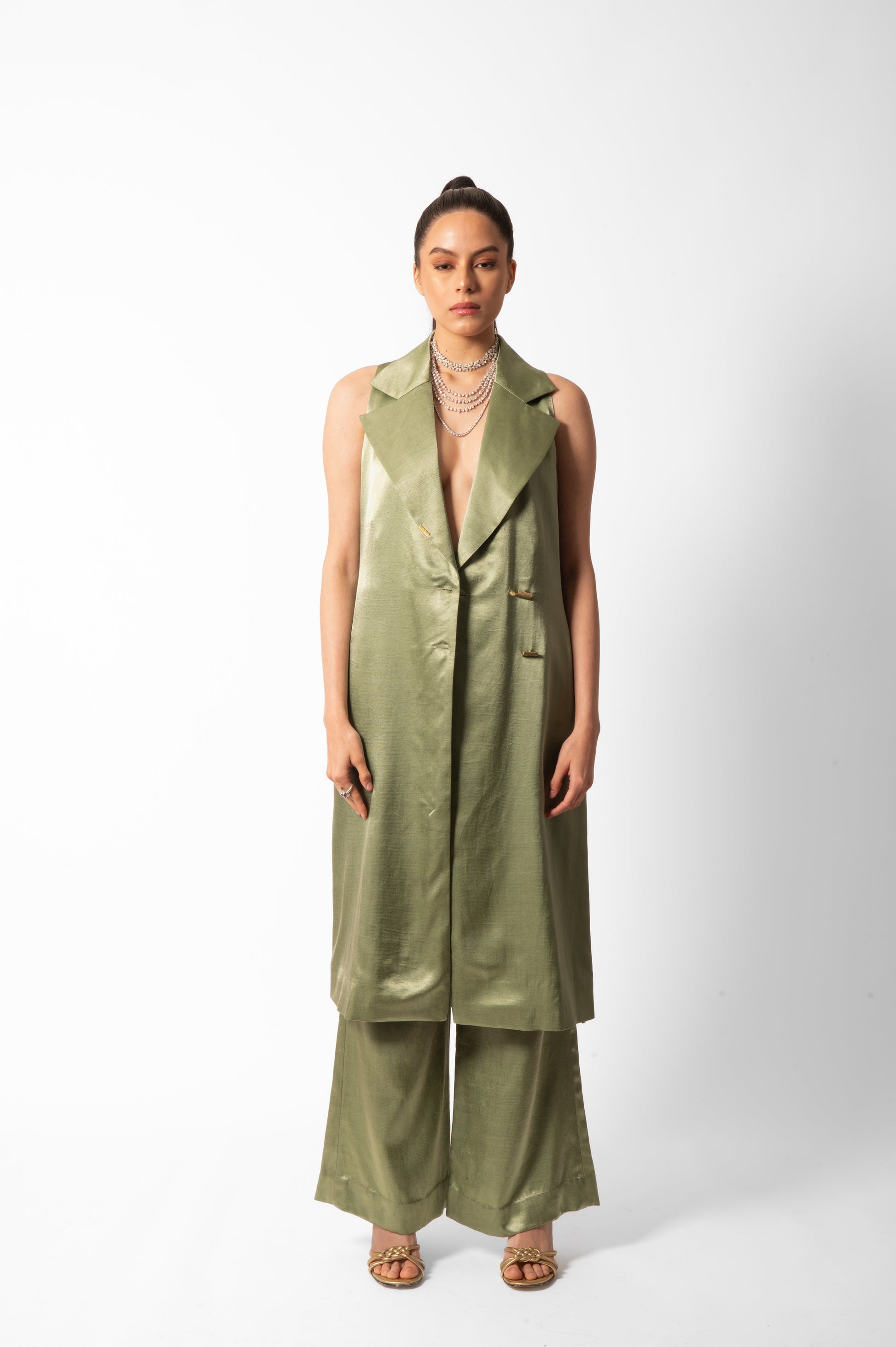 This Stylish Jacket Set Is A Perfect Event Outfit. The Lapel Collar Vest Look With Heavy Straight Silk Trousers Makes It Business Casual And Chic. Recommend Pairing It Up With Bold Jewellery And A Top Handle Bag.