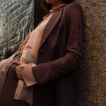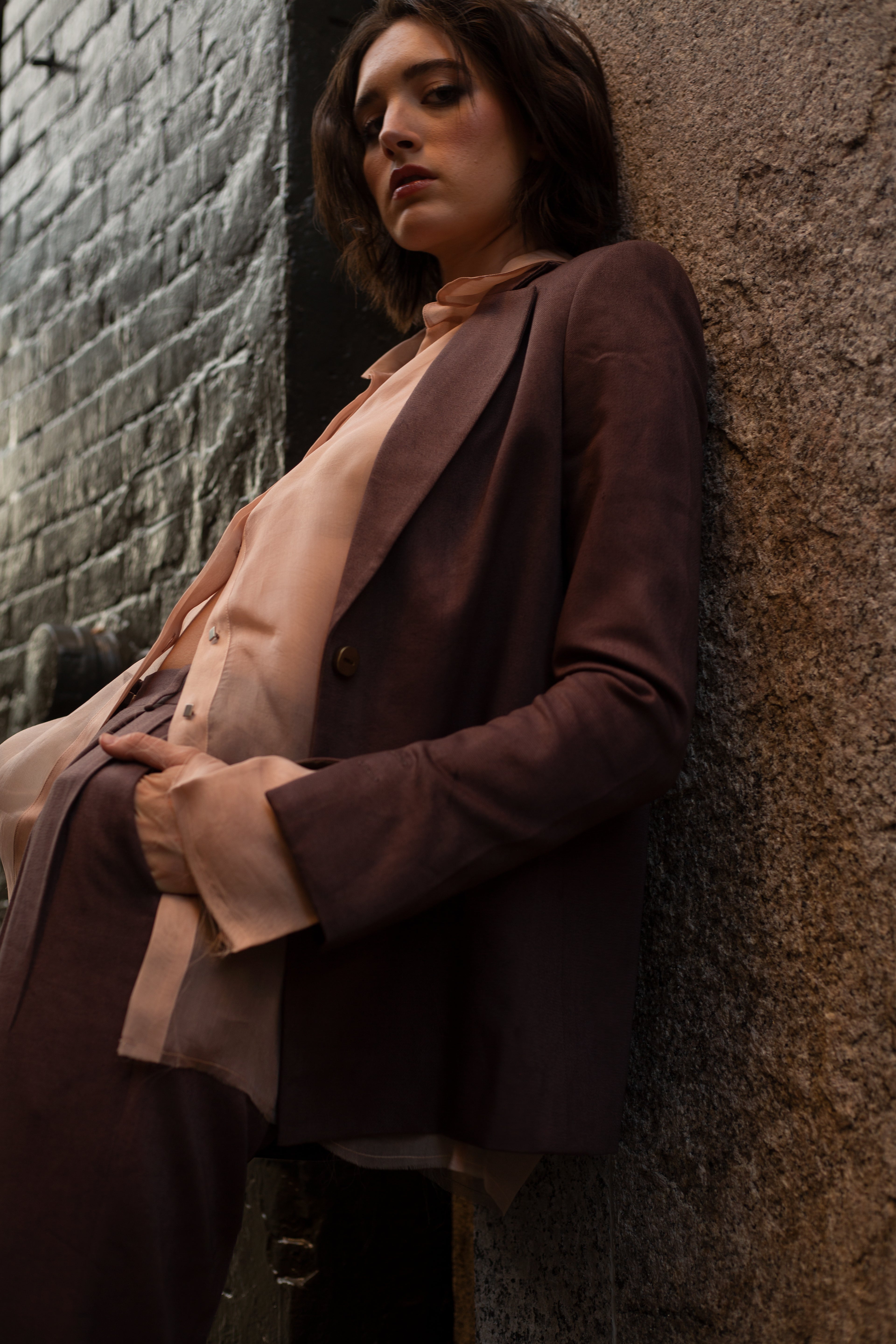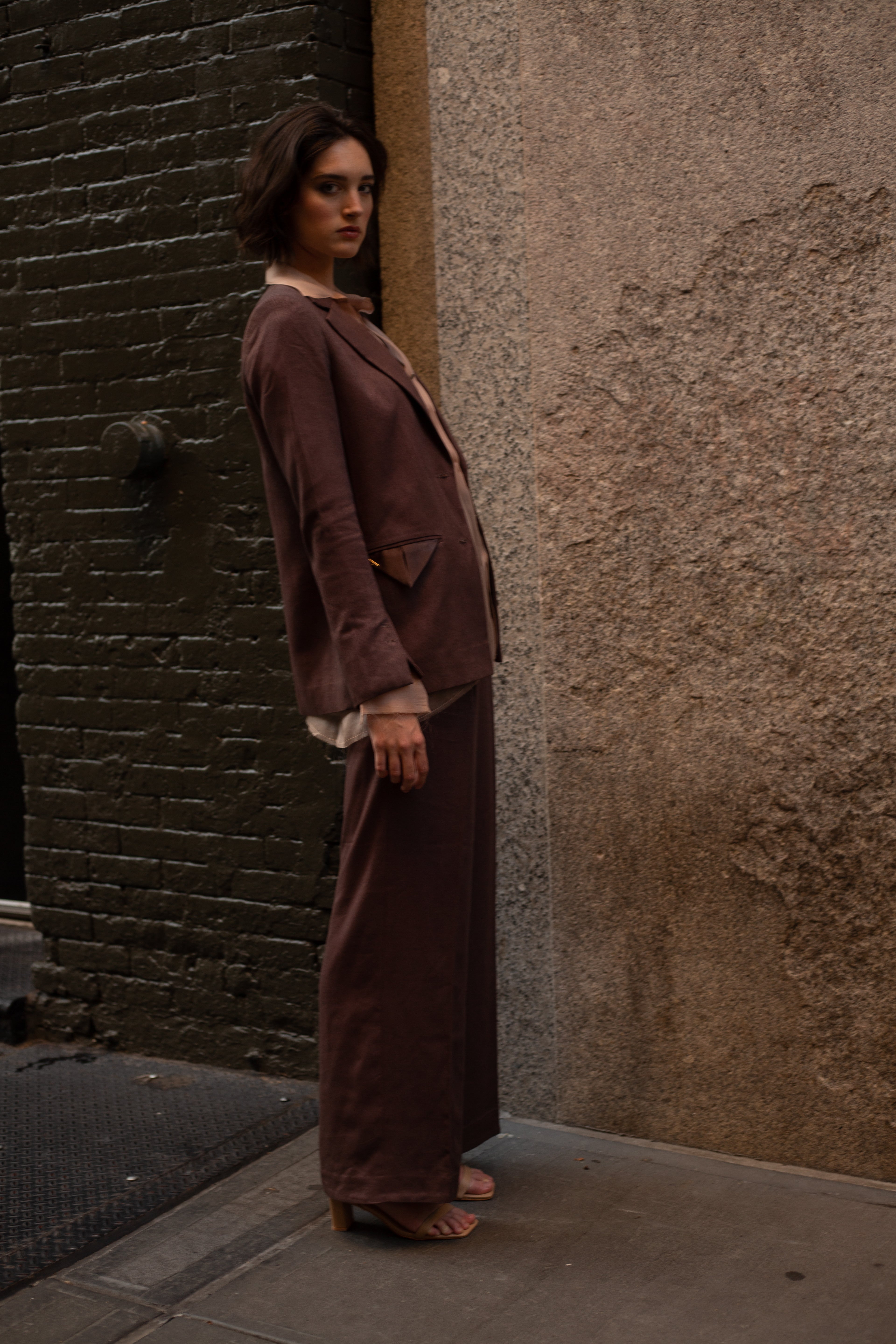 Imagine a commanding and assertive pantsuit that exudes confidence and strength. This pantsuit is meticulously crafted in a sophisticated gray-brown shade, lending it a timeless appeal that seamlessly bridges the gap between classic and contemporary fashion. The shade carries an air of seriousness, perfect for making a bold statement in professional or upscale settings.