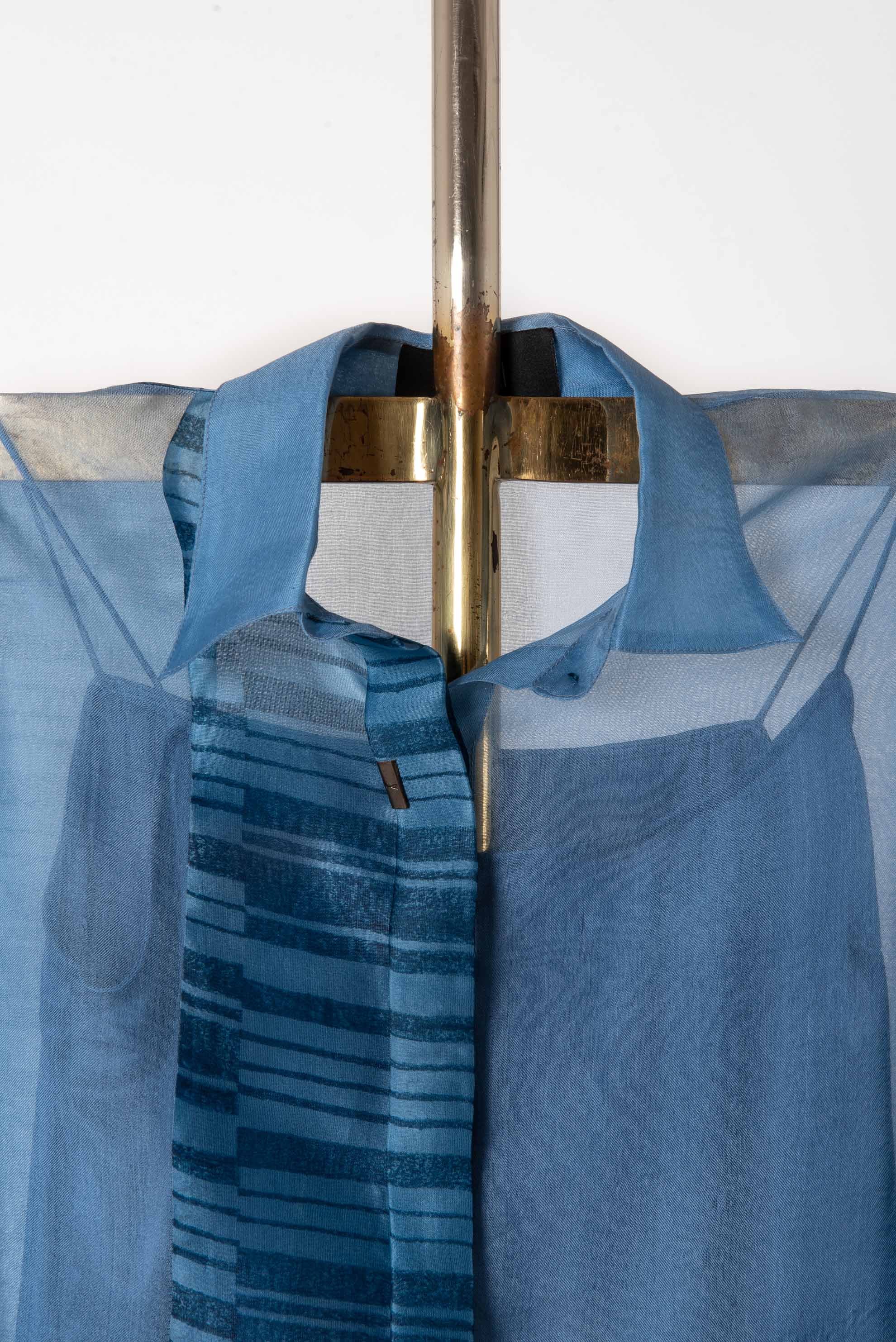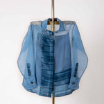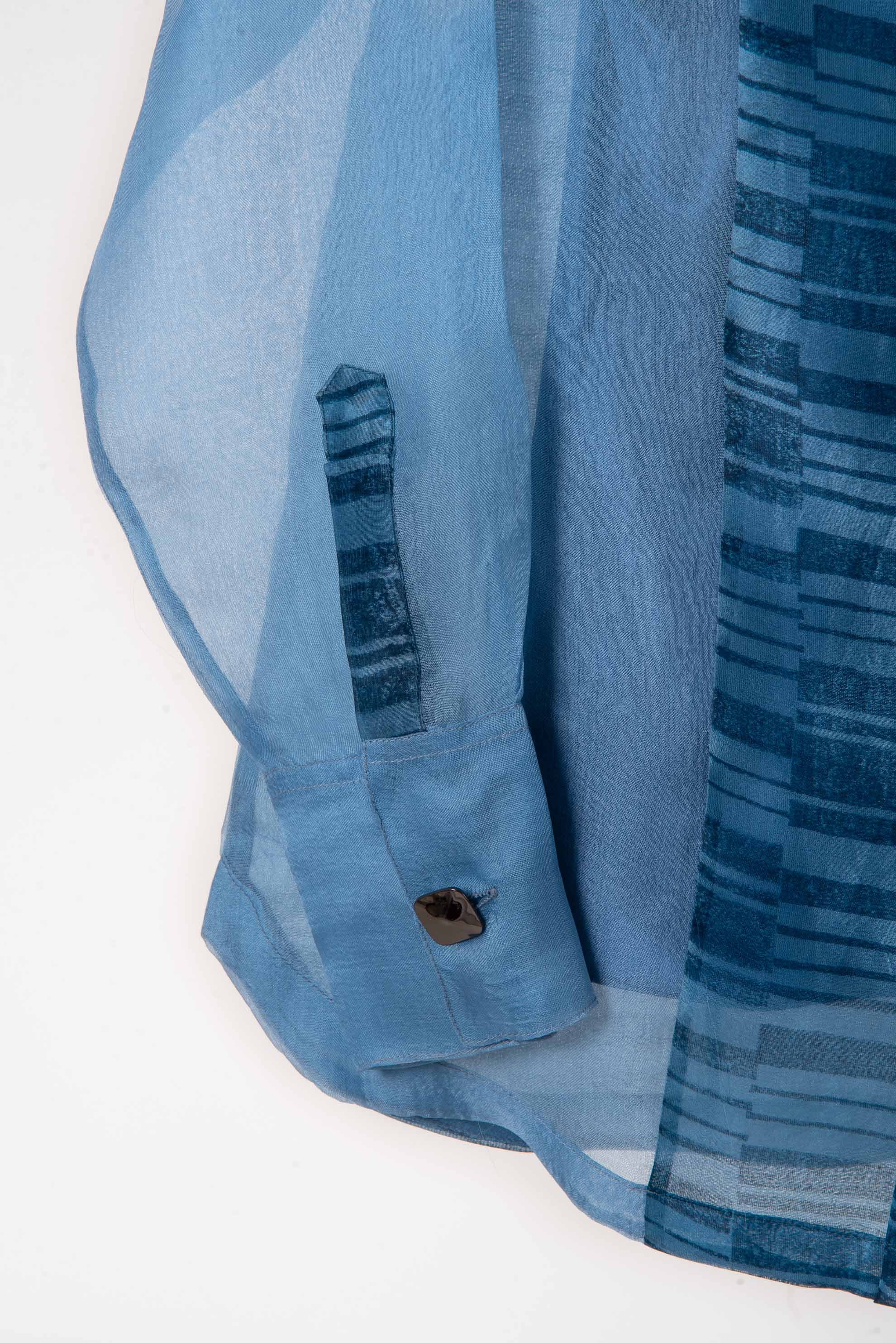 This hand blocked asymmetric seam organza shirt is a great add-on for day parties or brunches. Recommend pairing it with denim or formal tonal trousers and accessorize according to the occasion.