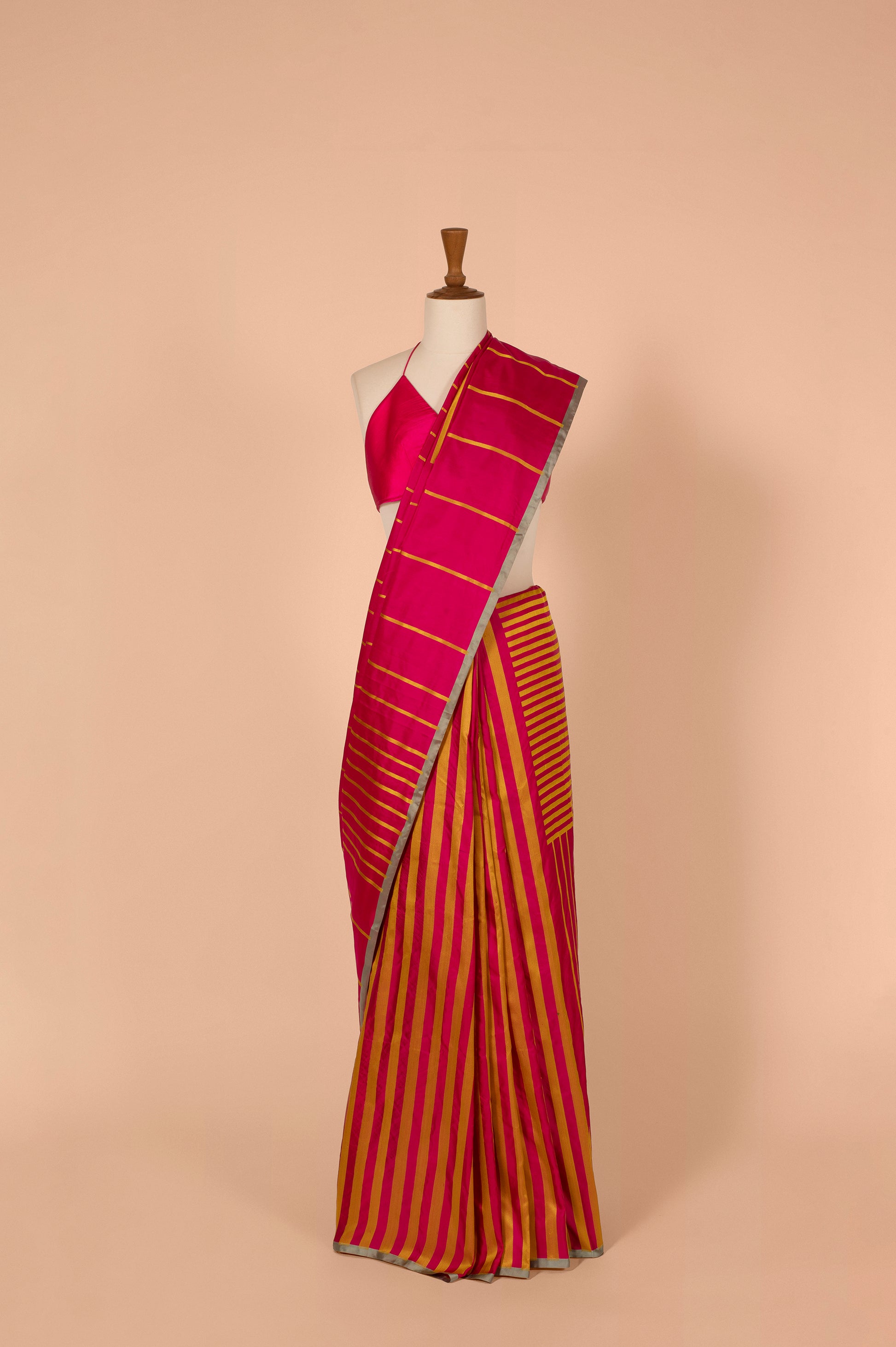 Handwoven In Benaras, This Displaced Stripe Satin Saree When Paired With A Chic Blouse, Makes A Perfect Outfit For A Cocktail Or A Night Out. Recommend Experimenting With The Drape & Wearing Statement Earrings To Stand Out.