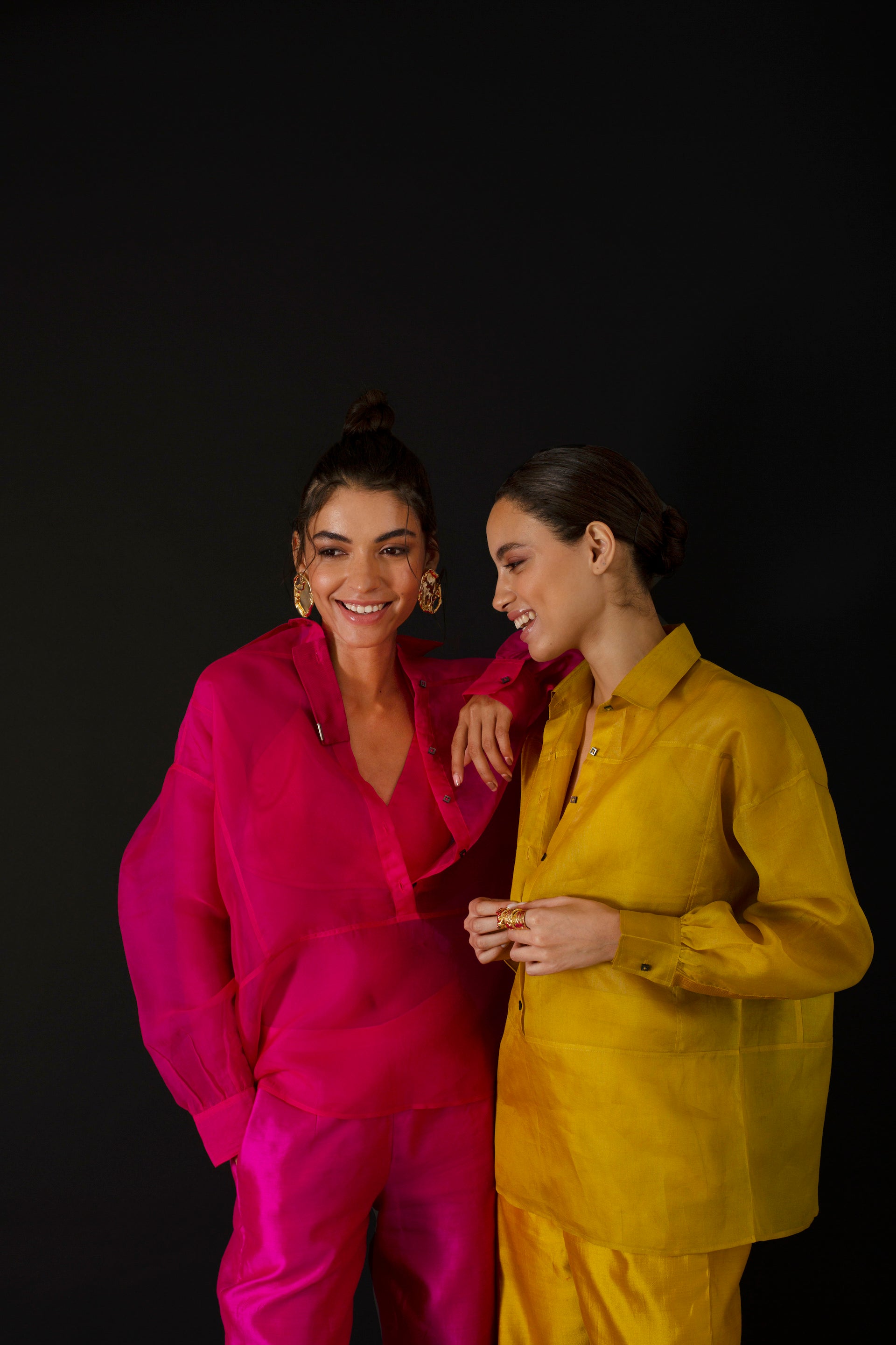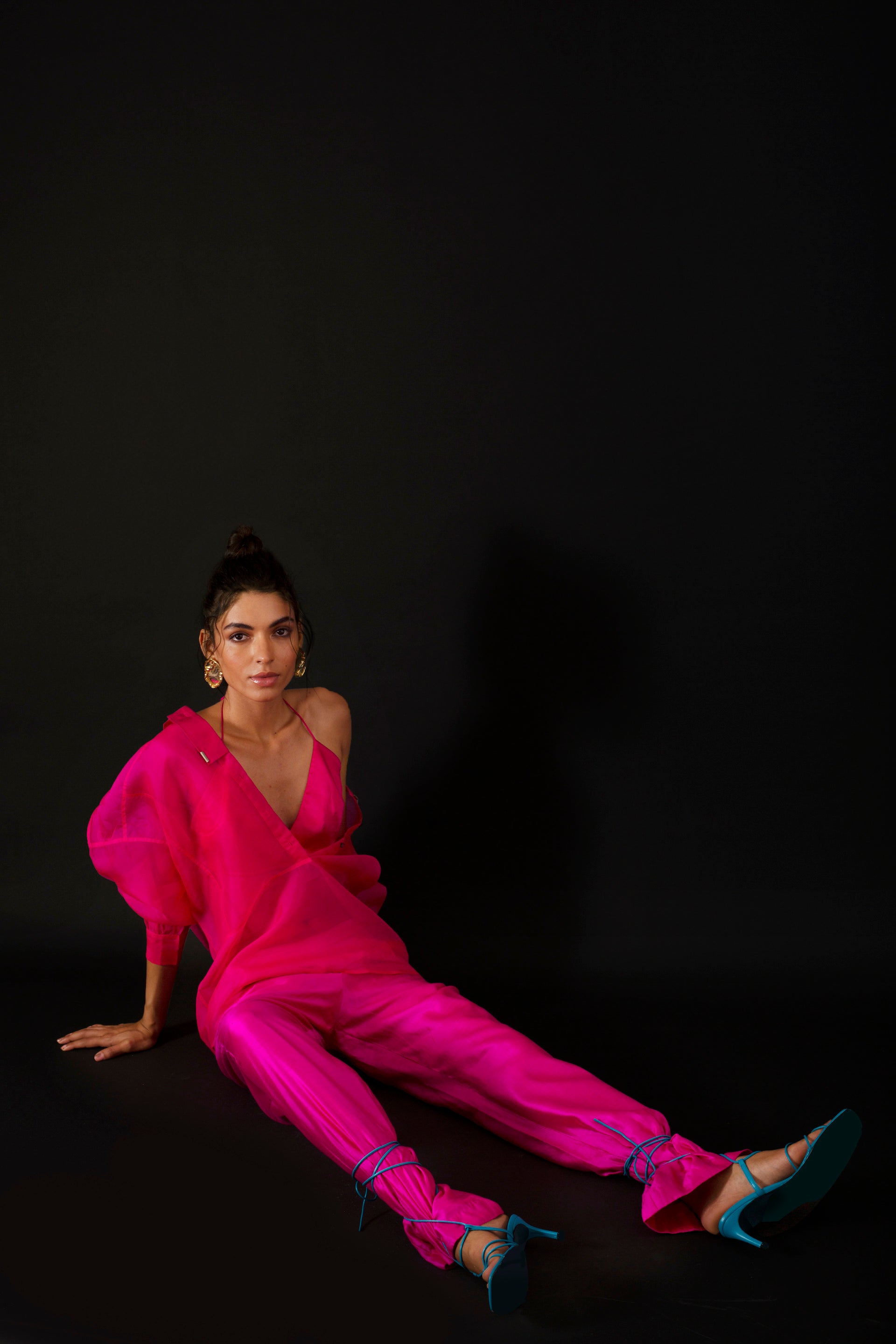 This pop coloured co-ordinate set is a great outfit for a night out with friends or an event. The multiseam, oversize organza shirt with straight leg silk trousers & a halter bralette make it young & glamorous. Recommend pairing it up with contrast coloured strappy heels & a singular piece of chunky jewellery.