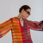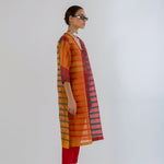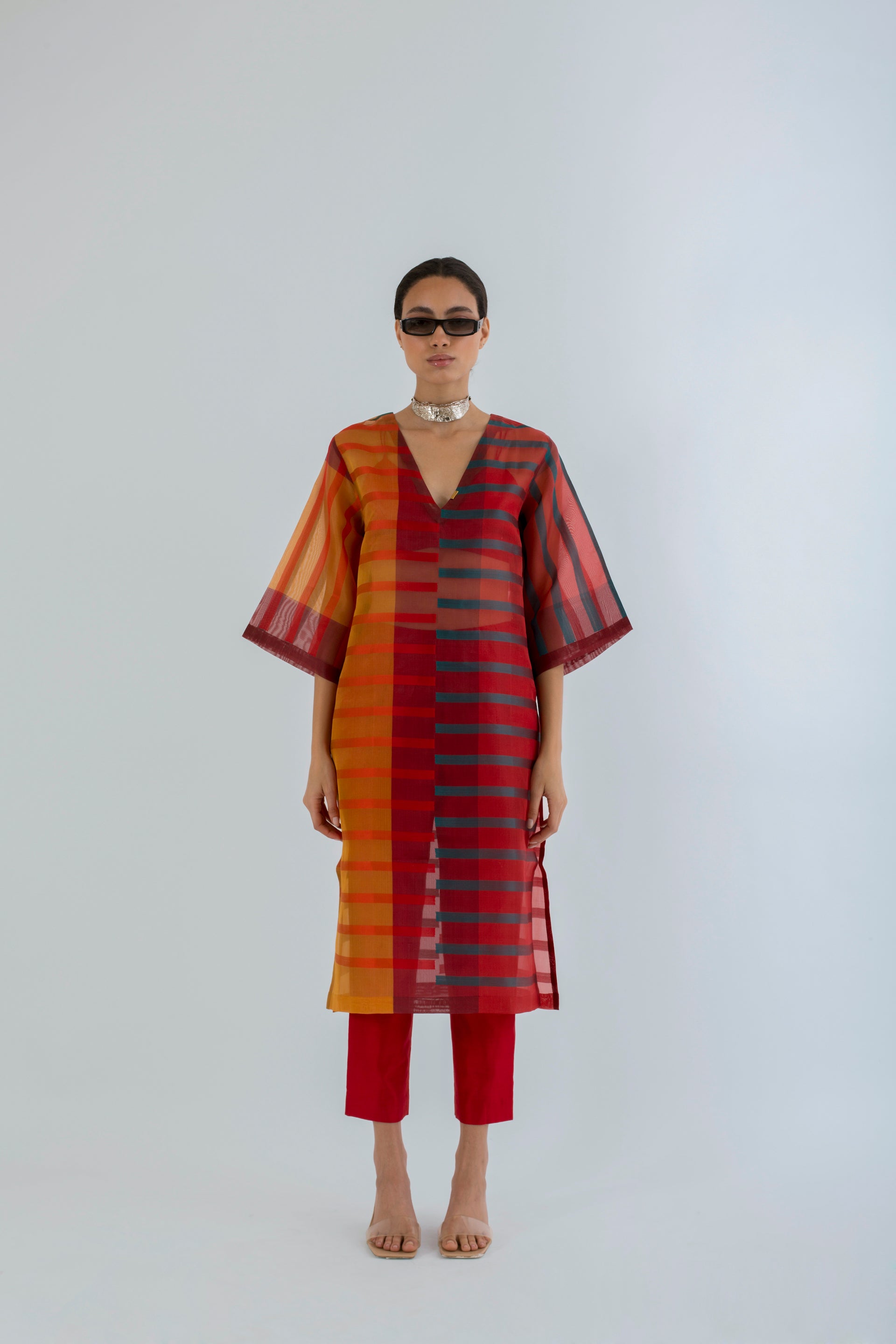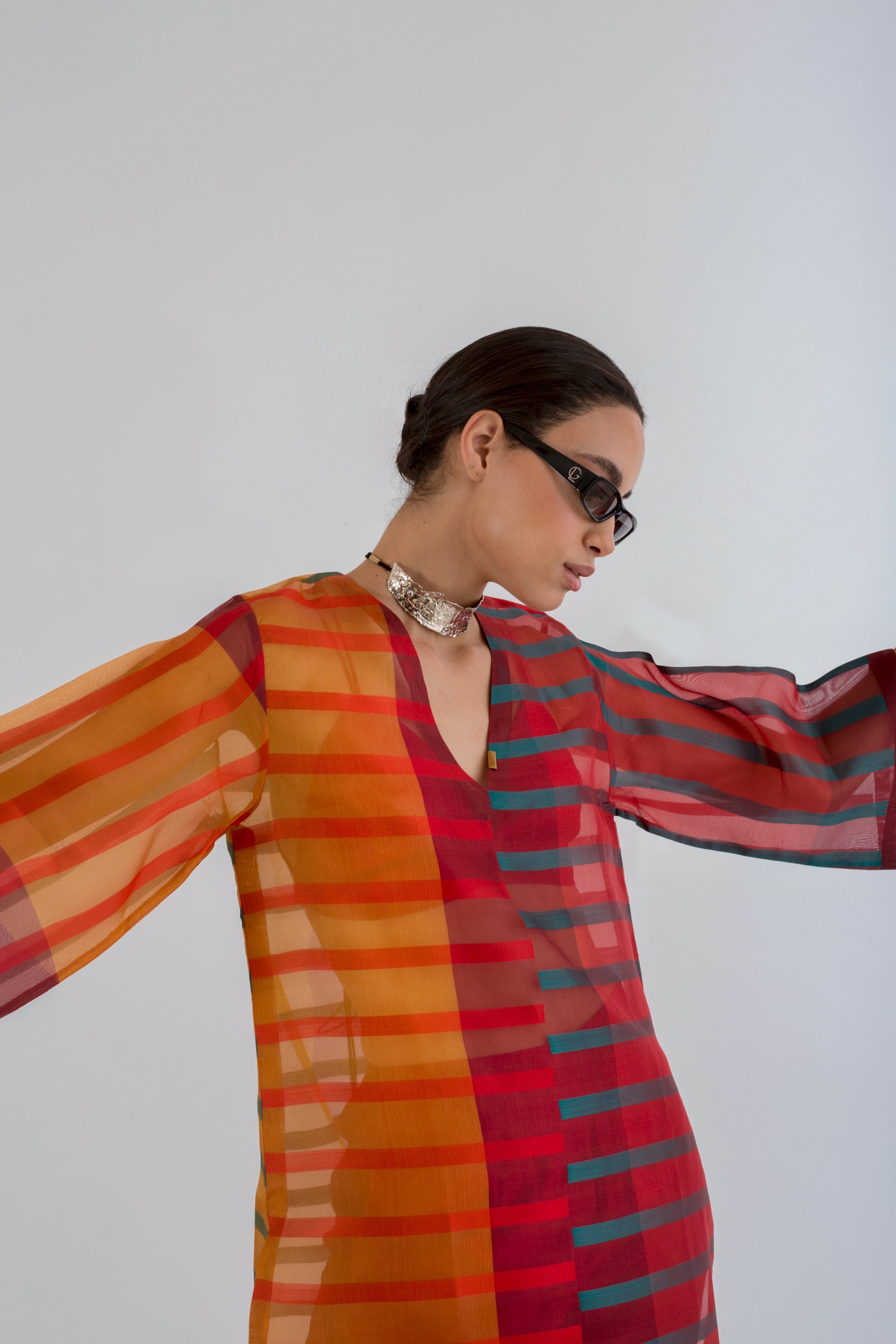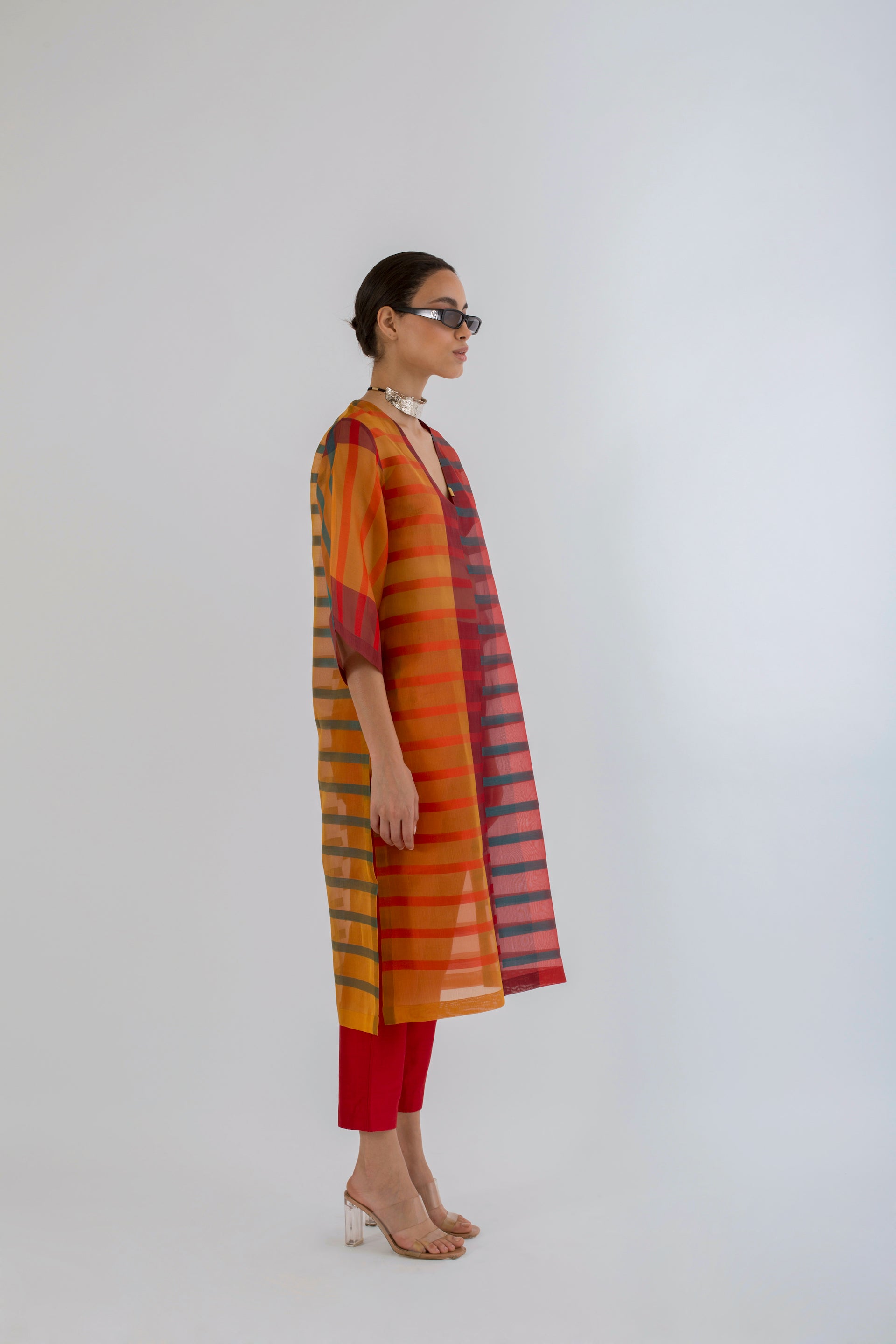 Handwoven in Banaras, this colourblocked organza oversize shirt is a great outfit for parties & lunches. The look of a sheer organza over shirt with cigarette trousers & a strappy bralette is modern & young. When accessorized well it makes a great day-to-night look.
