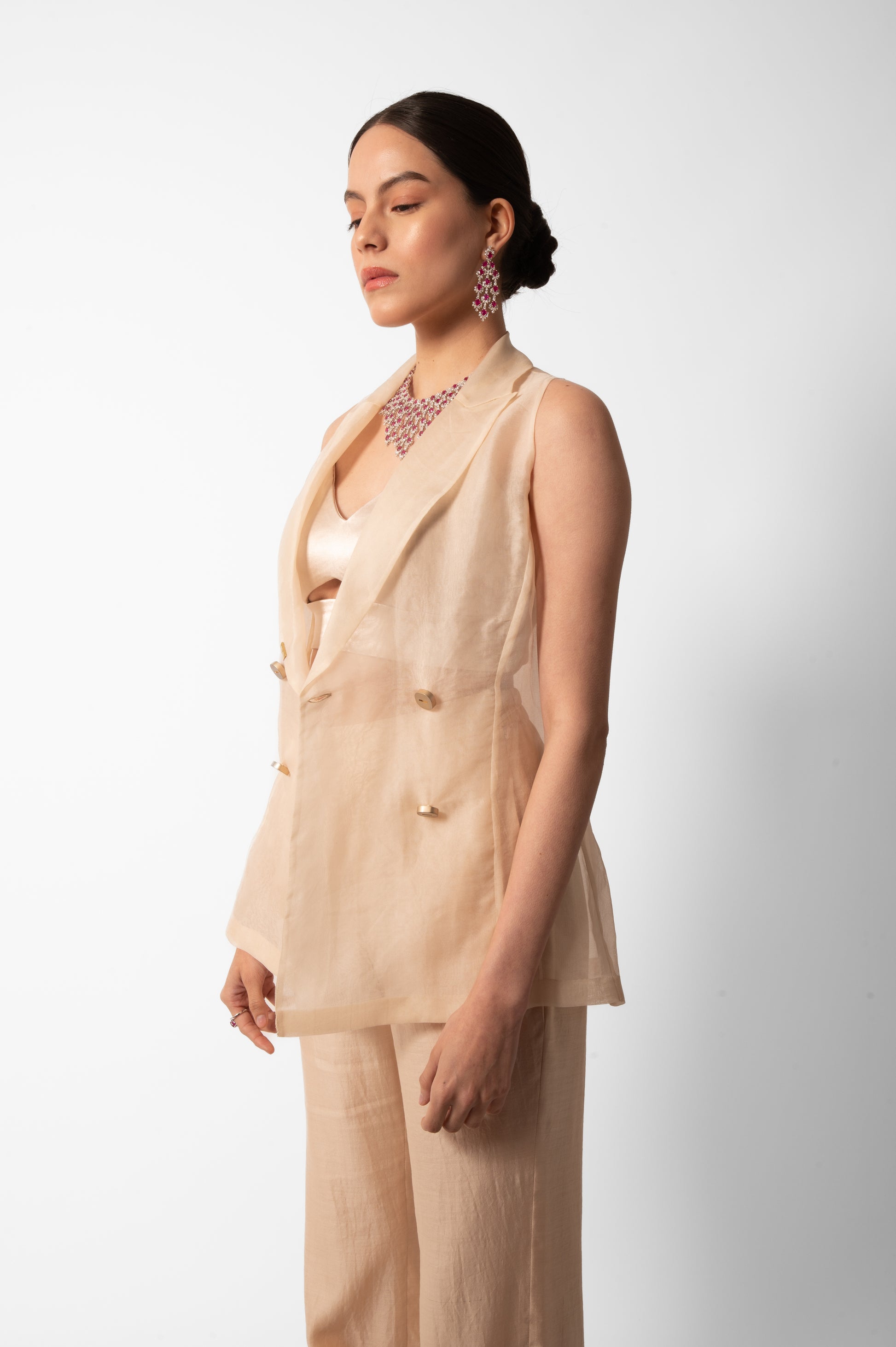 This classic double breasted set is a perfect outfit for a work to event transition. The lapel collar organza vest look with straight silk trousers makes it business casual and chic. Recommend pairing it up with bold jewellery and a top handle bag.