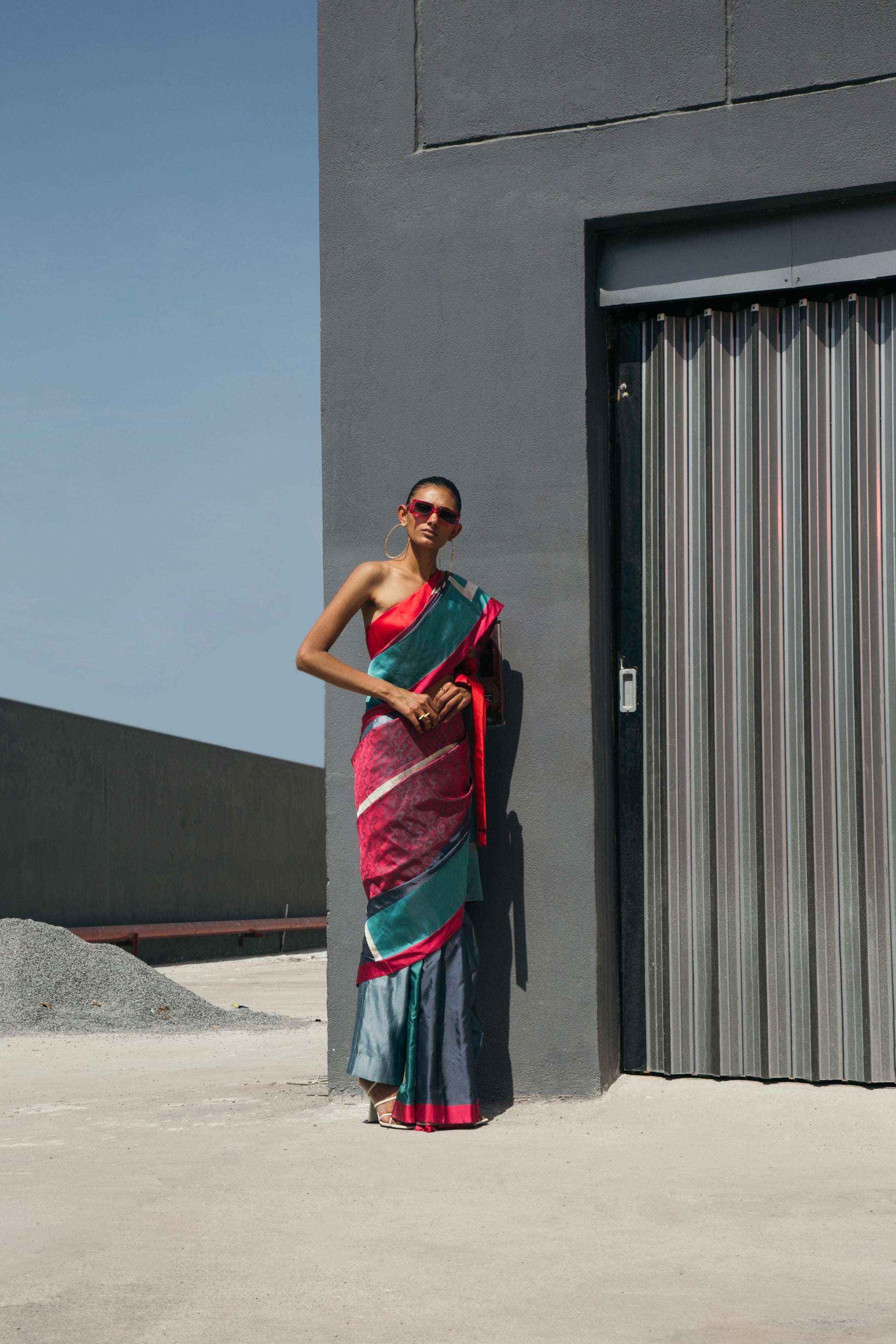 Handwoven in Banaras, this pop colorblocked sari is a fun piece to experiment with. The psychedelic colors throughout the body make it an exciting outfit for an evening event. Recommend pairing it with a trendy blouse & experimental silver jewellery.