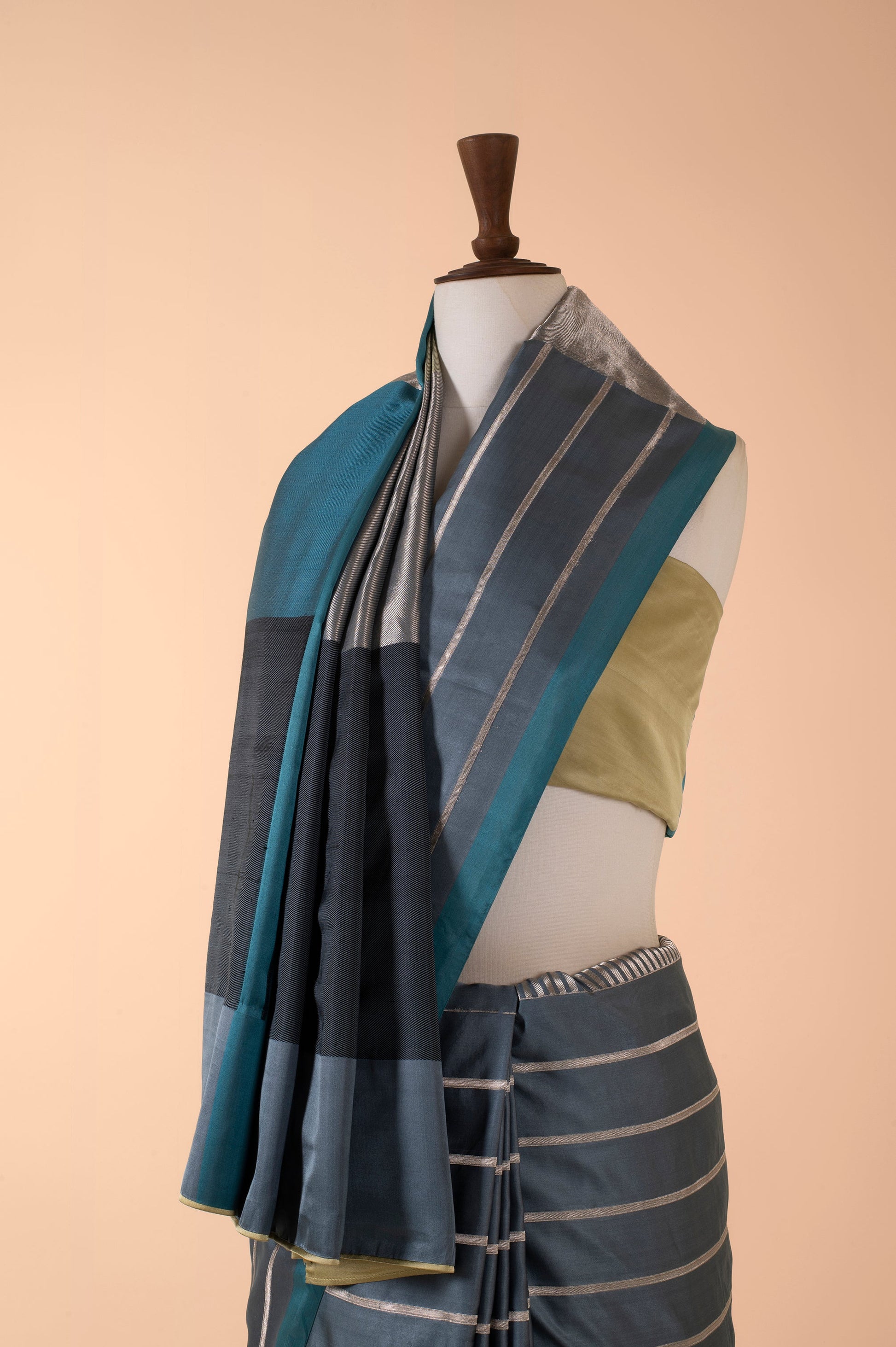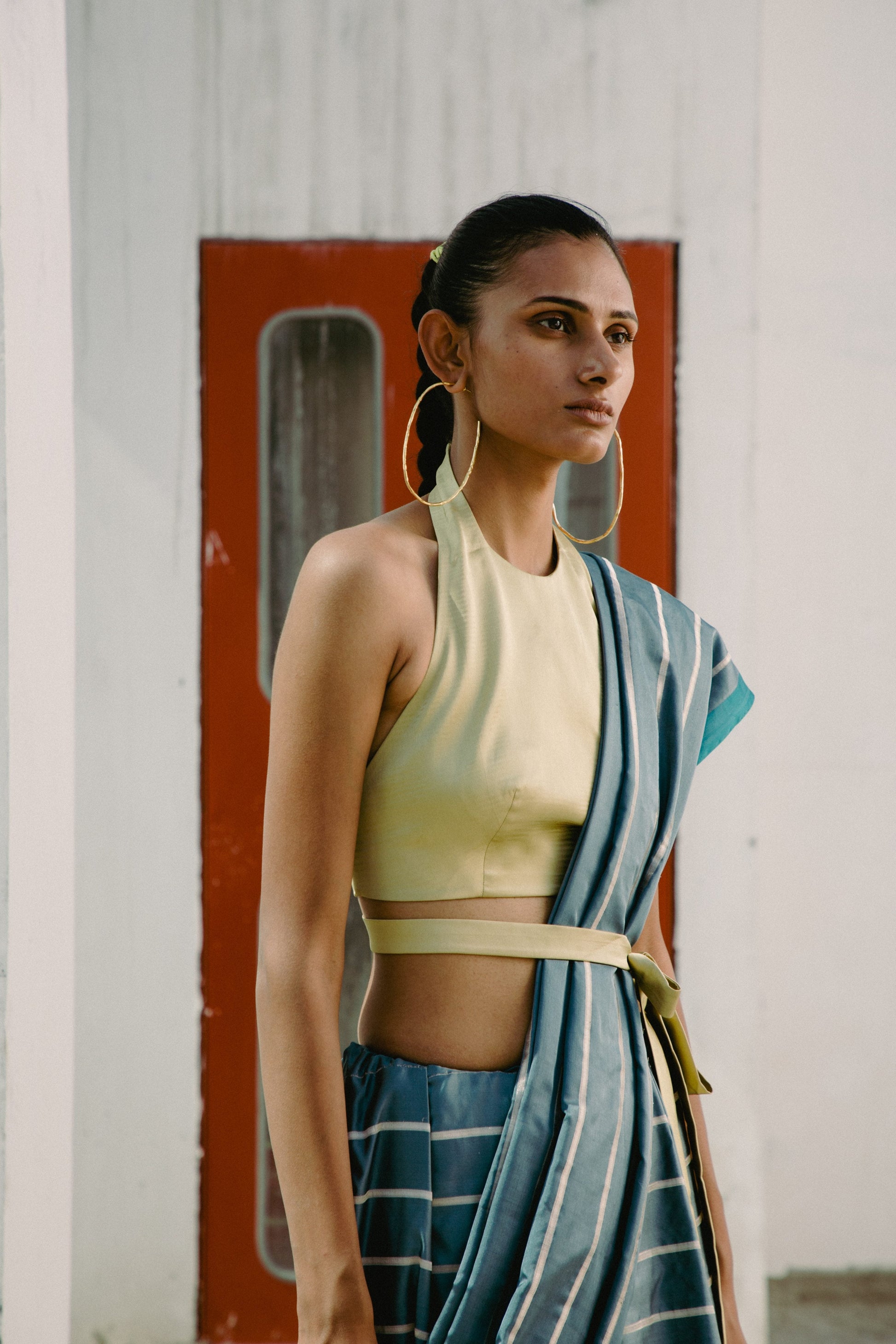 Handwoven in Banaras, this satin sari is a fun piece to experiment with. The fun color play at the pallu & the contrast blouse makes it a perfect outfit for attending events at galleries or parties. Recommend pairing it with experimental gold jewellery to enhance the subtle color.
