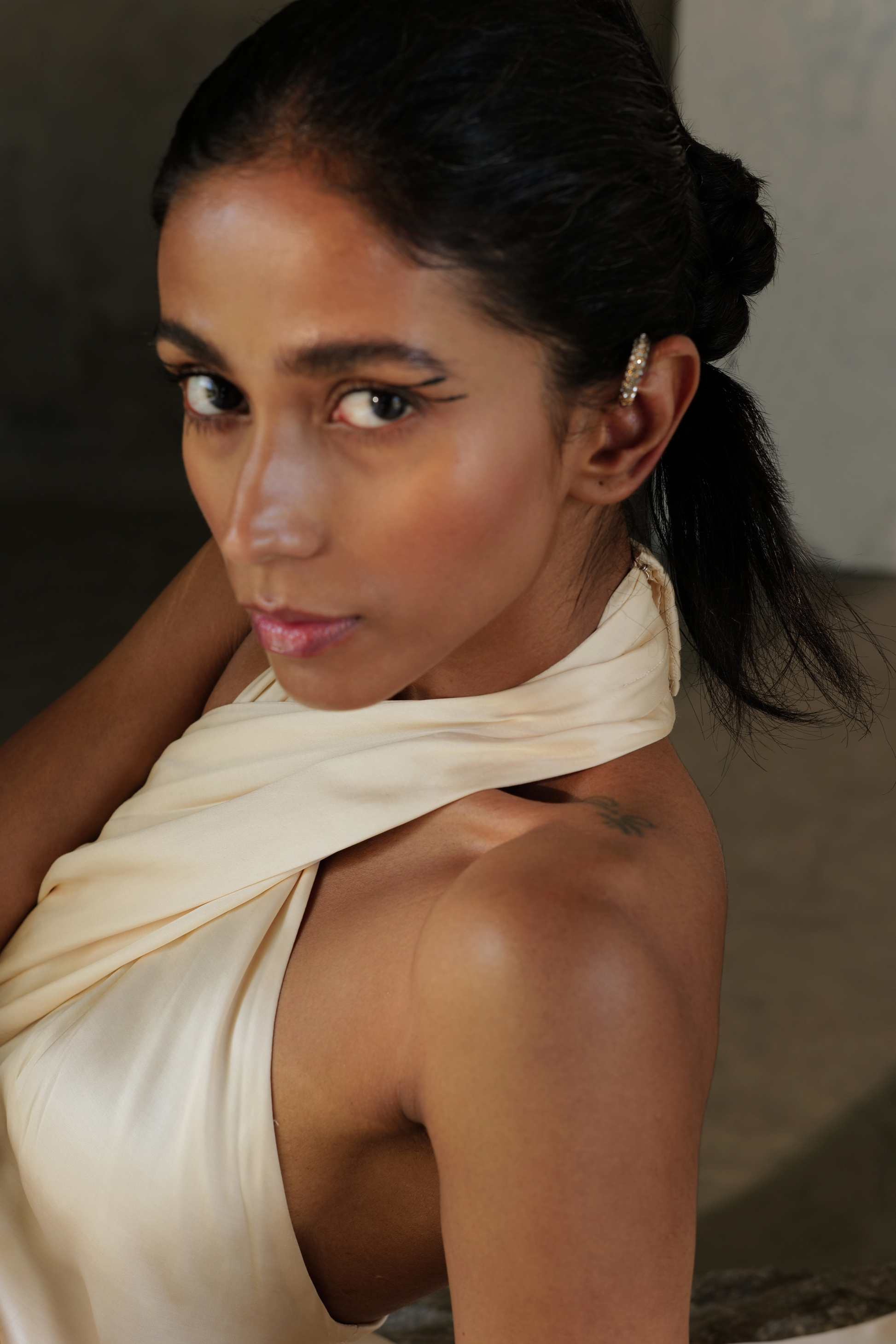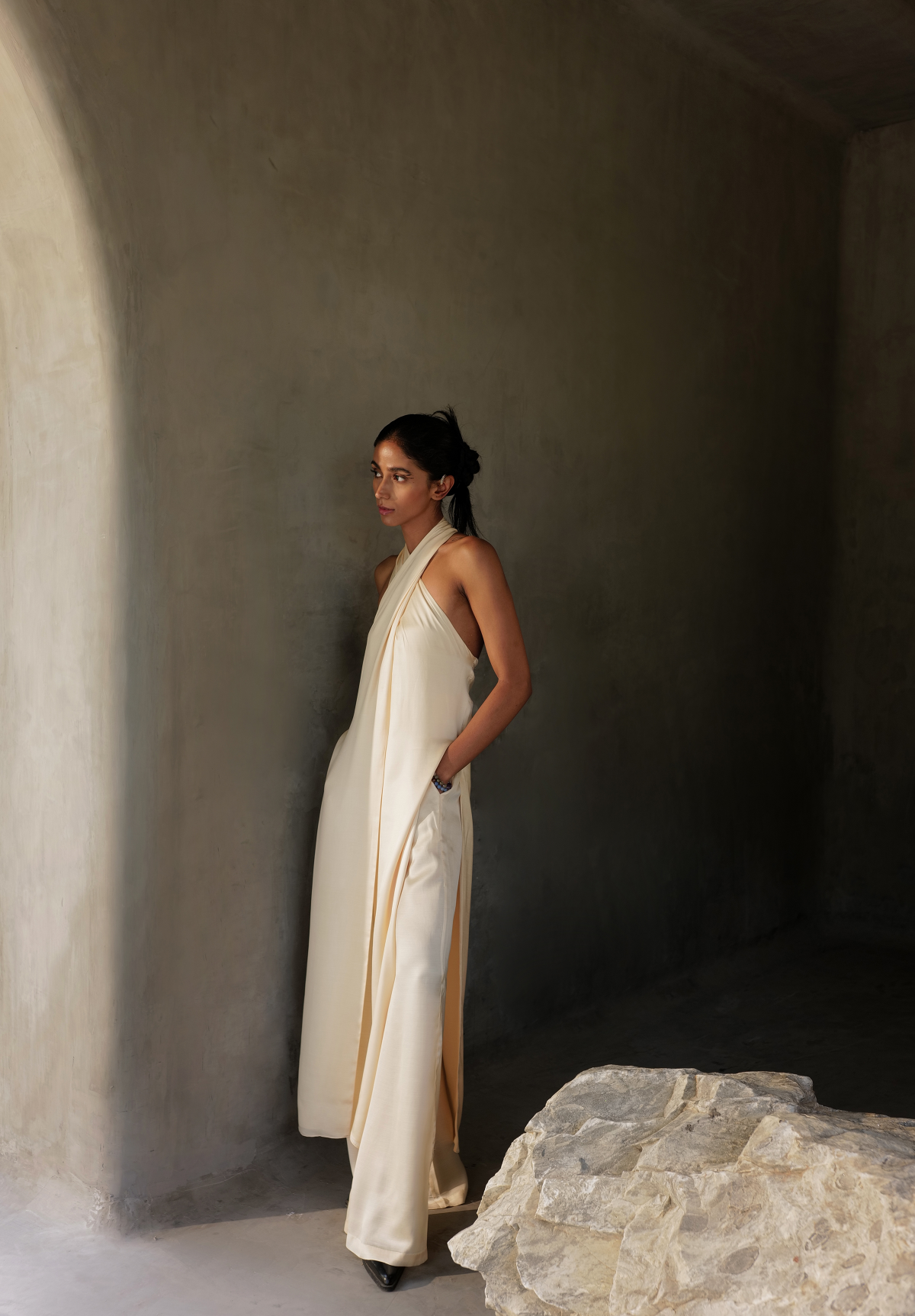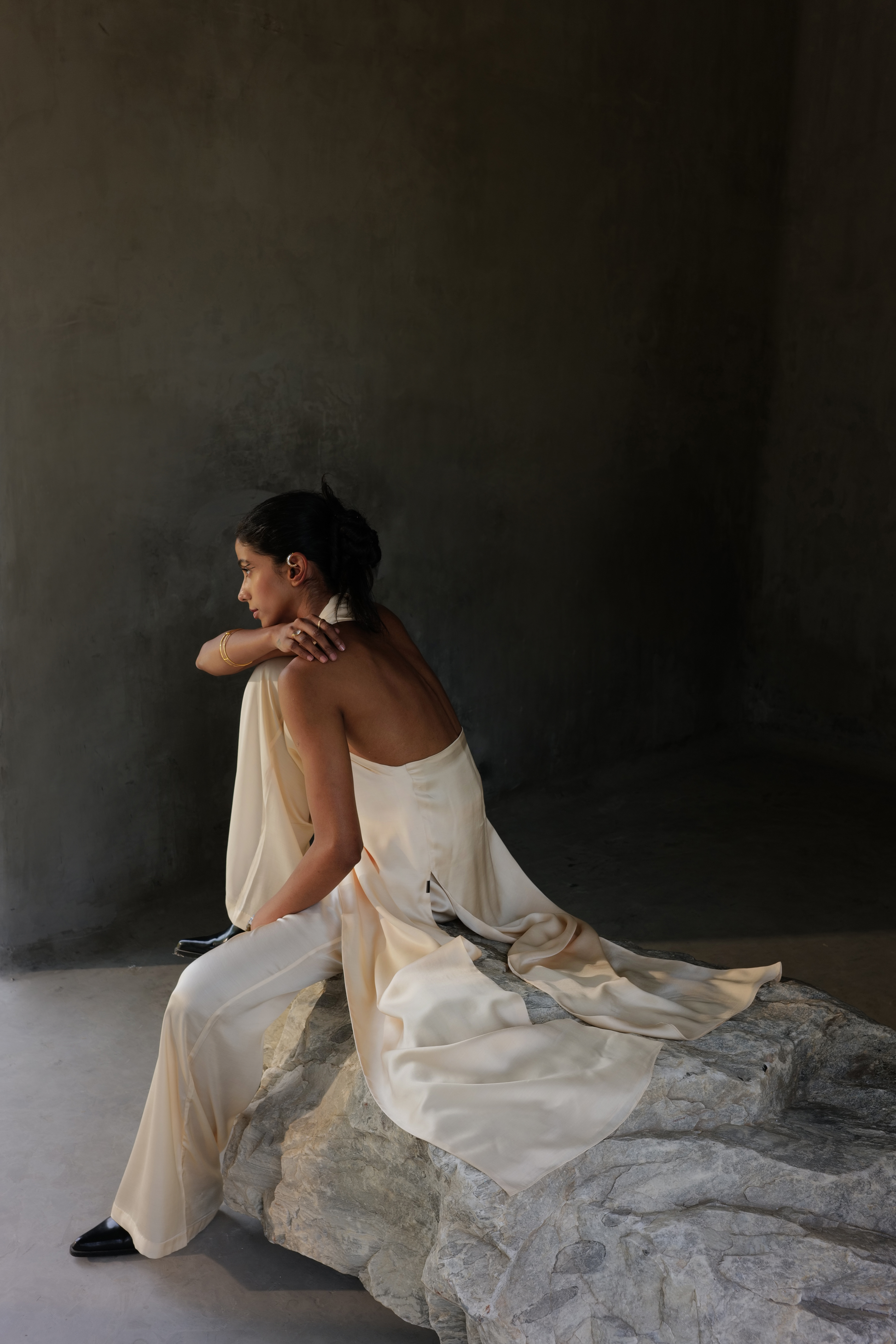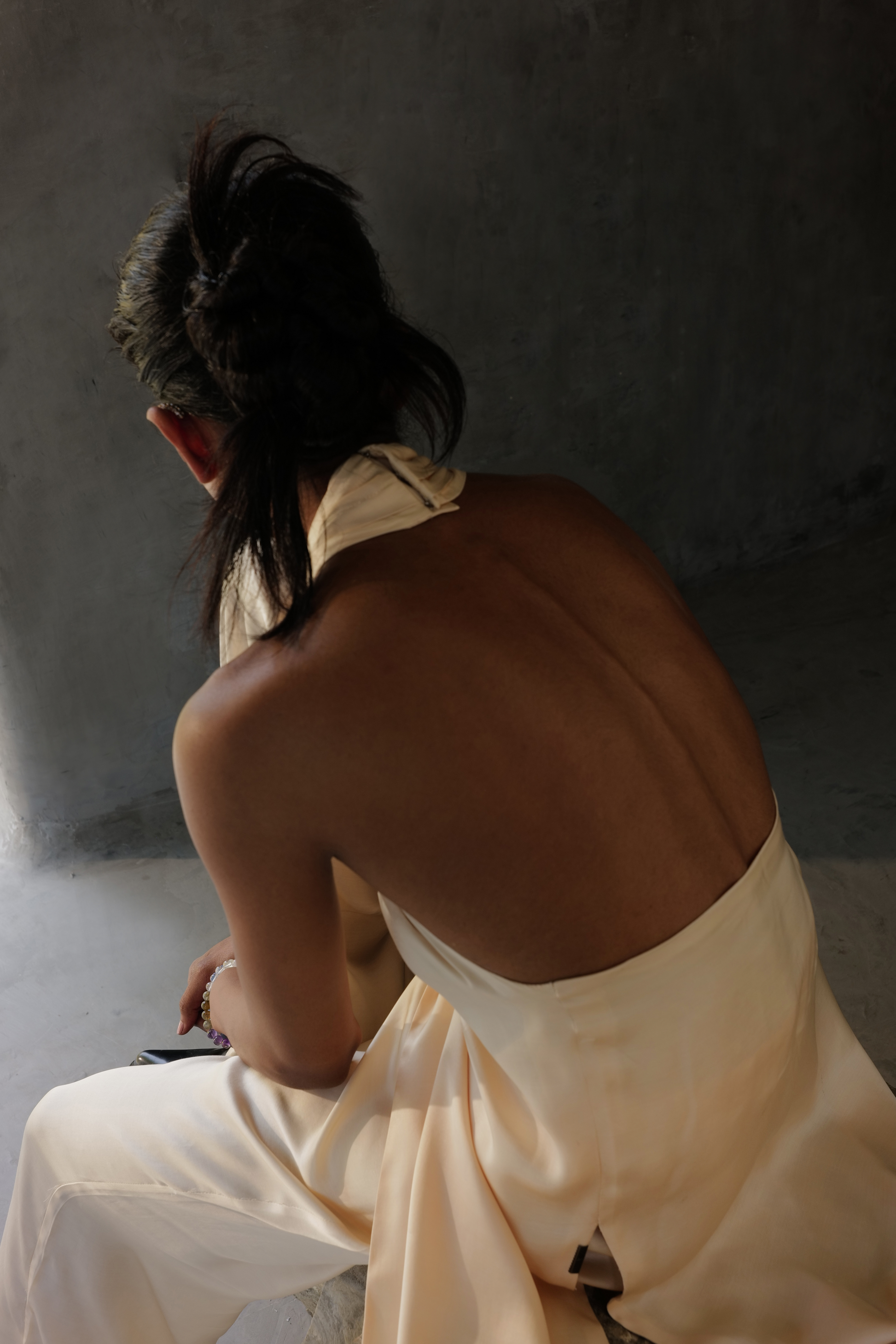 She feels young & vibrant, full of energy & possibility, as she walks around in this flowy outfit. The soft satin gently drapes around her figure, fluttering in the warm summer breeze, emboding a carefree spirit. The understated tie around neck with an exposed back makes her feel trendy & fashion forward as strolls along the beach.