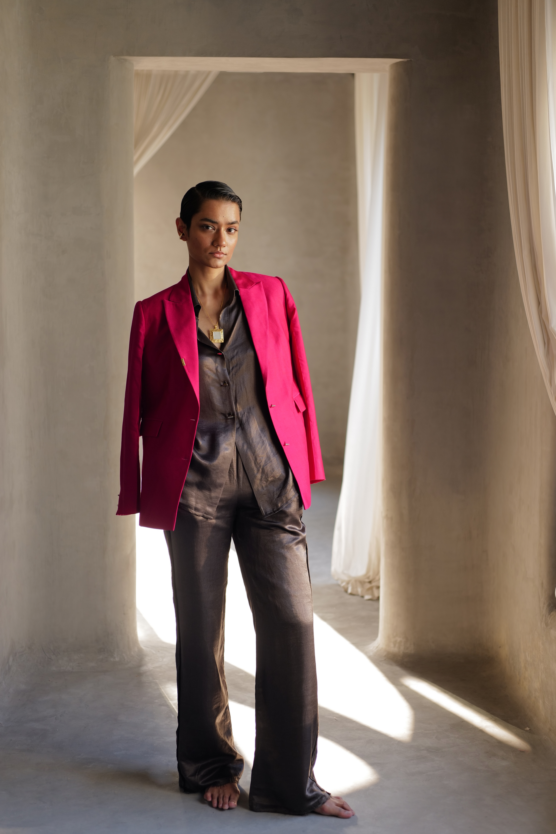 She looks utterly desirable as she makes her way through the crowd in the open-back satin co-ord. While the slinky satin accentuates all the right curves of her well toned body giving an alluring touch, the exposed back adds an element of surprise making it both trendy & daring. She knows she looks good, & carries herself effortlessly, drawing the admiring gazes of those around her.