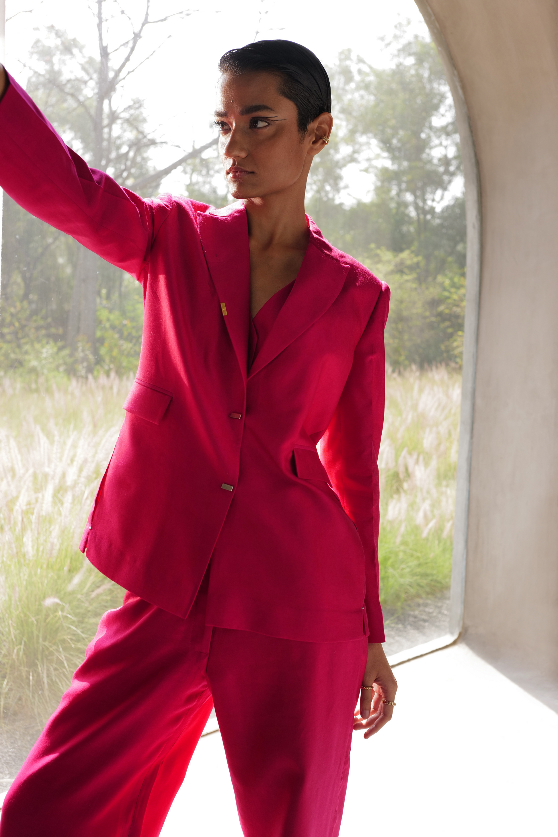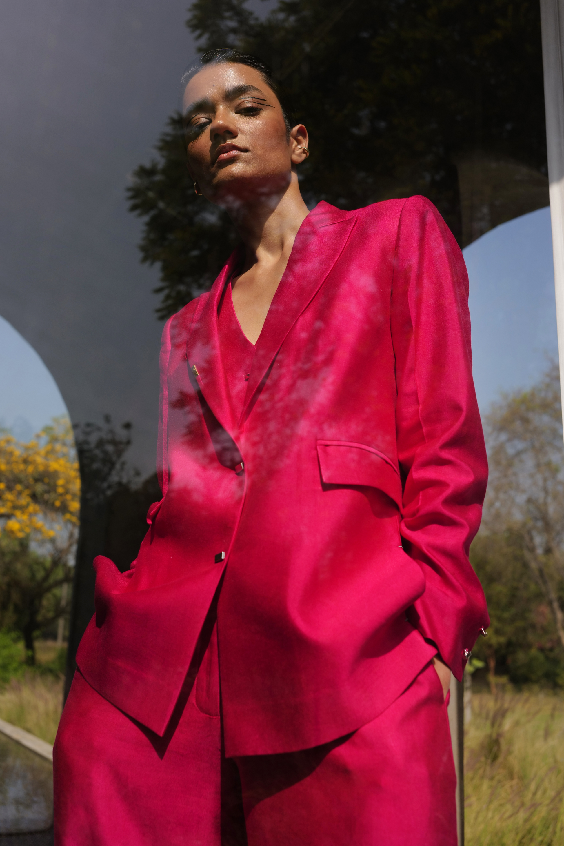 She is not afraid to speak her mind or to take charge of a situation, she feels like a force to be reckoned with in this well-tailored powersuit. The jacket is cut in a sharp, angular style that emphasizes her shoulders, giving her a commanding presence while the cropped waistcoat keeps it sexy, exposing her well toned abs. Her suit sends a message of professionalism, competence & authority as she feels ready to take on the world.