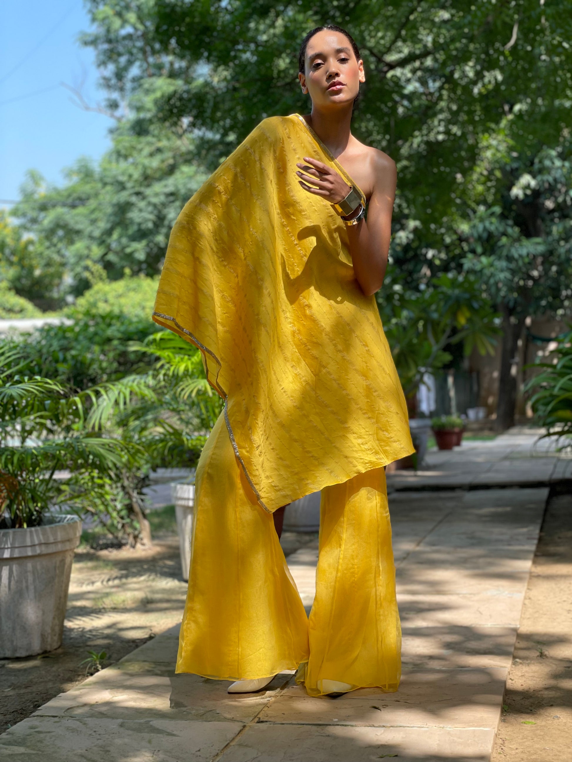 This Sunny Yellow One Shoulder Ensemble Is Feminine & Modern. The Embellished Neckline & Hem Makes It Dressy Enough For A Pre Wedding Party Or A Large Gathering. Recommend Pairing It With Dangling Earrings & A Delicate Bracelette